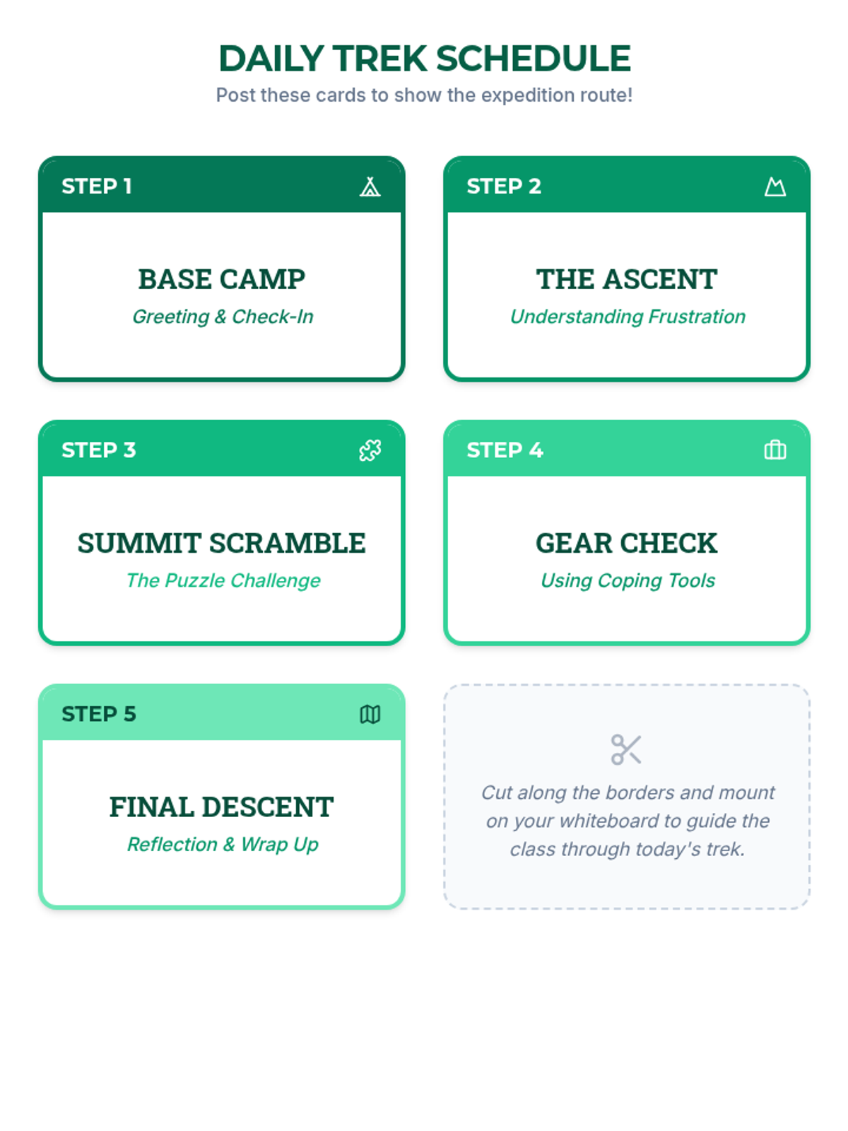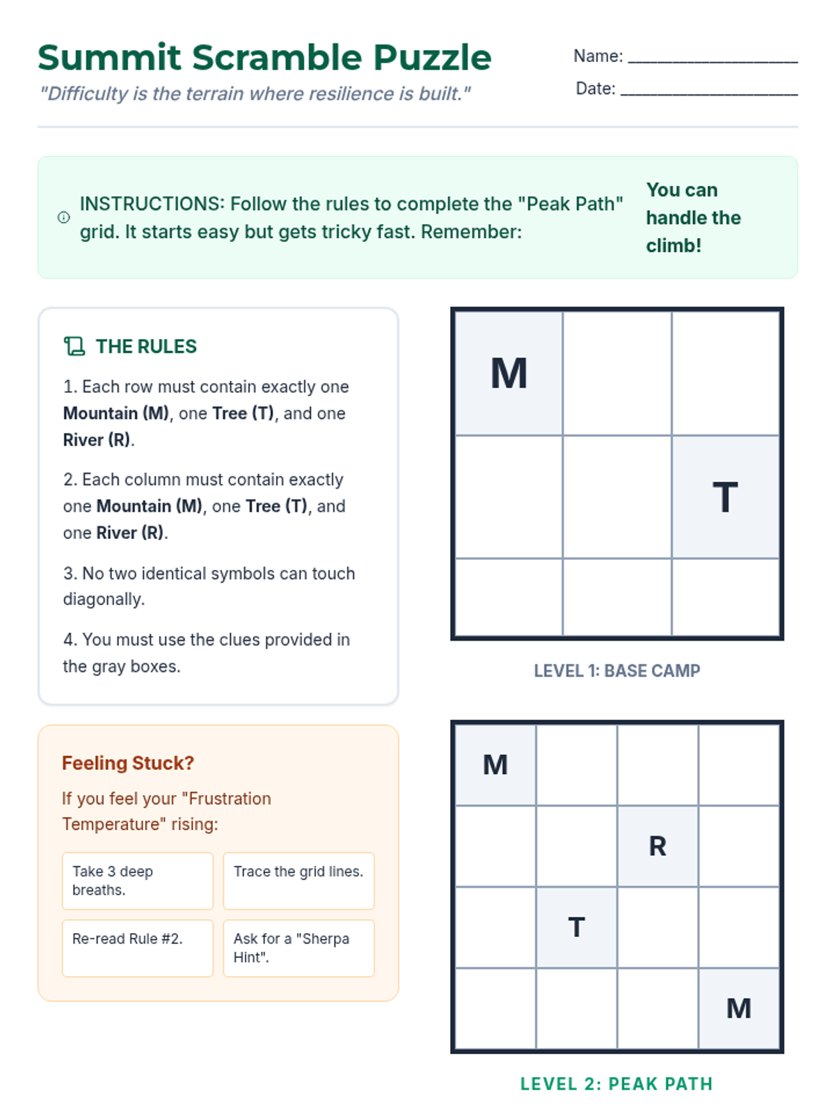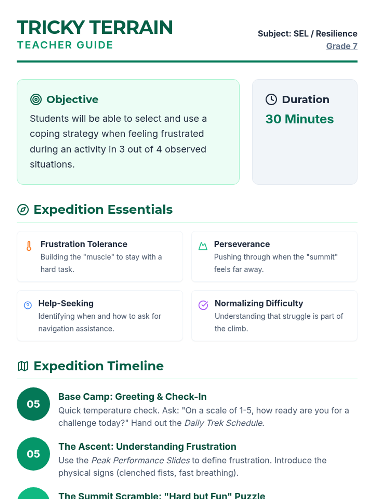 A 30-minute SEL lesson for 7th graders focused on identifying frustration and applying coping strategies when tasks become difficult. Students engage in a challenging puzzle activity to practice real-time emotional regulation and help-seeking behaviors.