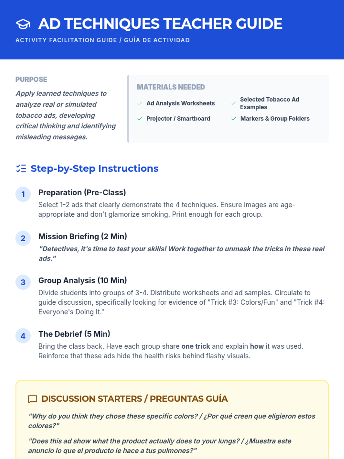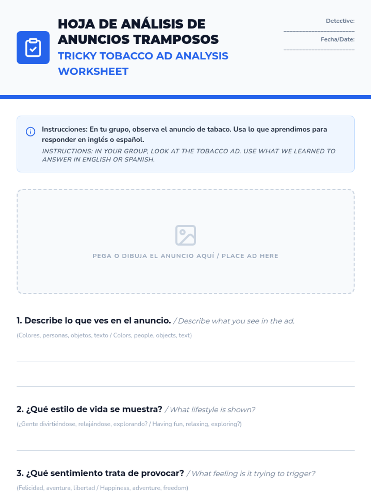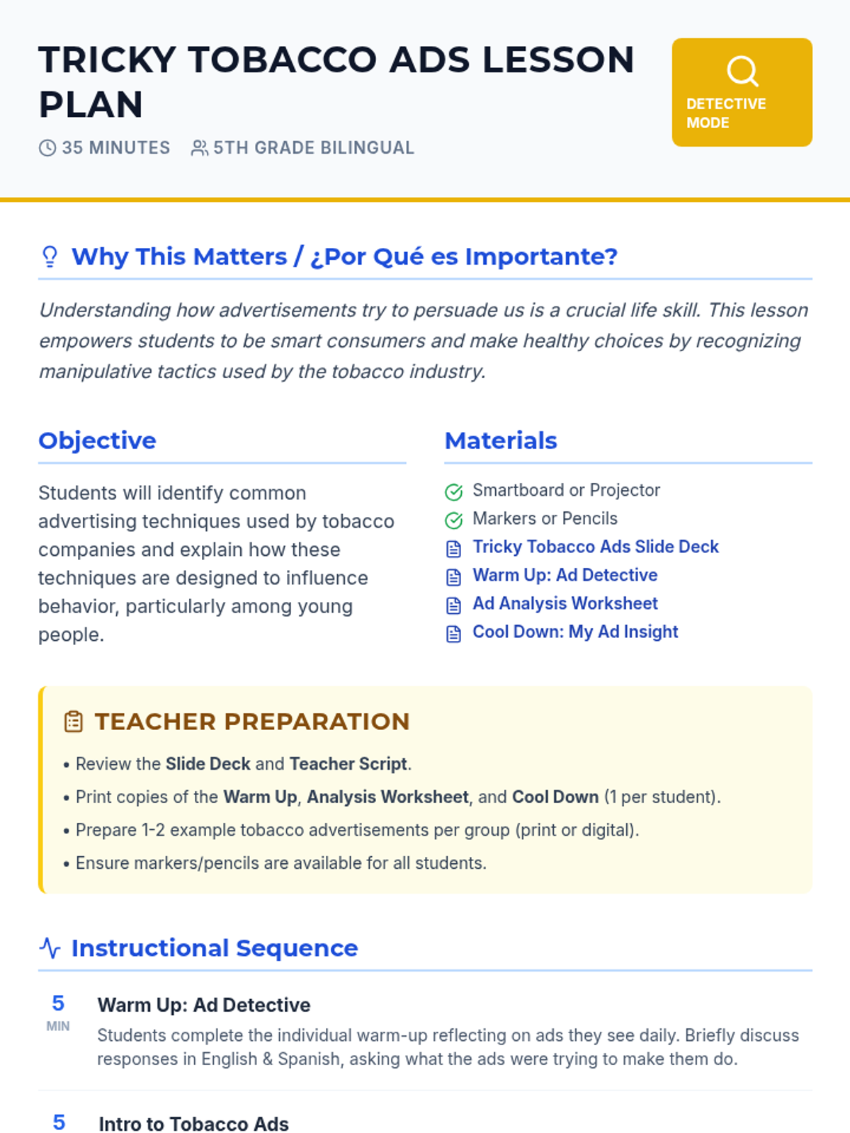 A 35-minute bilingual lesson for 5th graders focused on identifying and analyzing manipulative advertising techniques used by the tobacco industry. Students become 'Ad Detectives' to uncover how ads use emotions, 'cool' people, and bright colors to target young consumers.