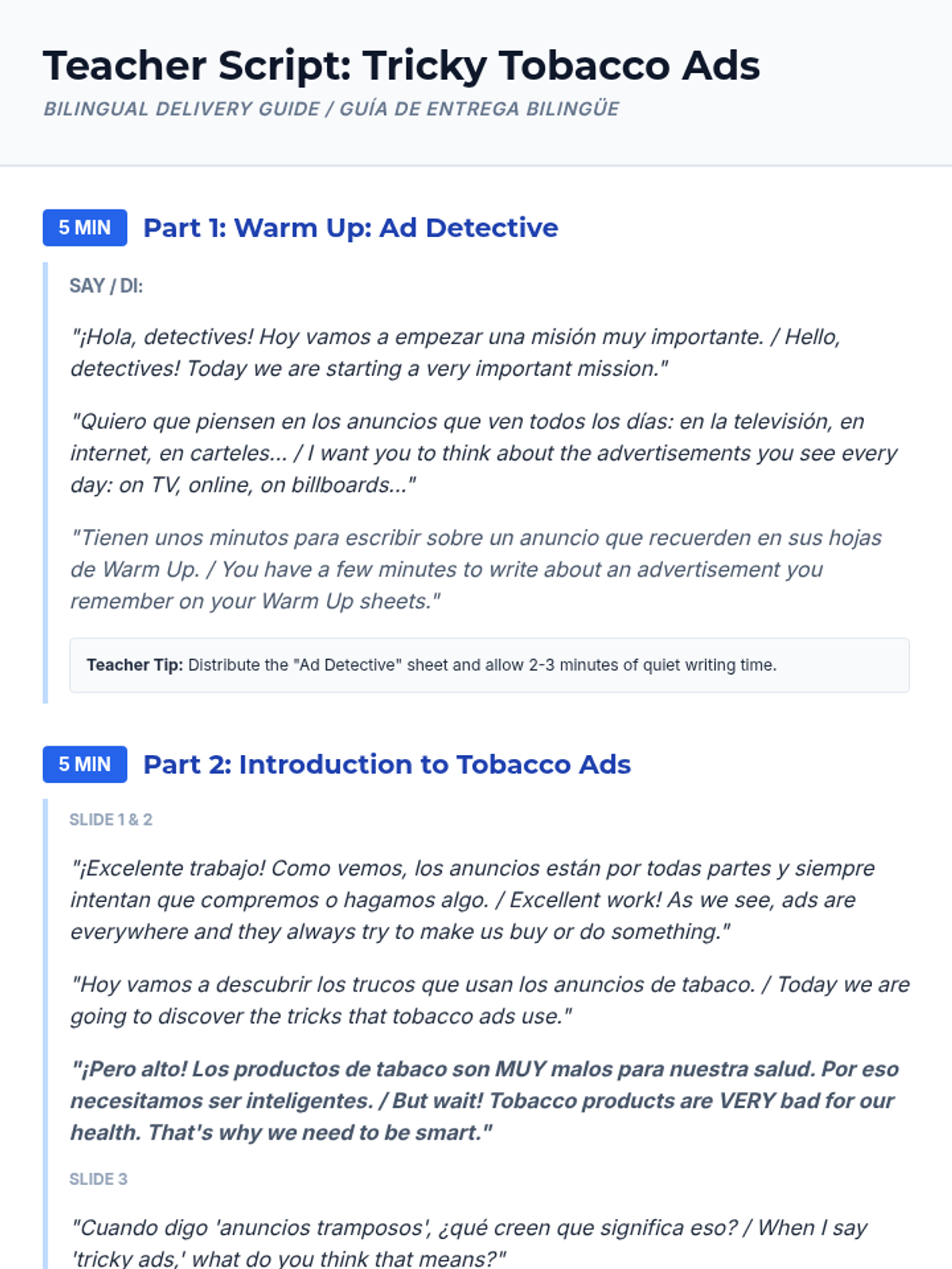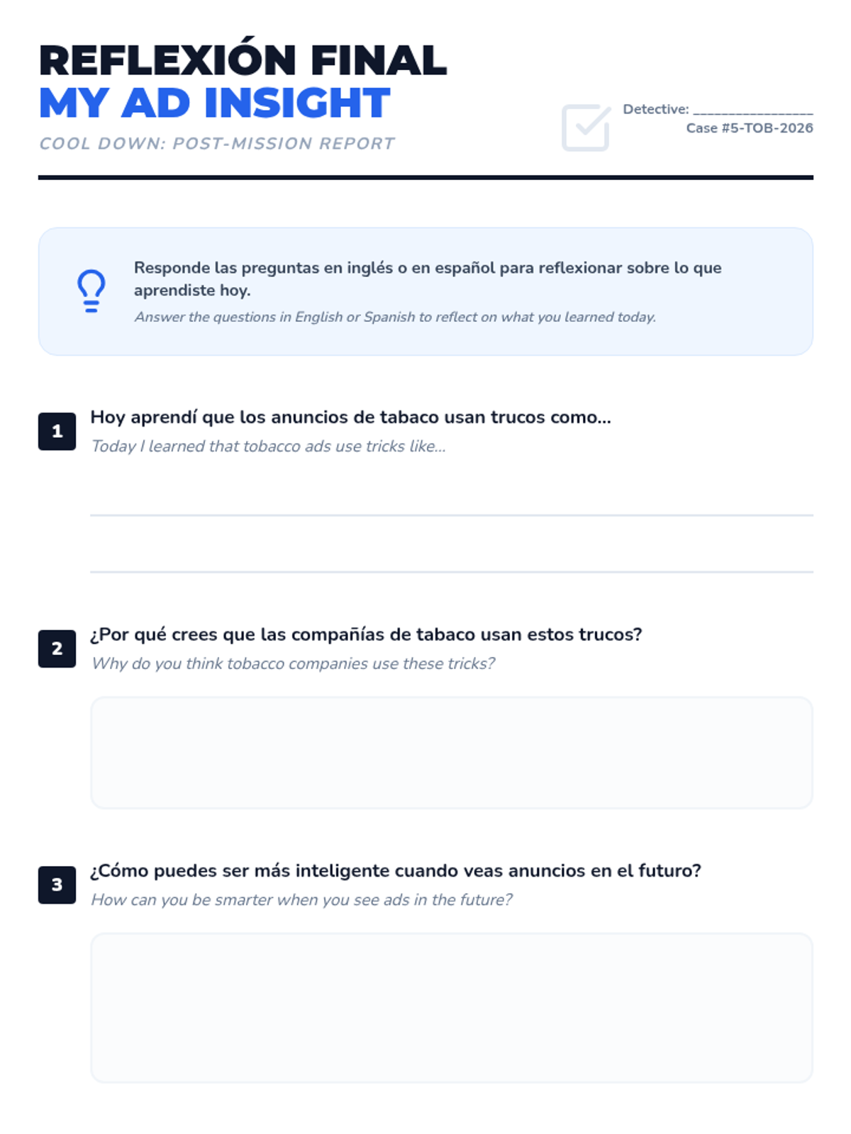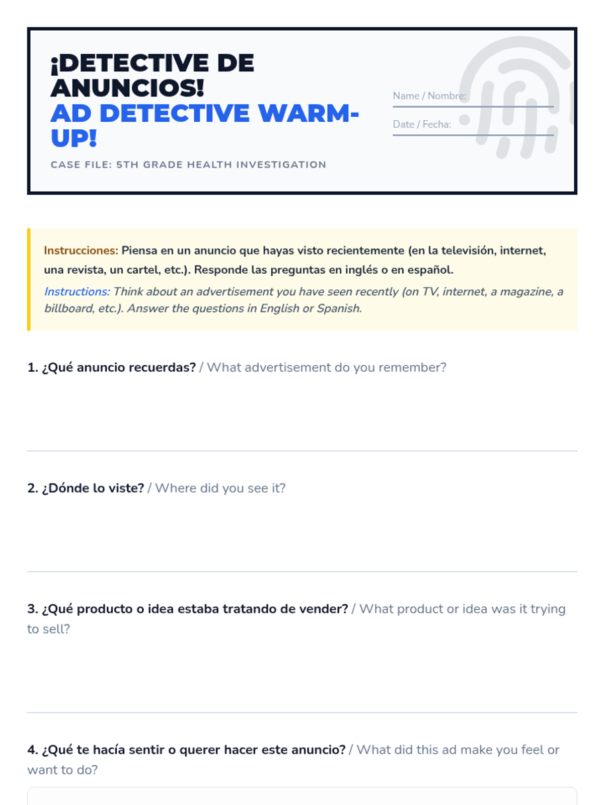 A 35-minute bilingual lesson for 5th graders focused on identifying and analyzing manipulative advertising techniques used by the tobacco industry. Students become 'Ad Detectives' to uncover how ads use emotions, 'cool' people, and bright colors to target young consumers.