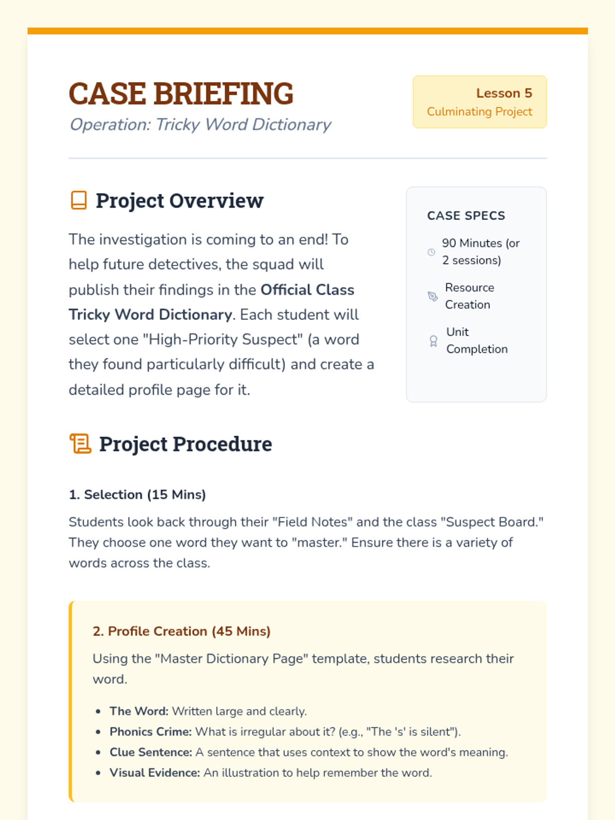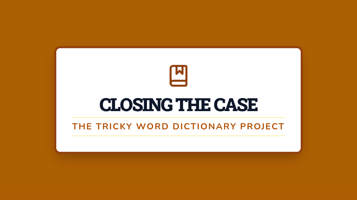 The investigation concludes with students publishing their findings in a collaborative class 'Tricky Word Dictionary' to help future detectives.