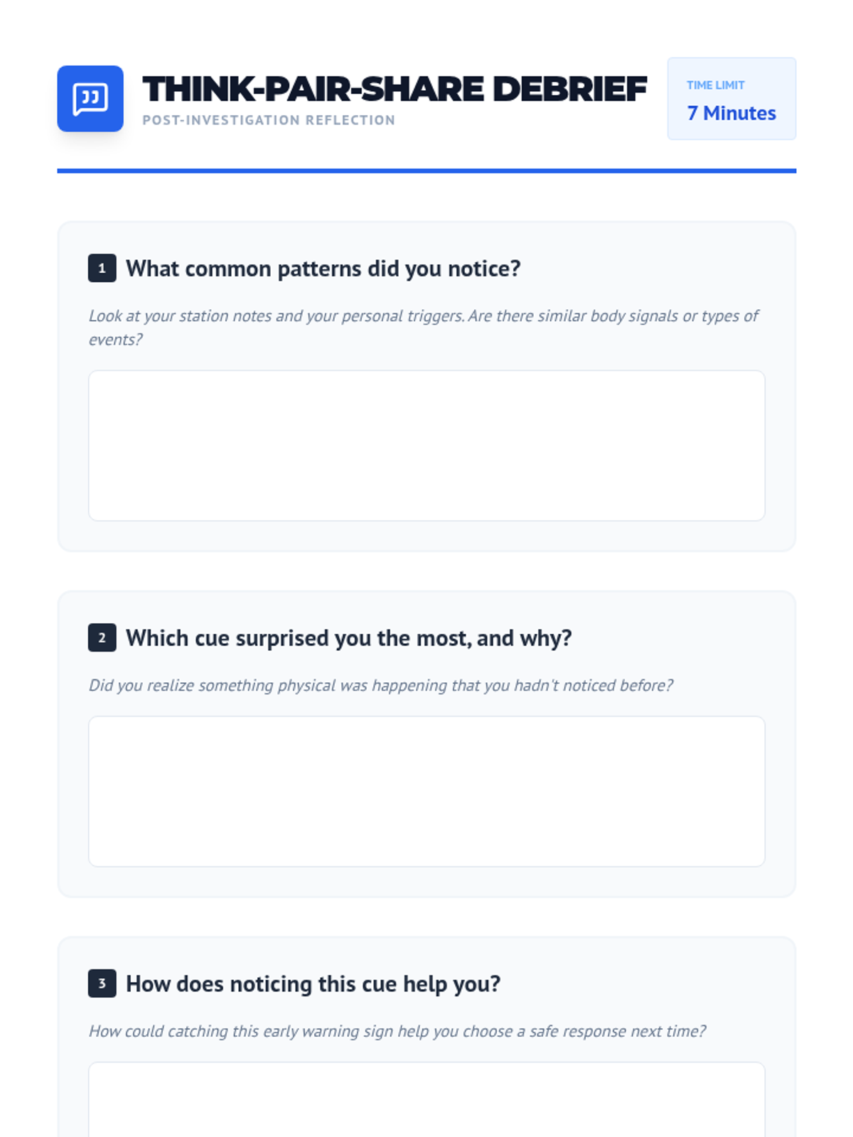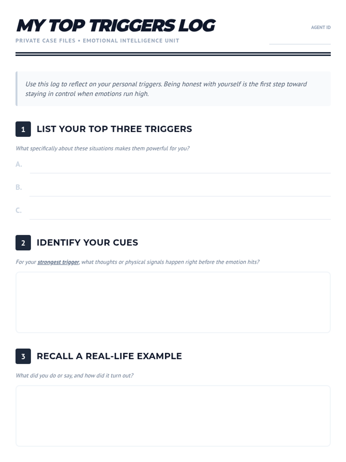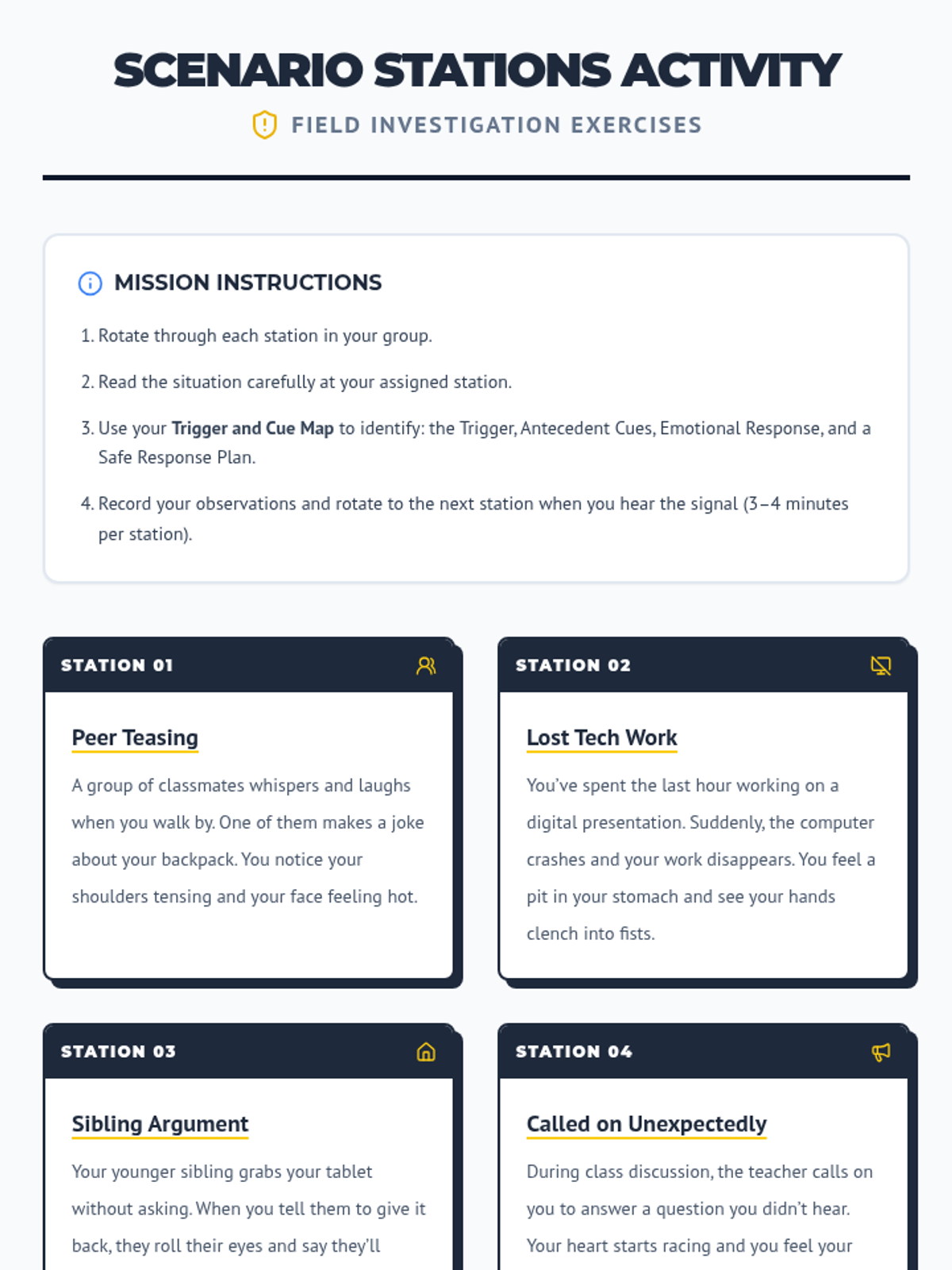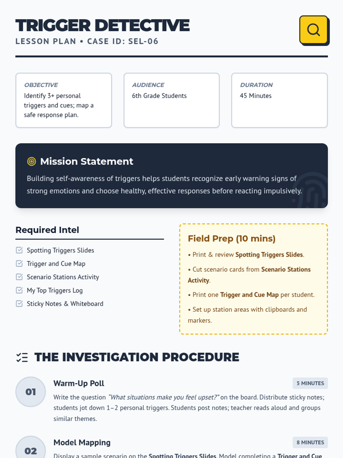 A 6th-grade SEL lesson where students become emotional detectives to identify personal triggers, recognize early warning signs (cues), and plan healthy responses.