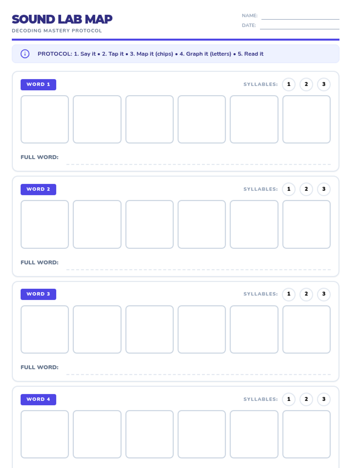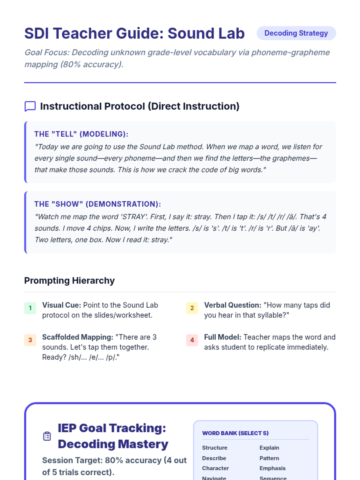 A direct instruction lesson focused on phoneme-grapheme mapping to help students decode grade-level vocabulary. This lesson provides a structured "Sound Lab" approach to breaking down unknown words into their individual sounds and corresponding letters.