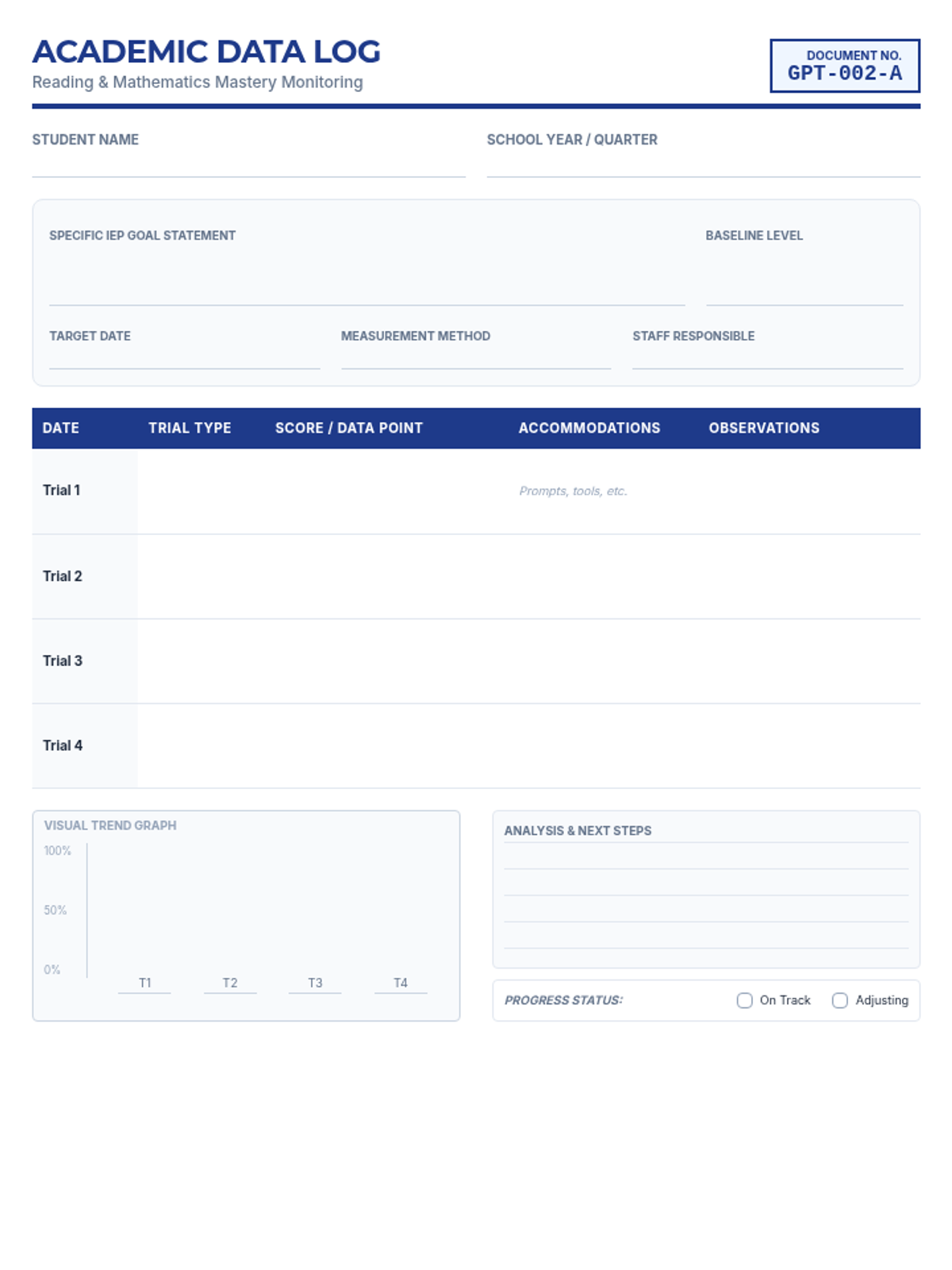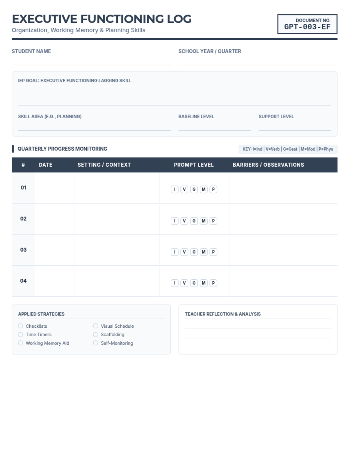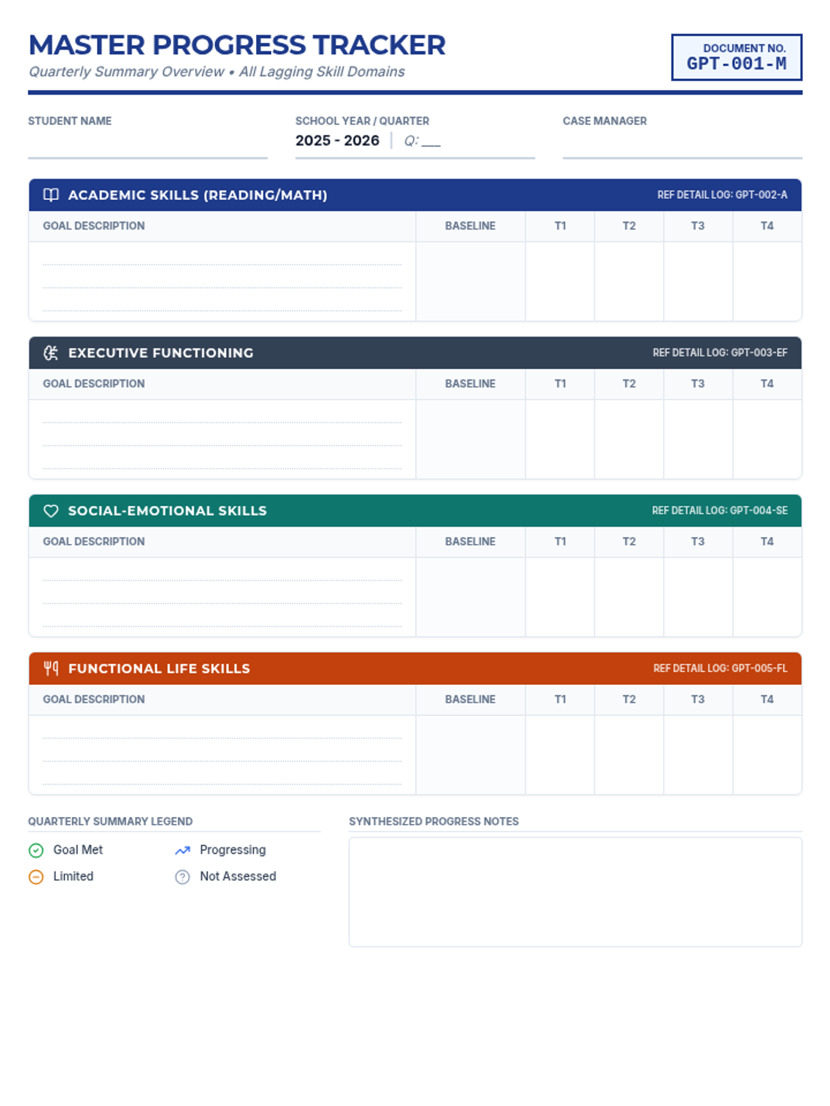 A comprehensive system for tracking IEP progress across multiple lagging skills, including a master overview and specialized data logs for Academic, Executive Functioning, Social-Emotional, and Functional Life Skills.