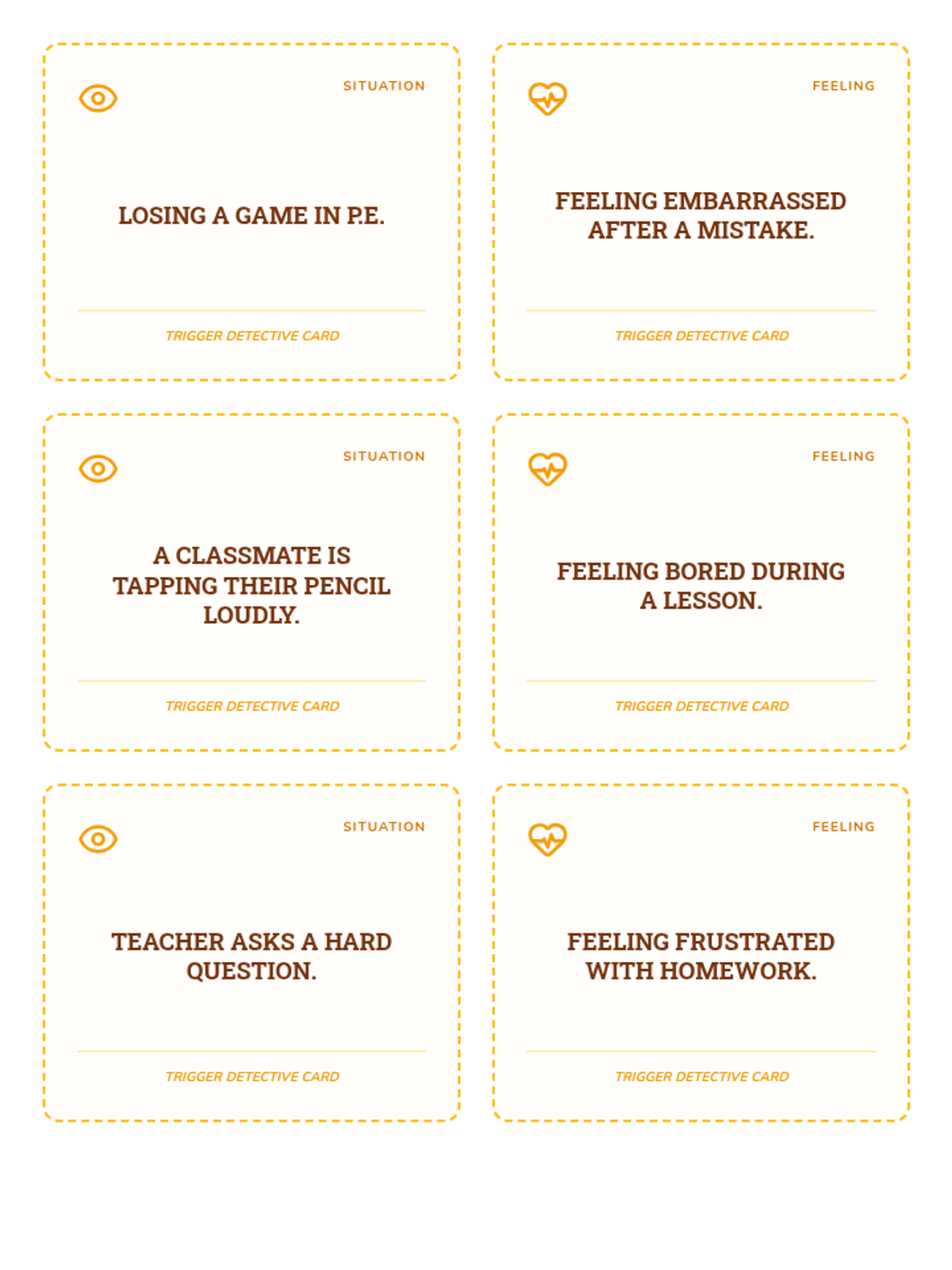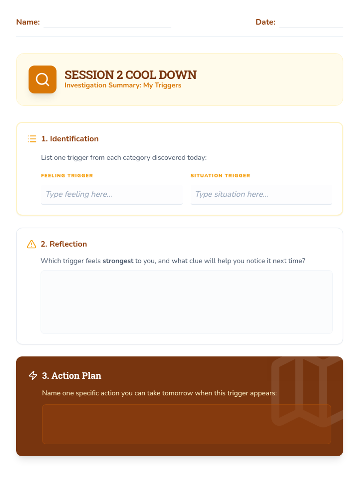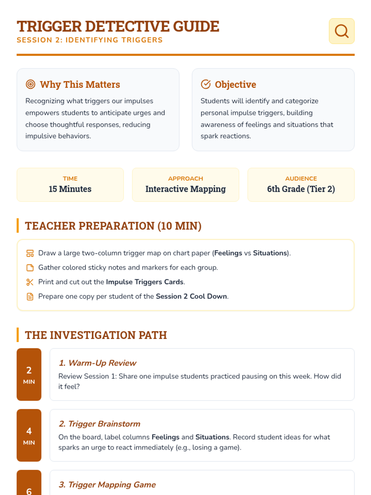 Students identify feelings and situations that trigger impulsive reactions, creating a personal 'trigger map'.