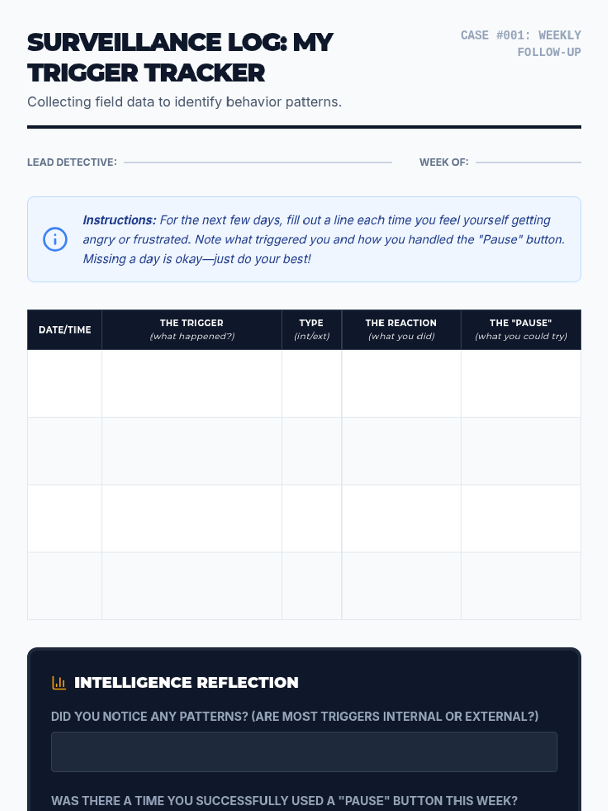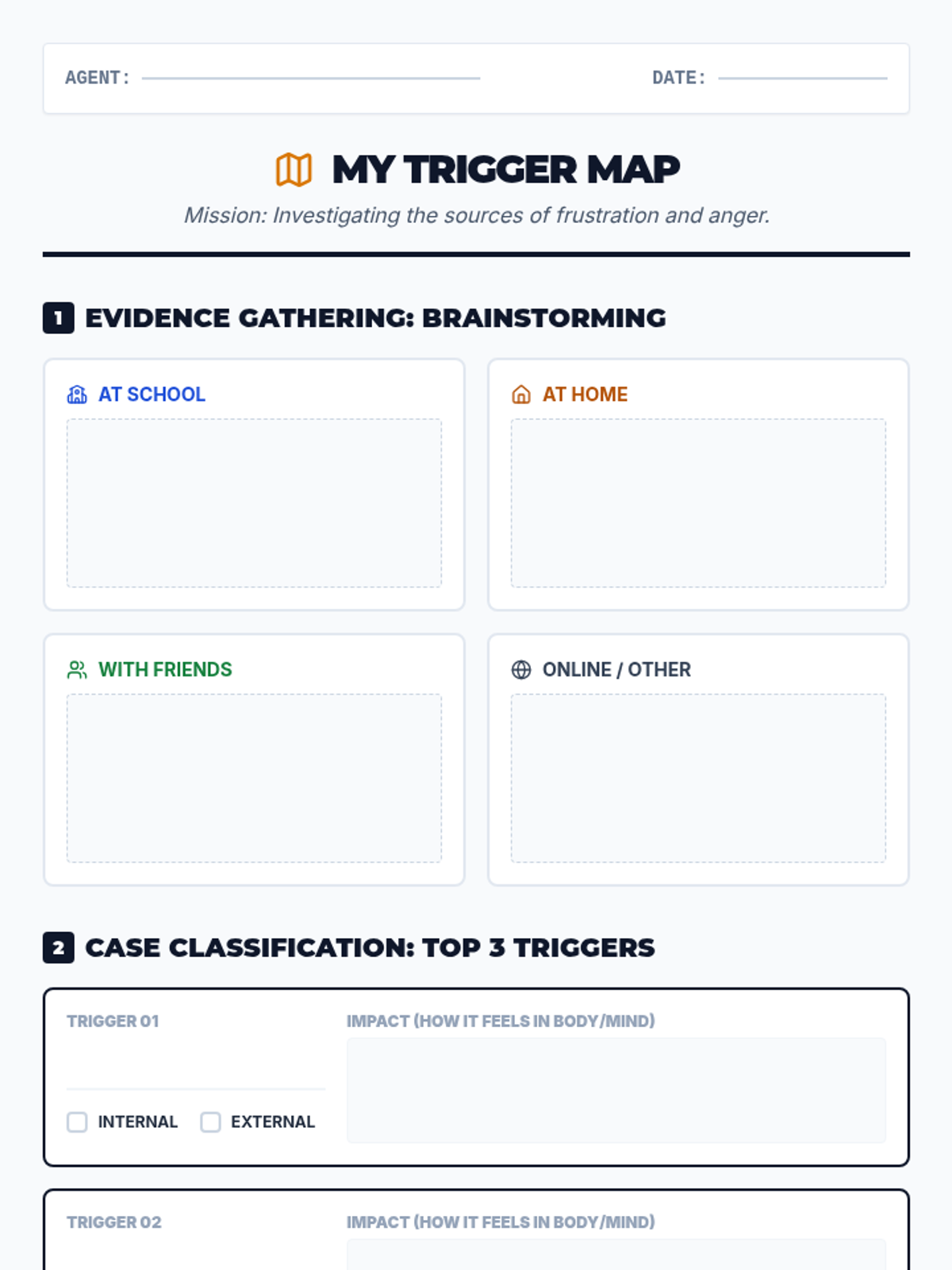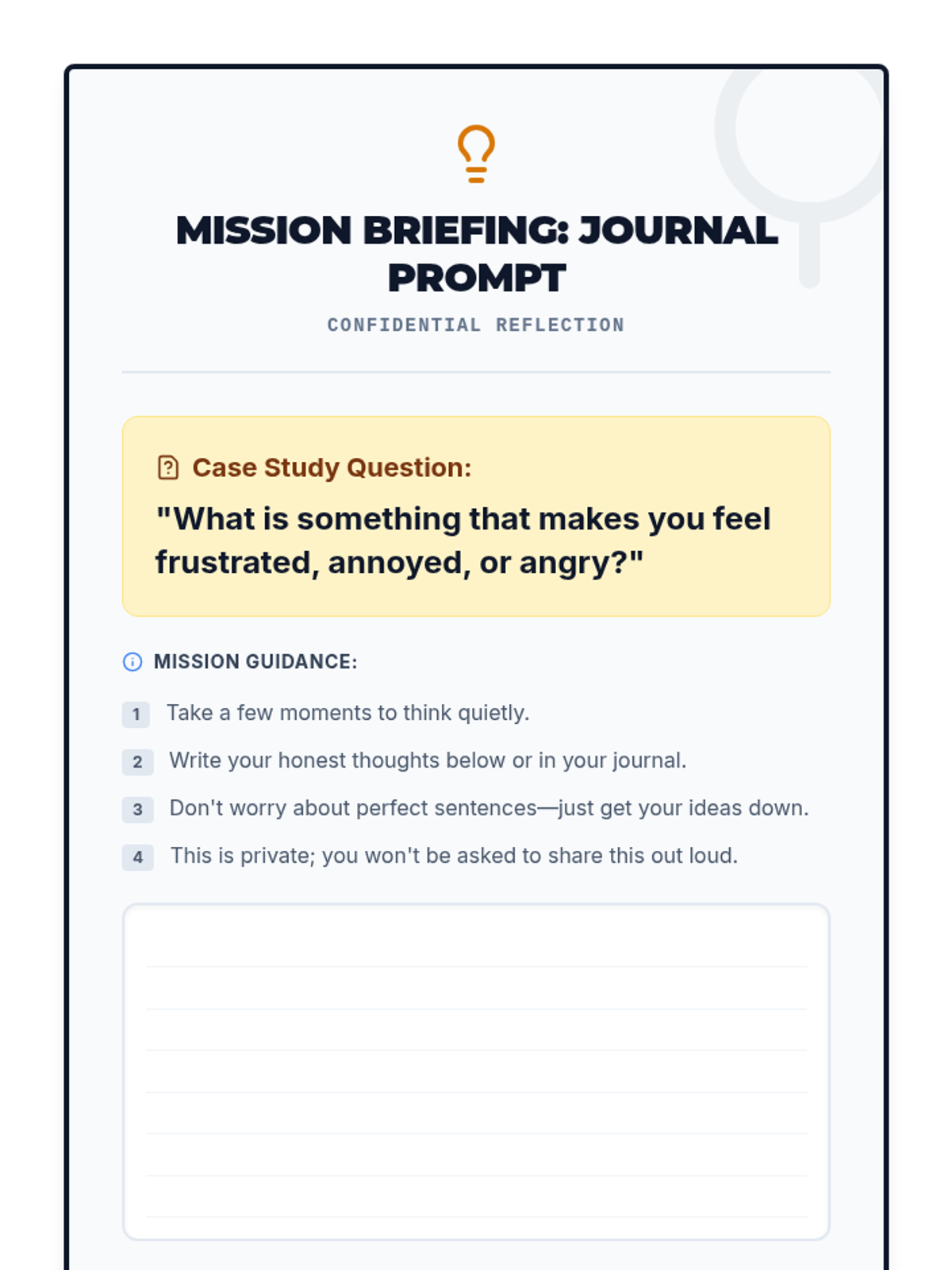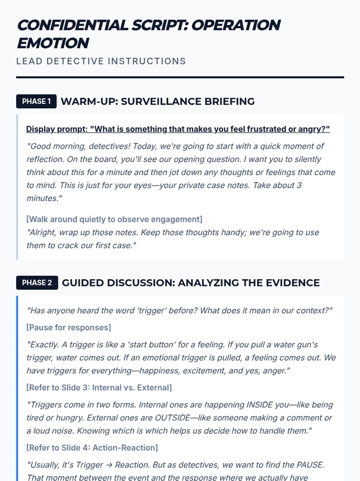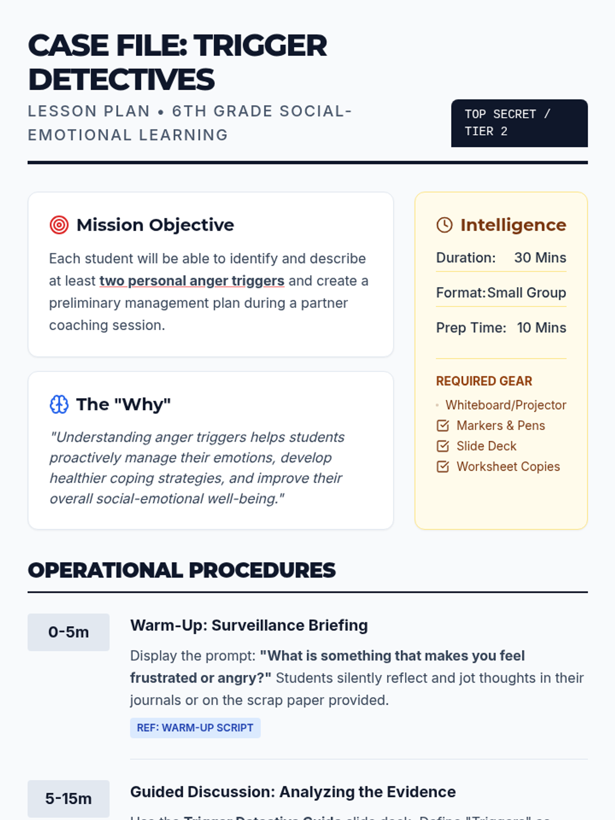 A 30-minute Tier 2 small group lesson for 6th graders to identify personal anger triggers and develop proactive management strategies using a detective-themed approach.