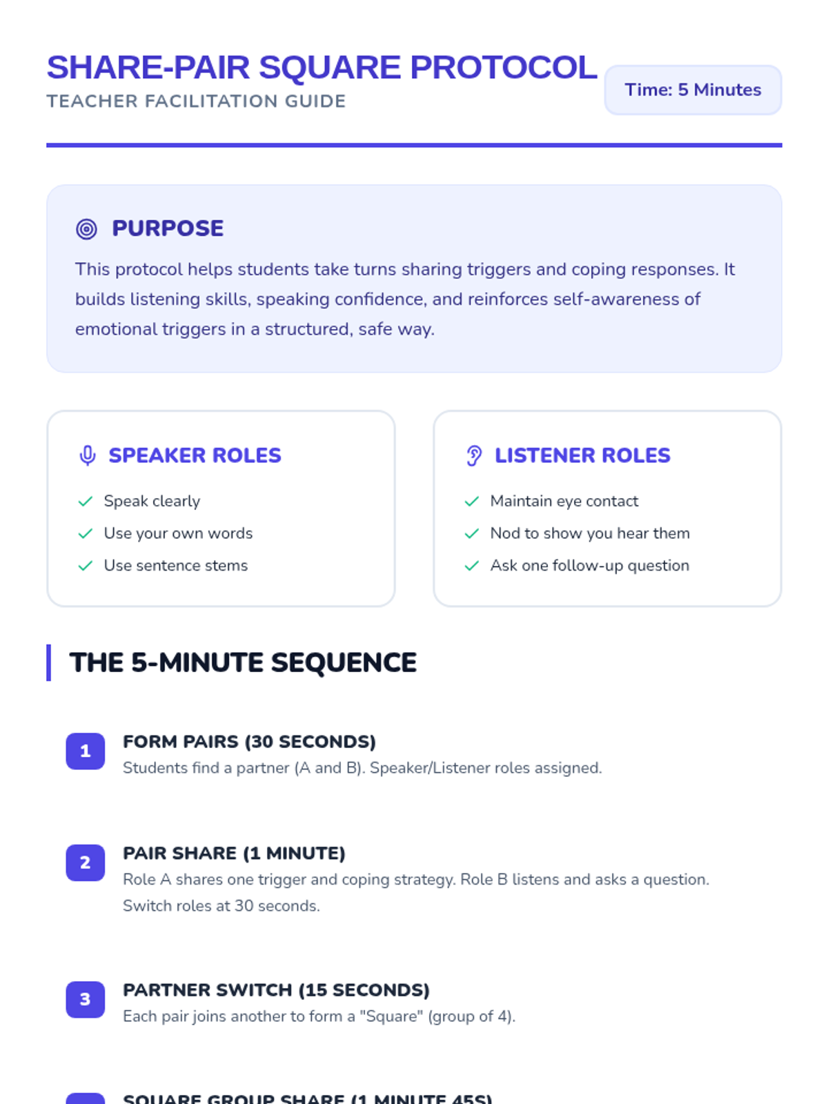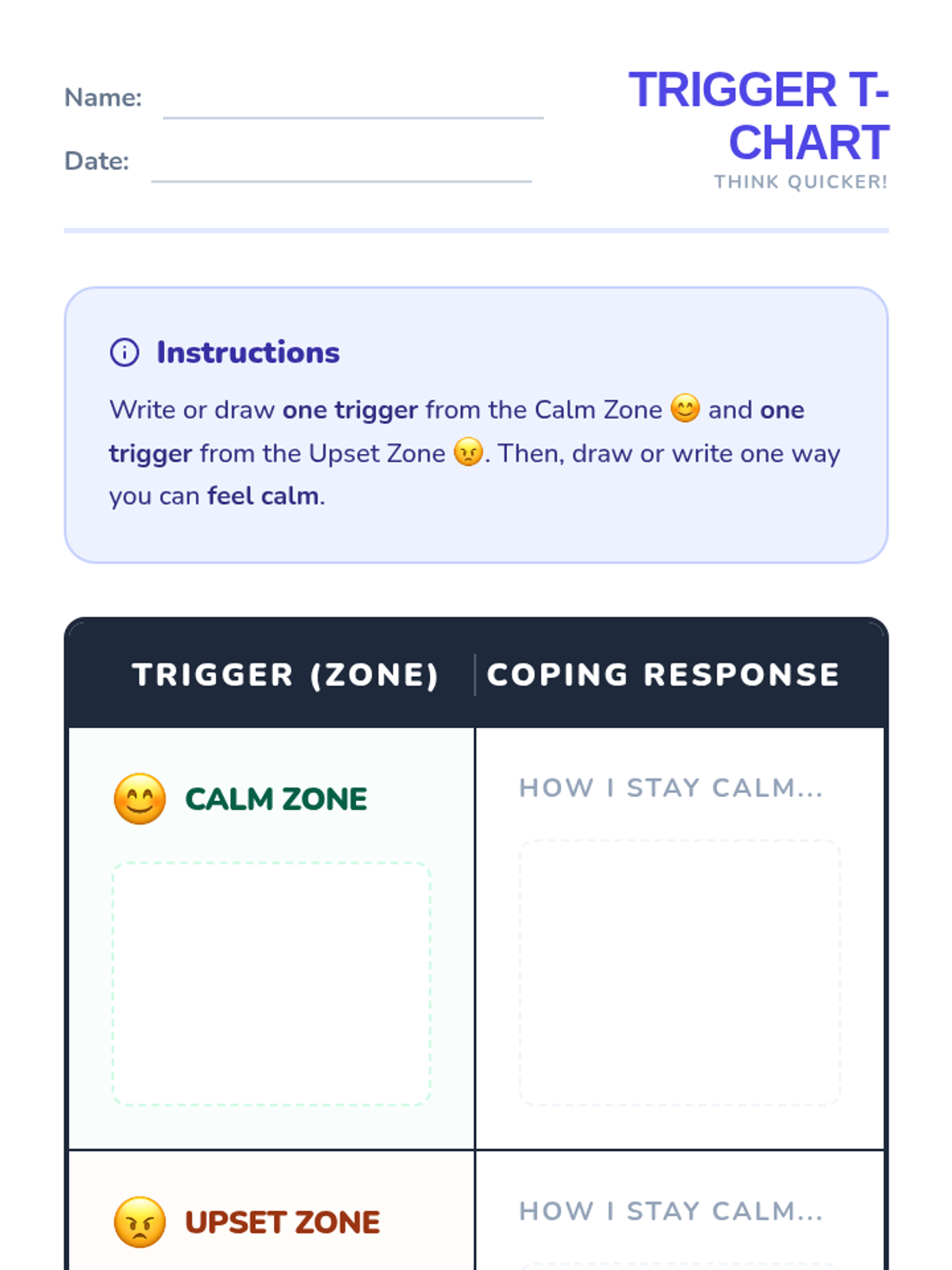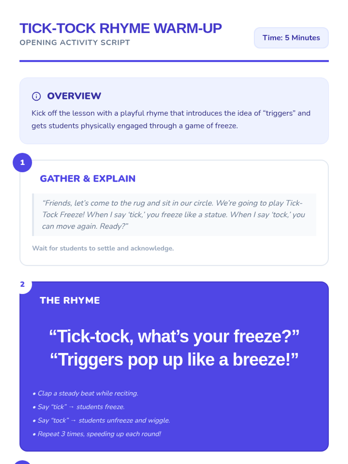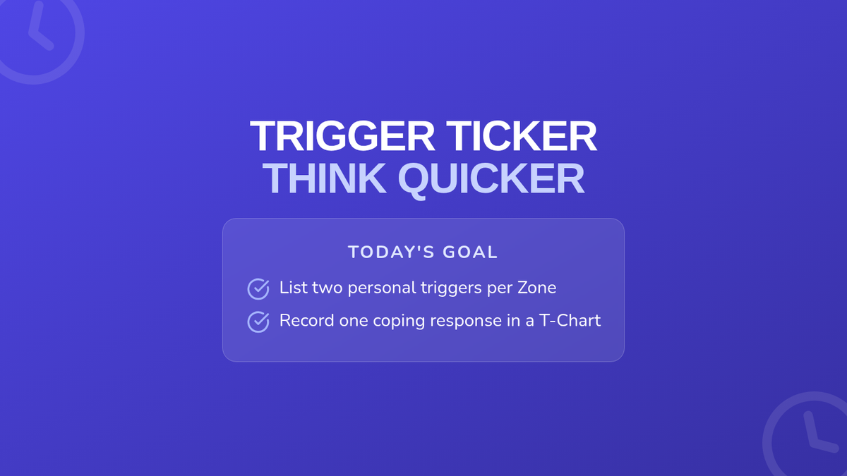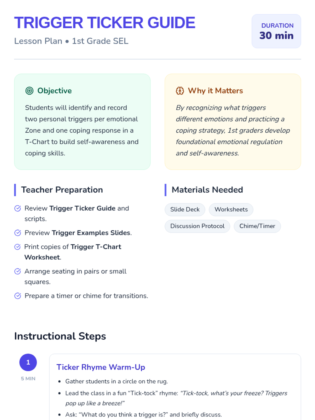In this 30-minute 1st grade lesson, students identify personal triggers across emotional Zones and record them alongside coping strategies in a T-chart format. Through rhythmic warm-ups and structured sharing, students build self-awareness and emotional regulation skills.