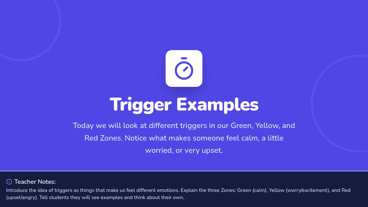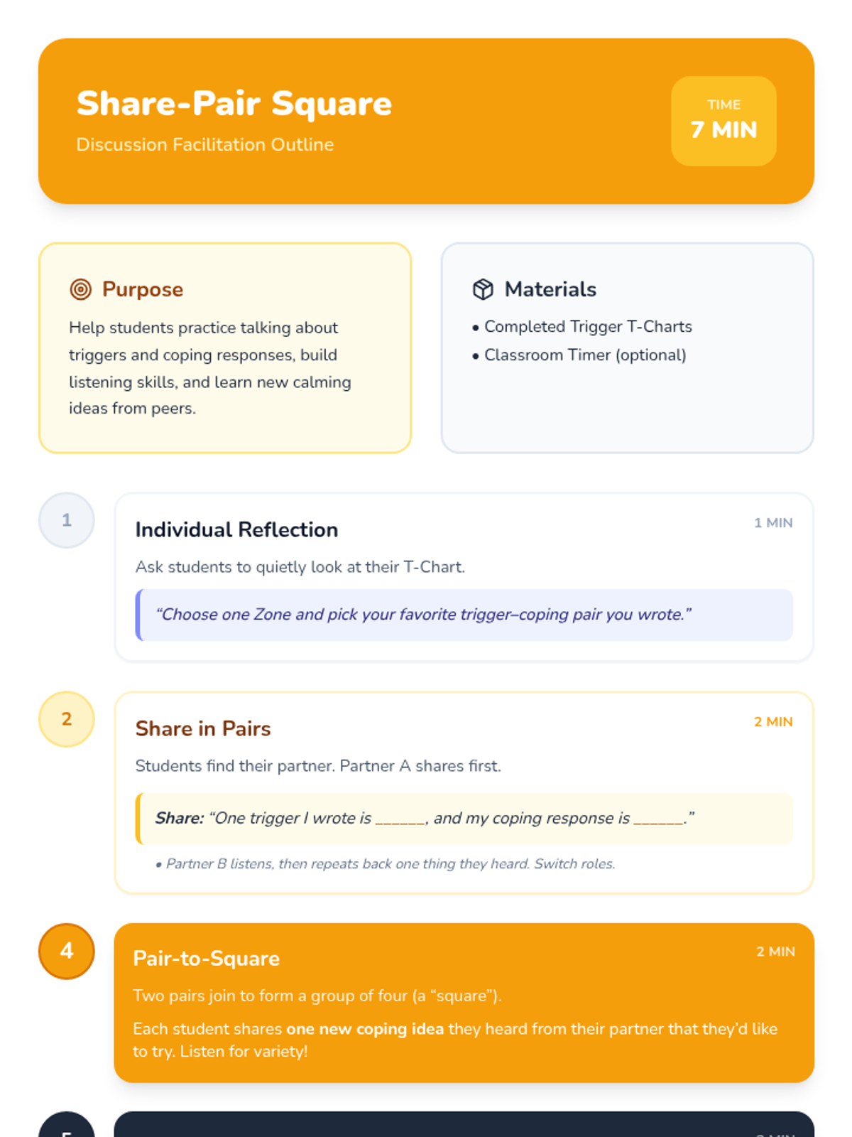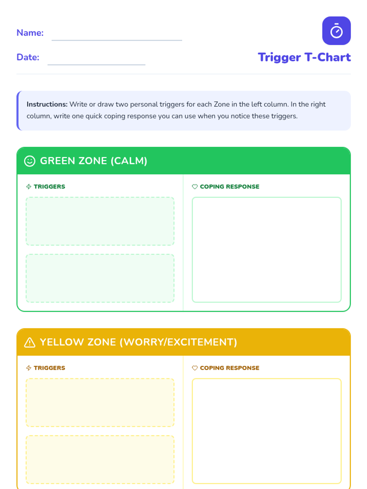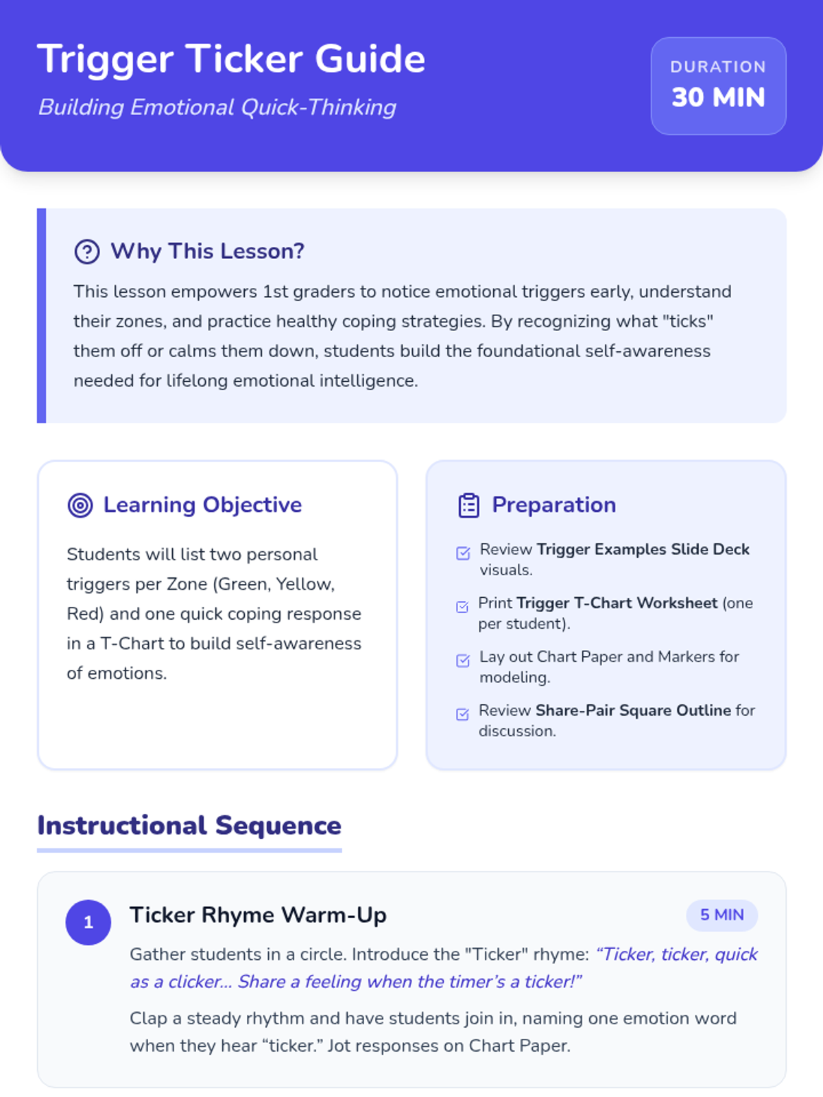 A 30-minute 1st-grade lesson where students identify personal triggers for their Green, Yellow, and Red emotional zones and develop quick coping responses. Students use a T-chart to map their triggers to healthy strategies, building early self-awareness and emotional regulation.