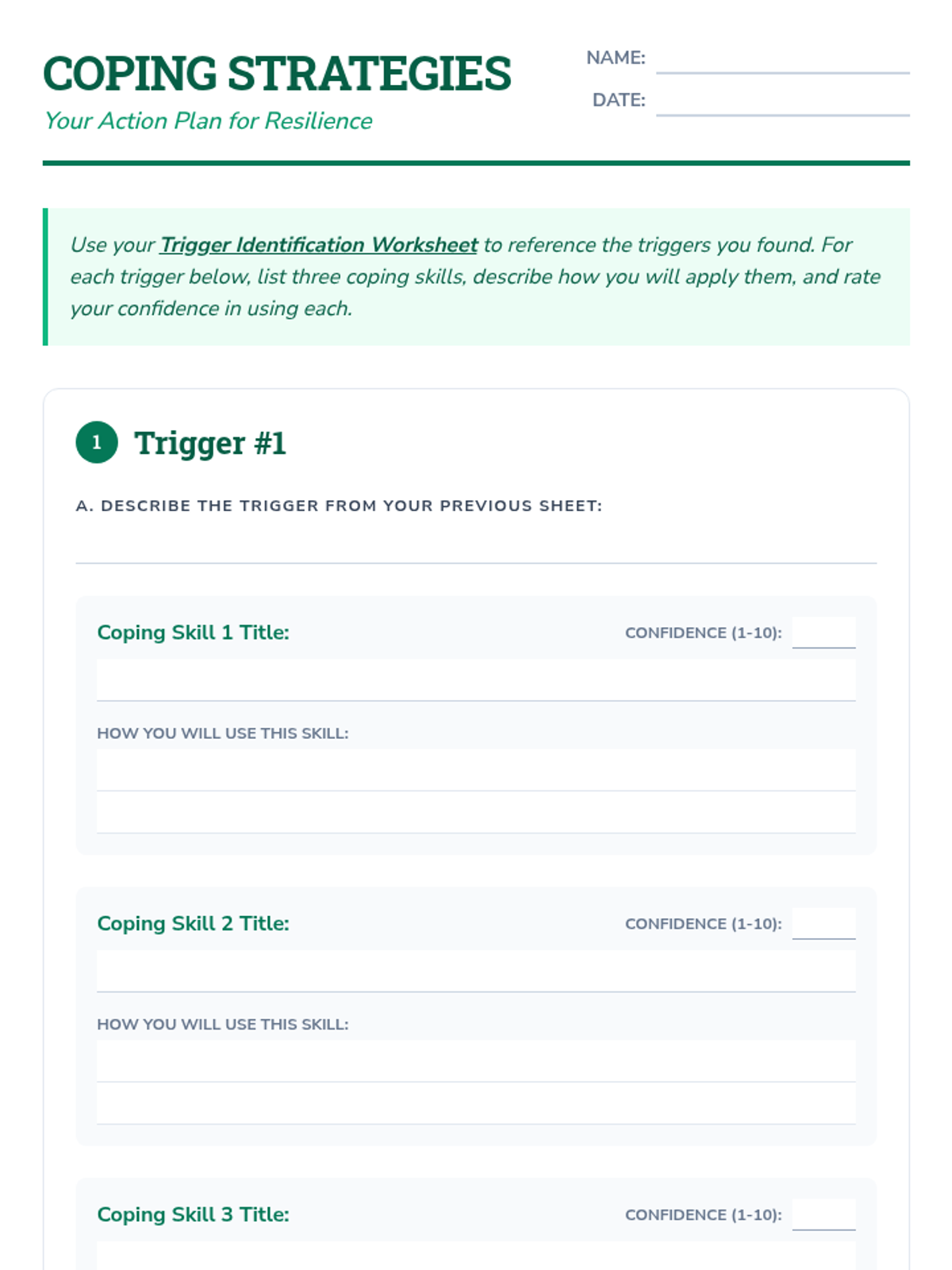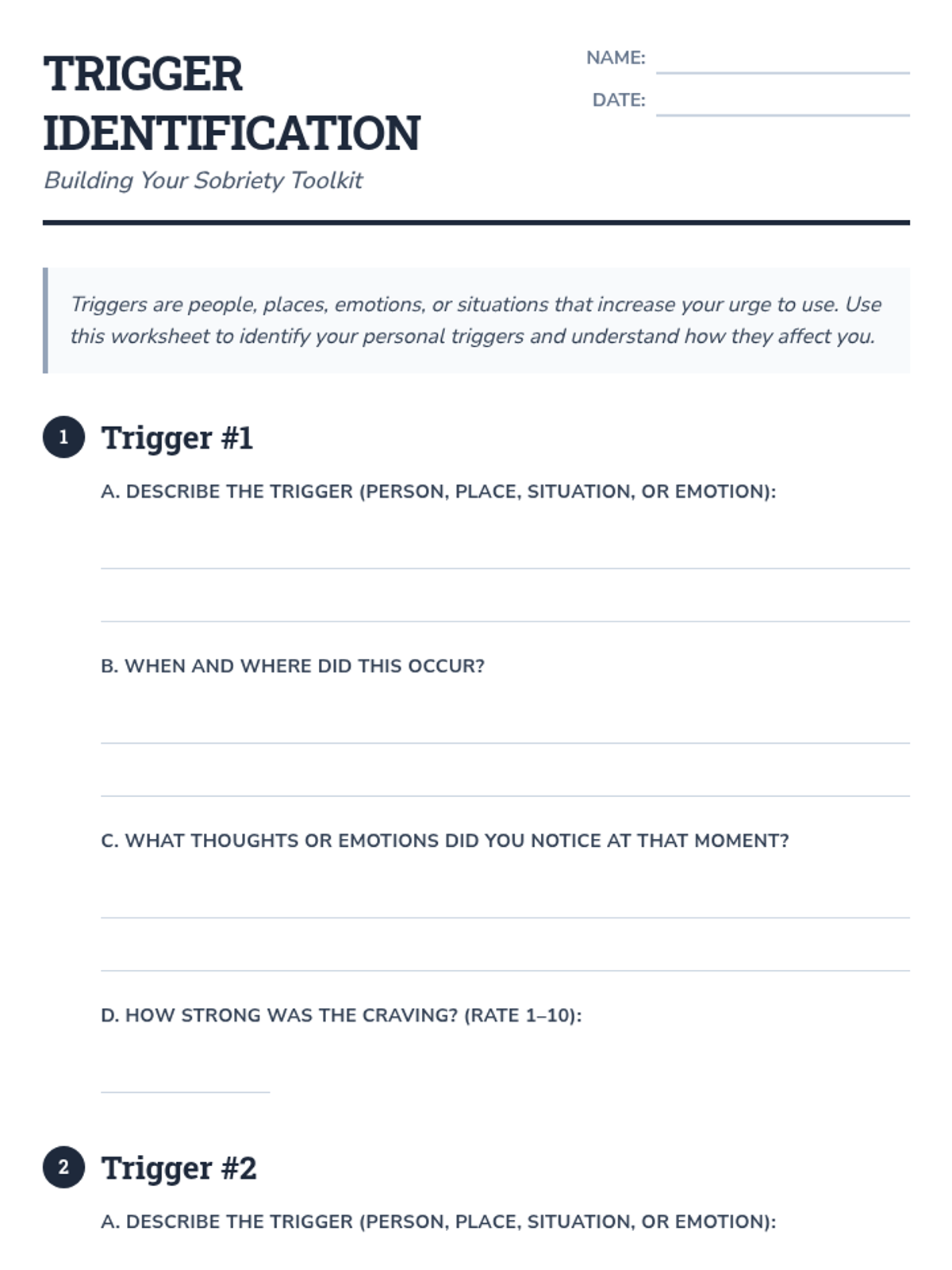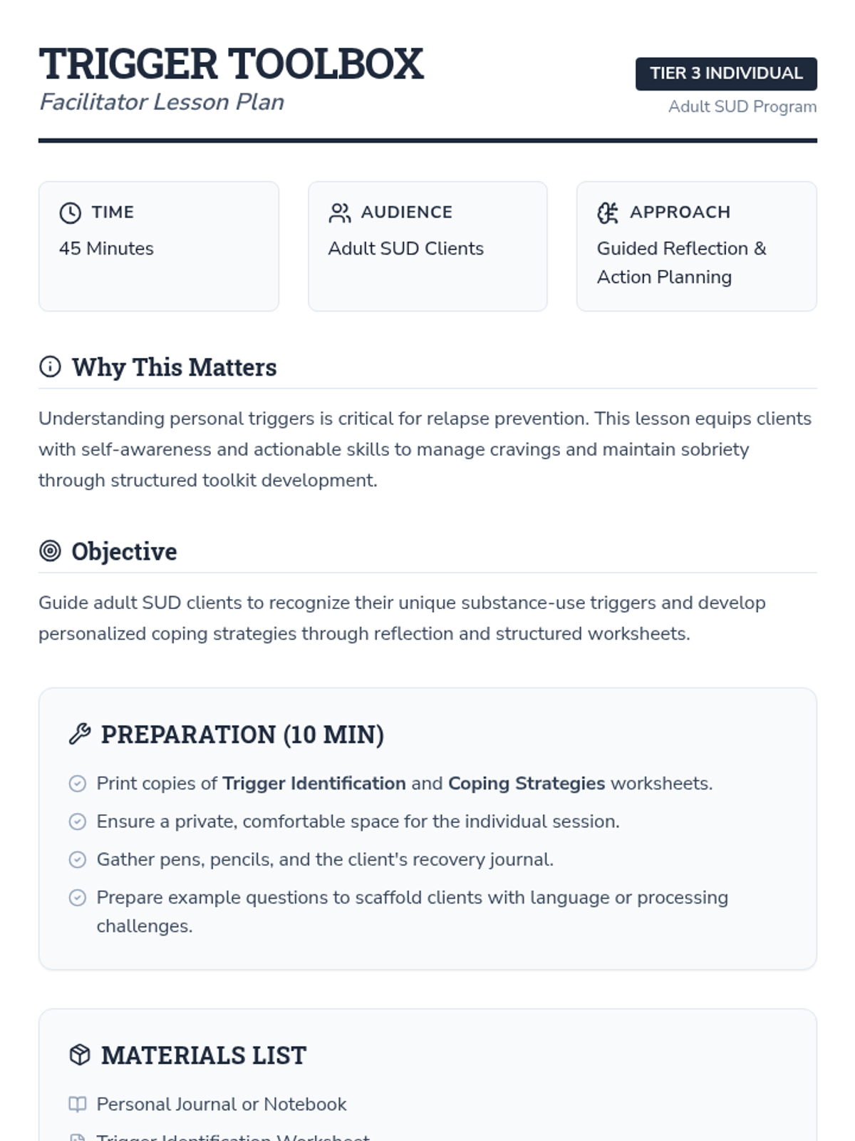 A 45-minute individual Tier 3 lesson for adult SUD clients focusing on identifying personal triggers and developing customized coping strategies to prevent relapse.