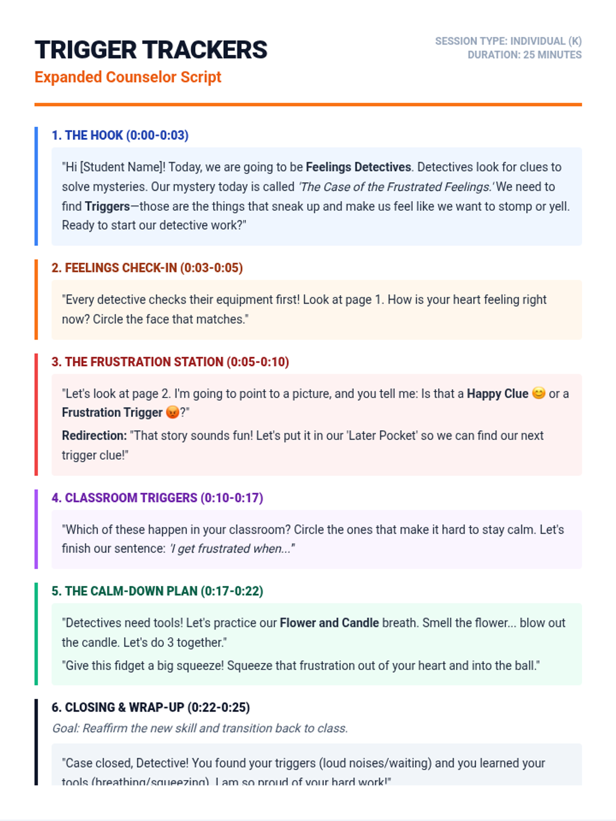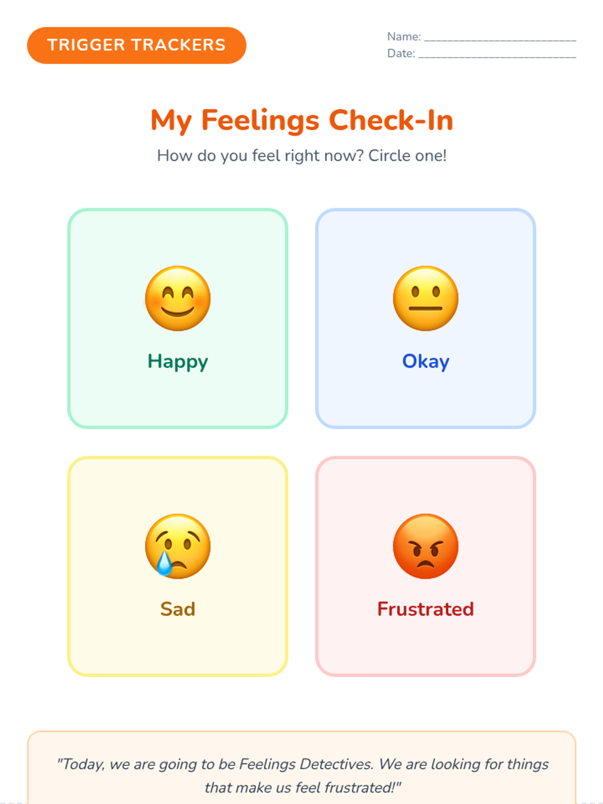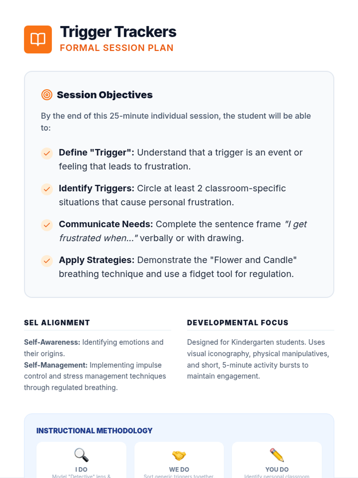 A social-emotional learning session designed for kindergarteners to identify frustration triggers and practice initial coping strategies through interactive sorting and visual guides.