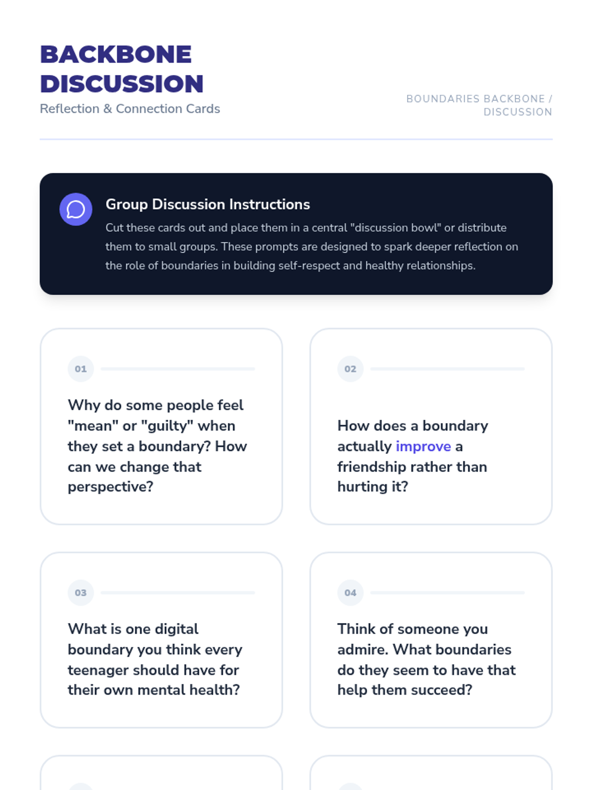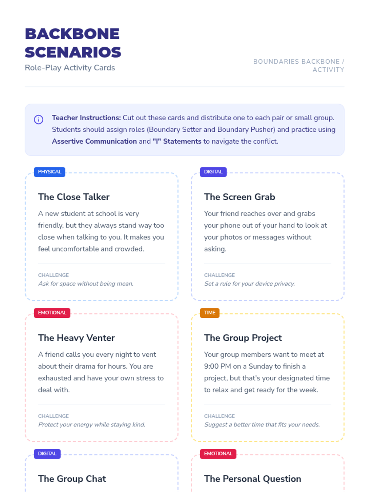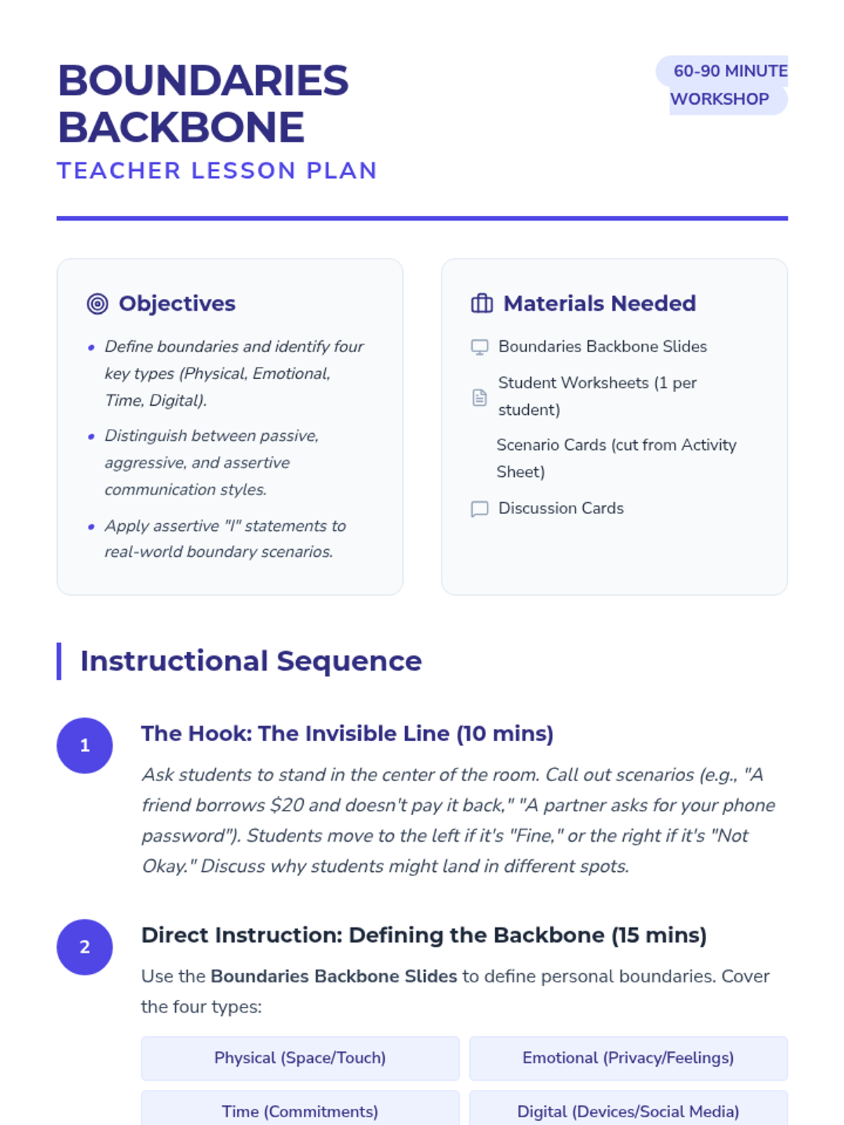 A comprehensive workshop for high schoolers on identifying and communicating personal boundaries. Includes role-playing scenarios and reflection tools to build assertive communication skills.