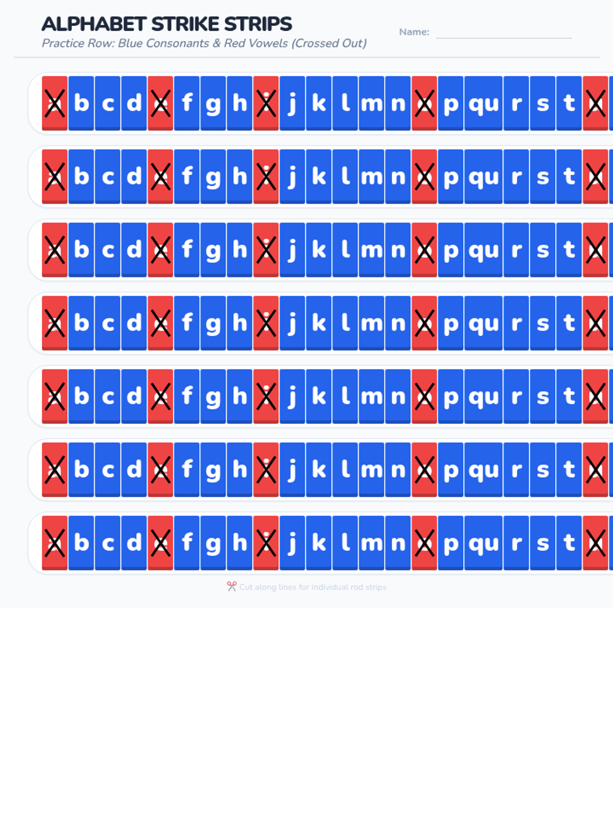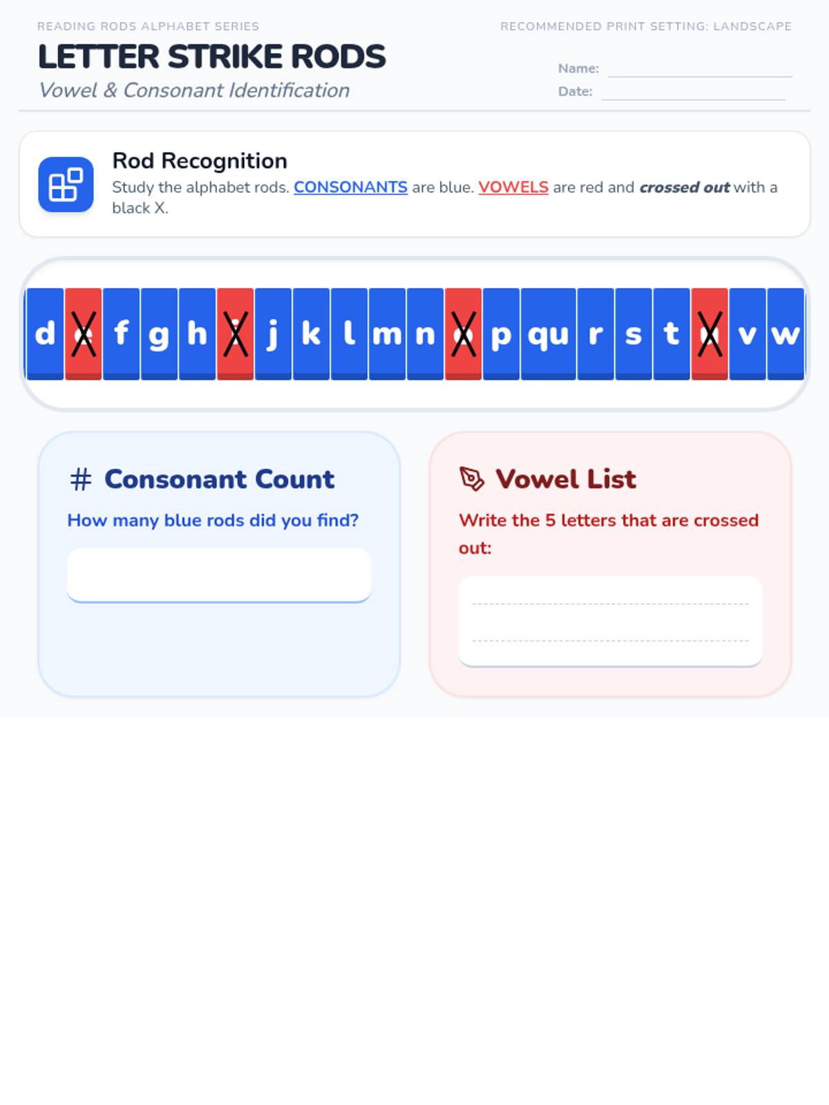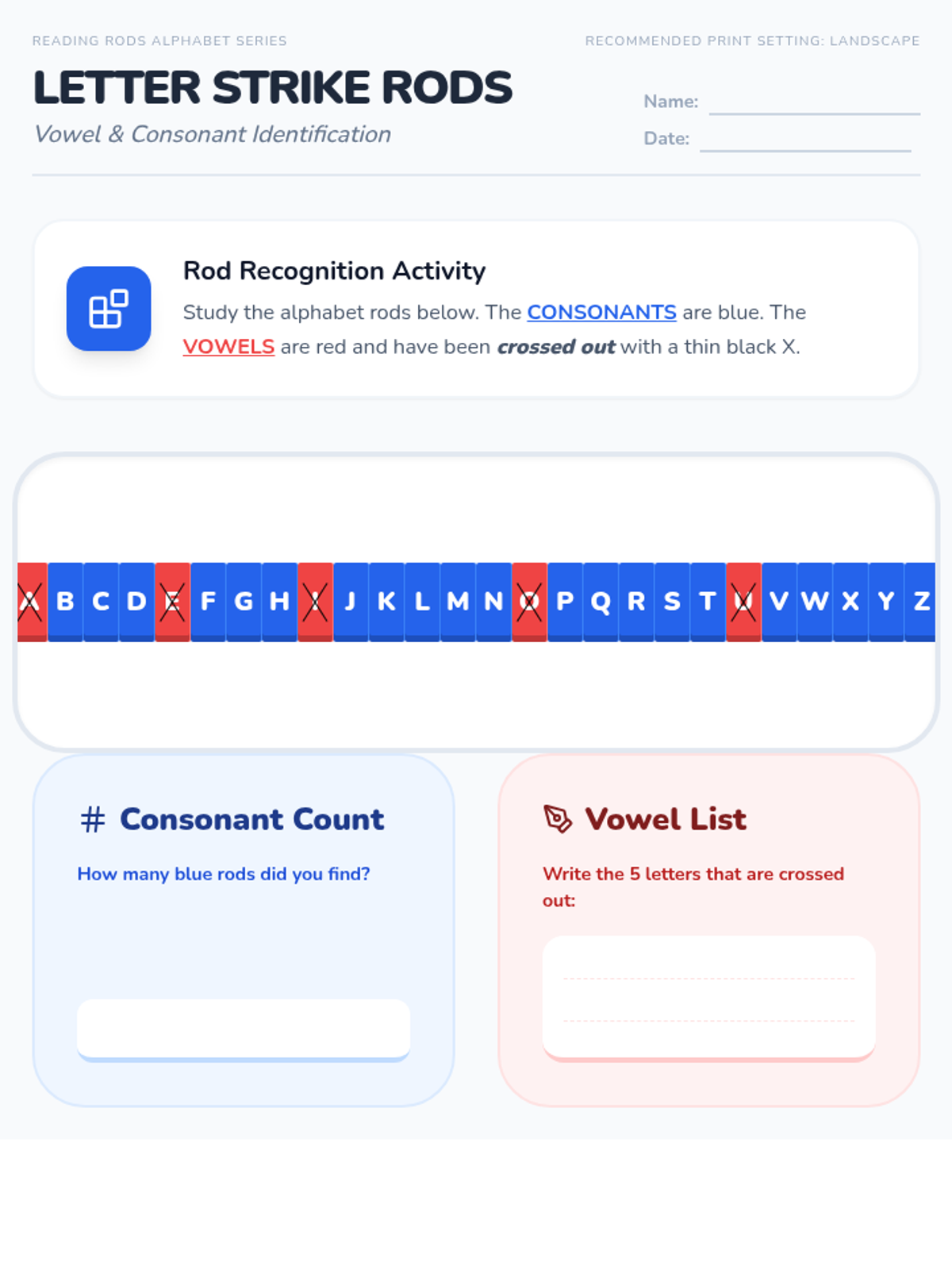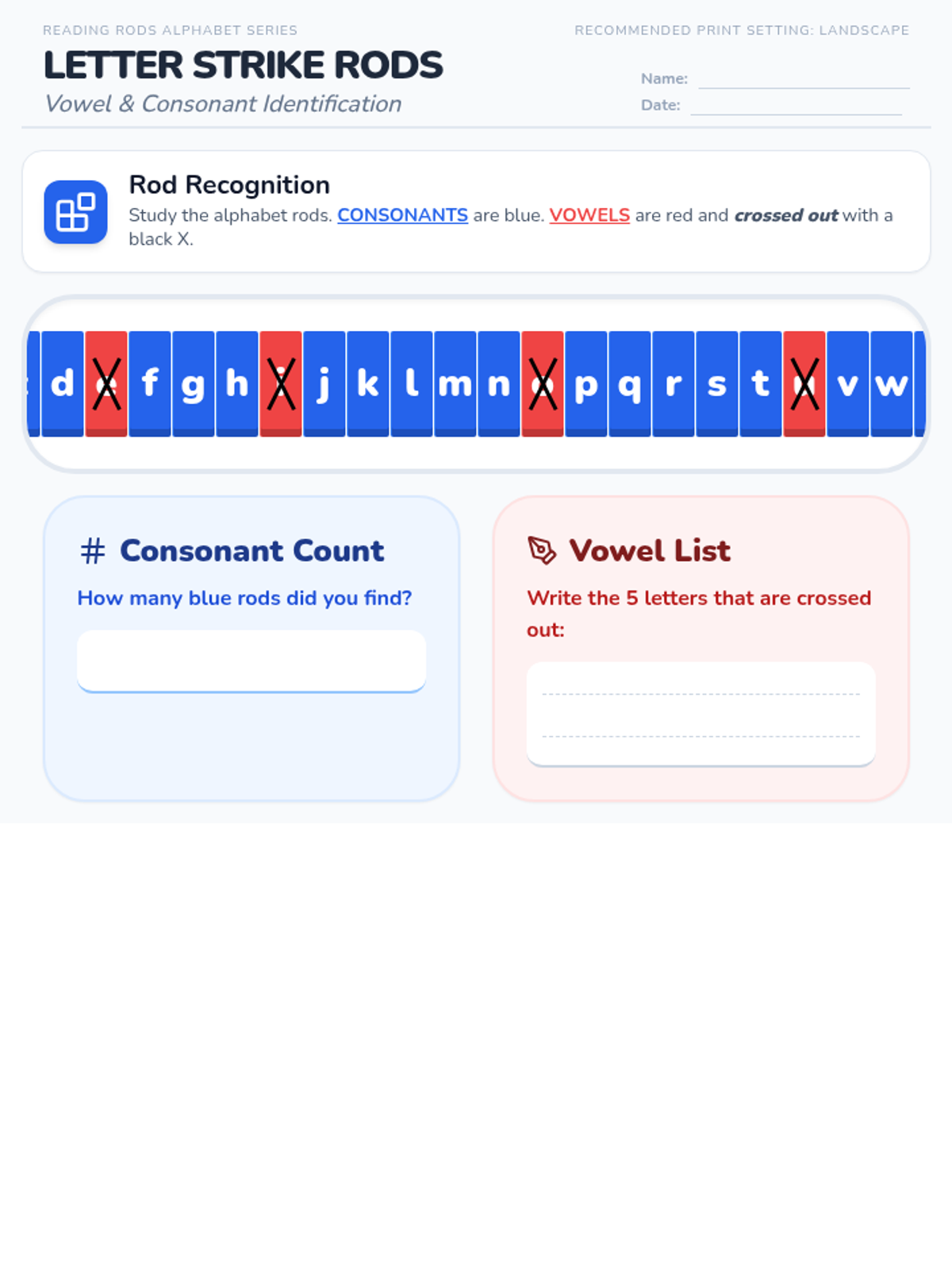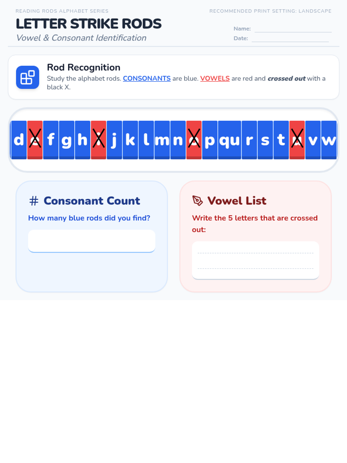 A focused activity on identifying and distinguishing between vowels and consonants using the visual style of plastic reading rods.
