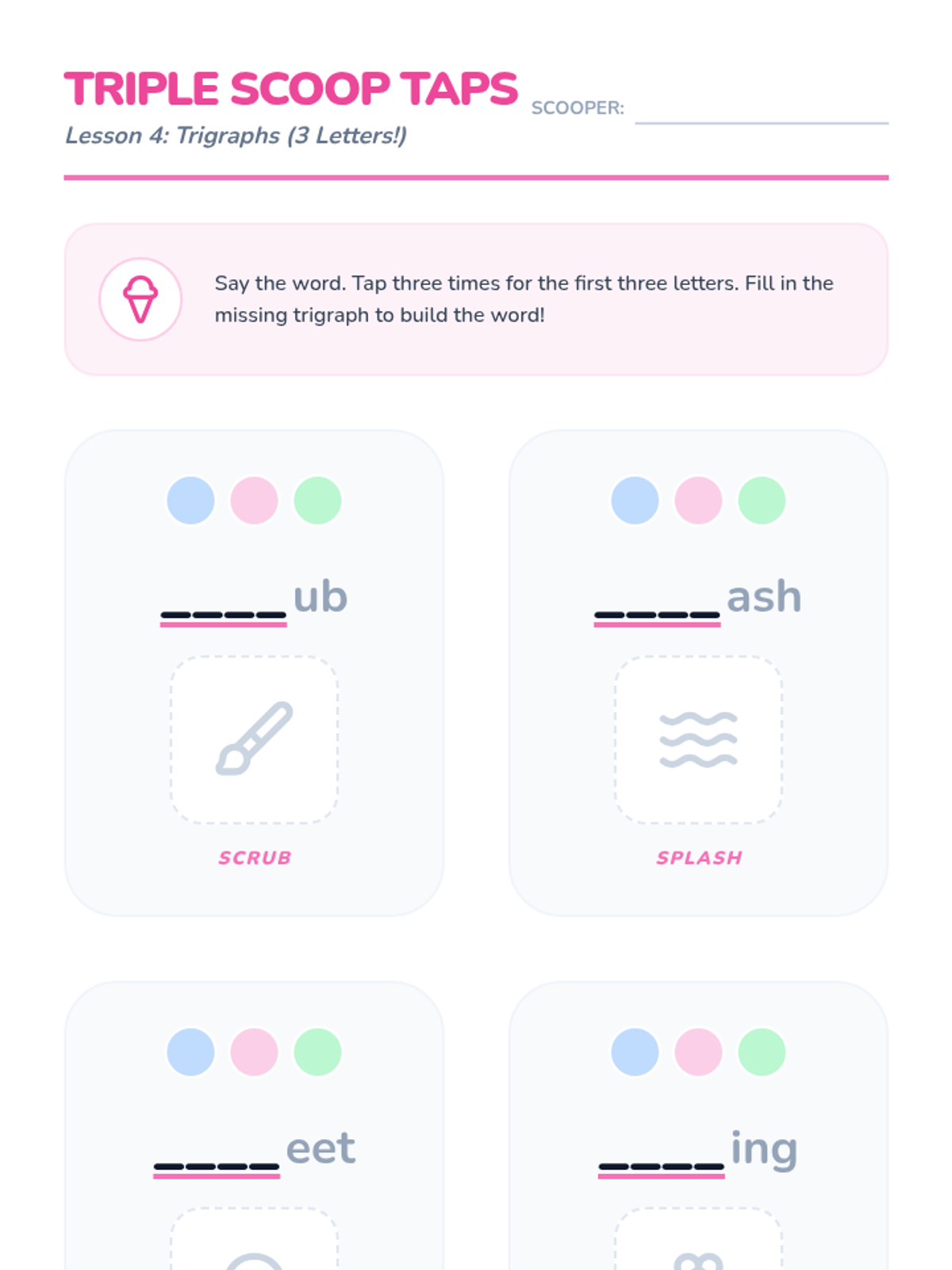 Students are introduced to the concept that three letters can blend together (scr, spl, str, spr). The lesson focuses on segmenting these complex onsets into three distinct taps or sounds to ensure no letter is skipped.