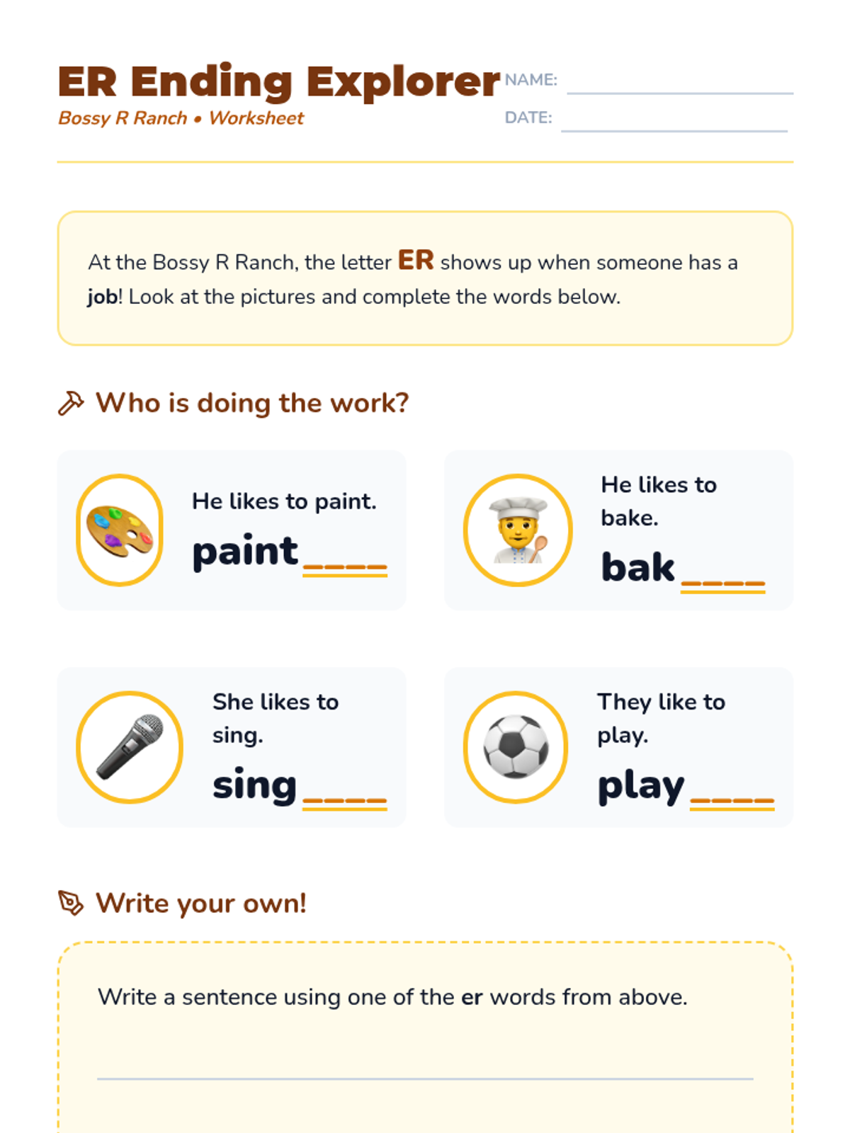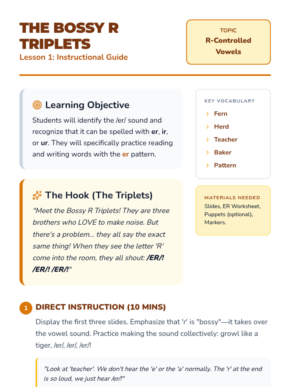 Students meet the 'Bossy R triplets' and discover that er, ir, and ur all say the same thing. This lesson focuses on the 'er' pattern in suffixes and word middles.
