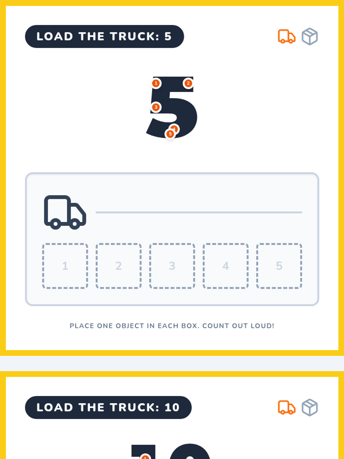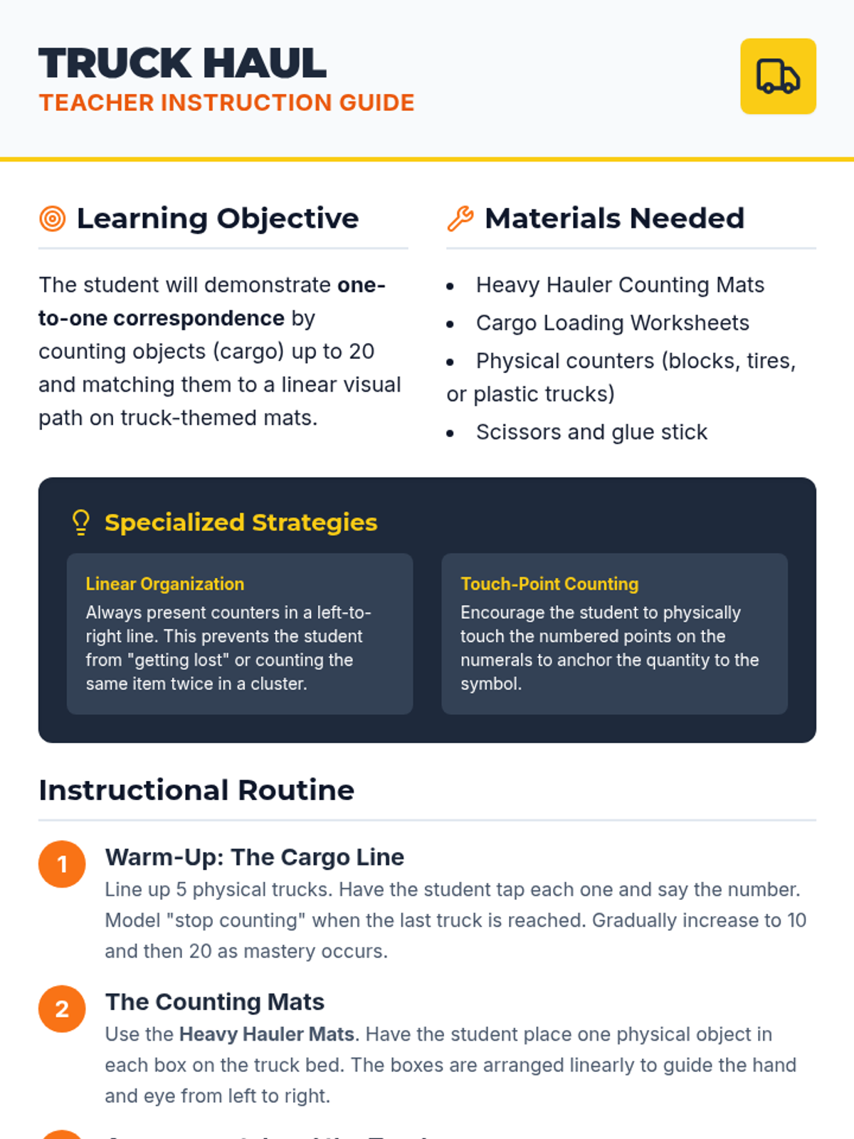A comprehensive lesson focusing on one-to-one correspondence up to 20 using truck-themed visuals and hands-on activities designed for special education students.