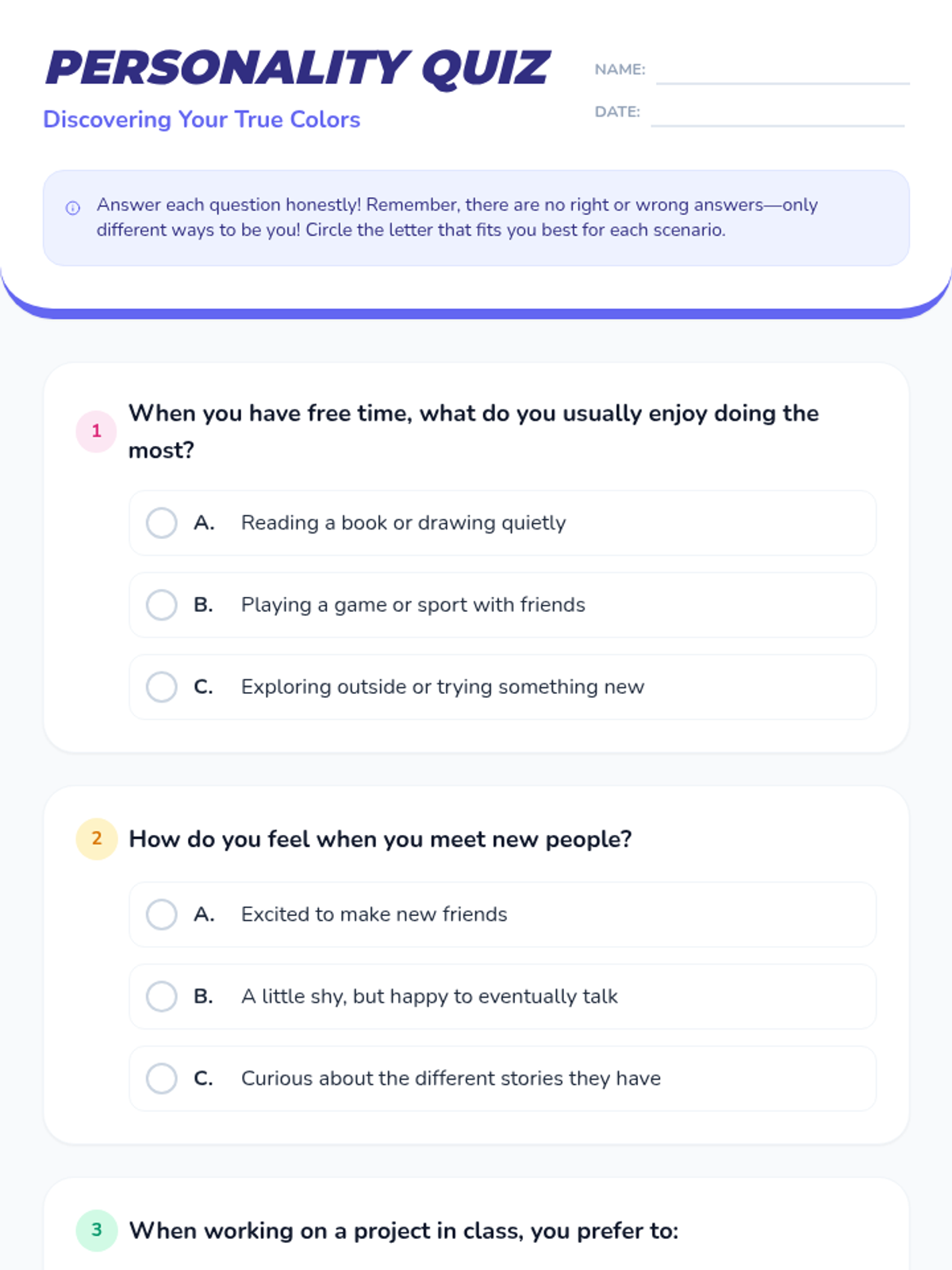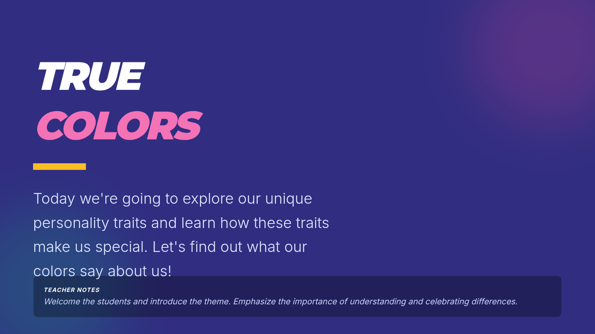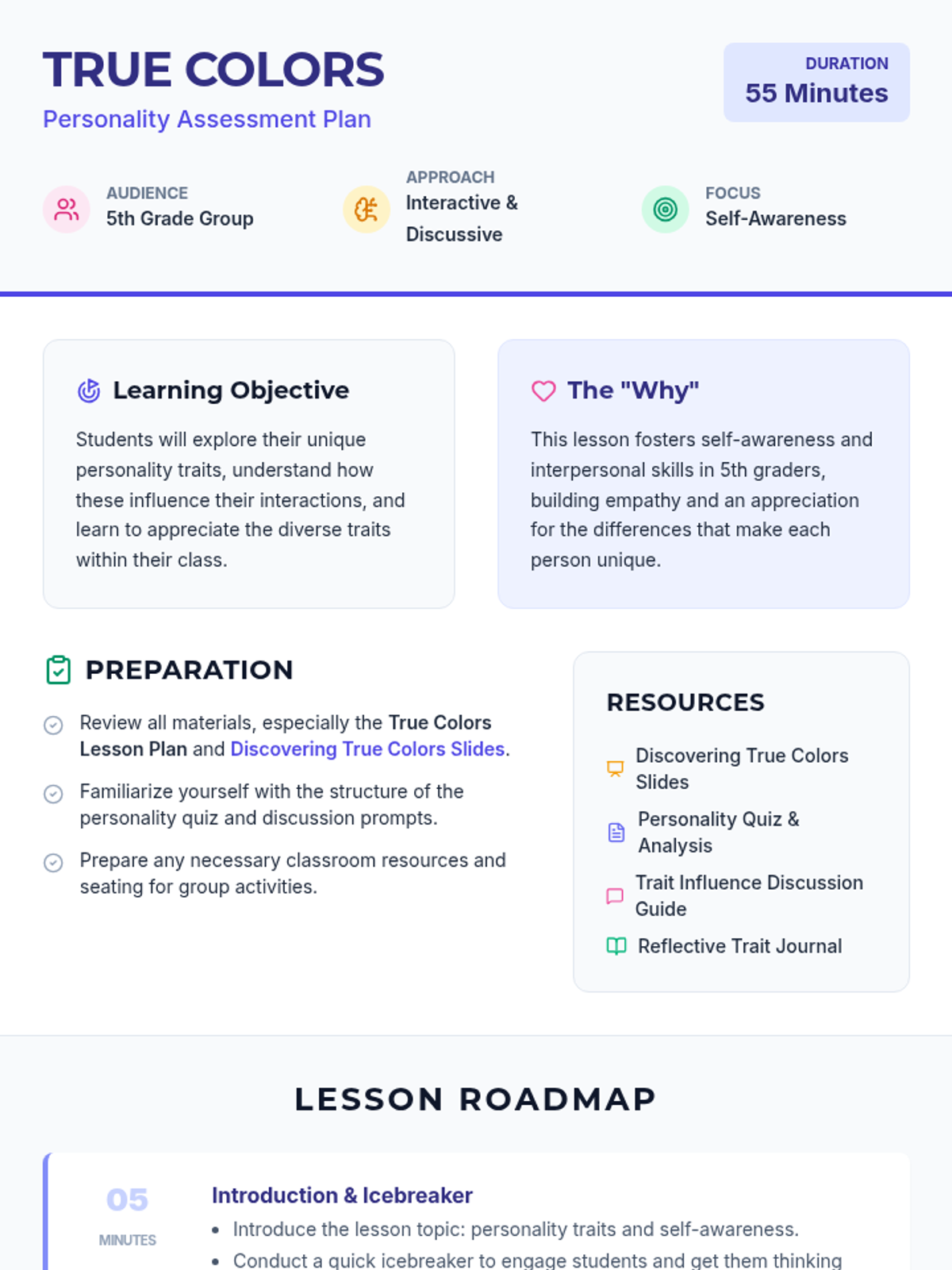 A 55-minute lesson for 5th graders using personality assessments to foster self-awareness and appreciate diversity in interpersonal traits.