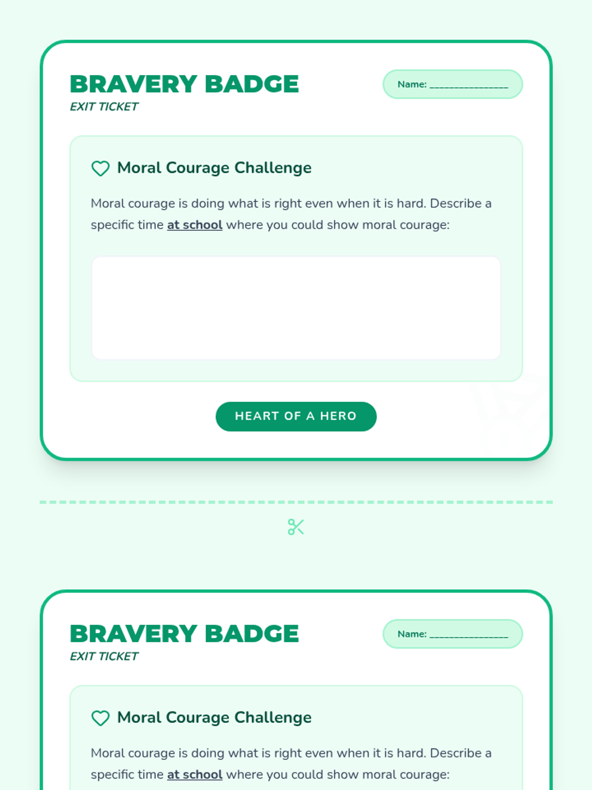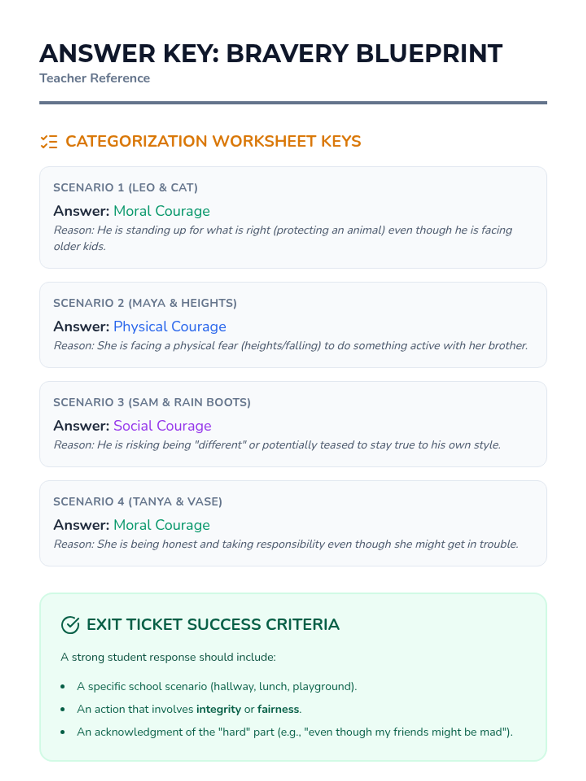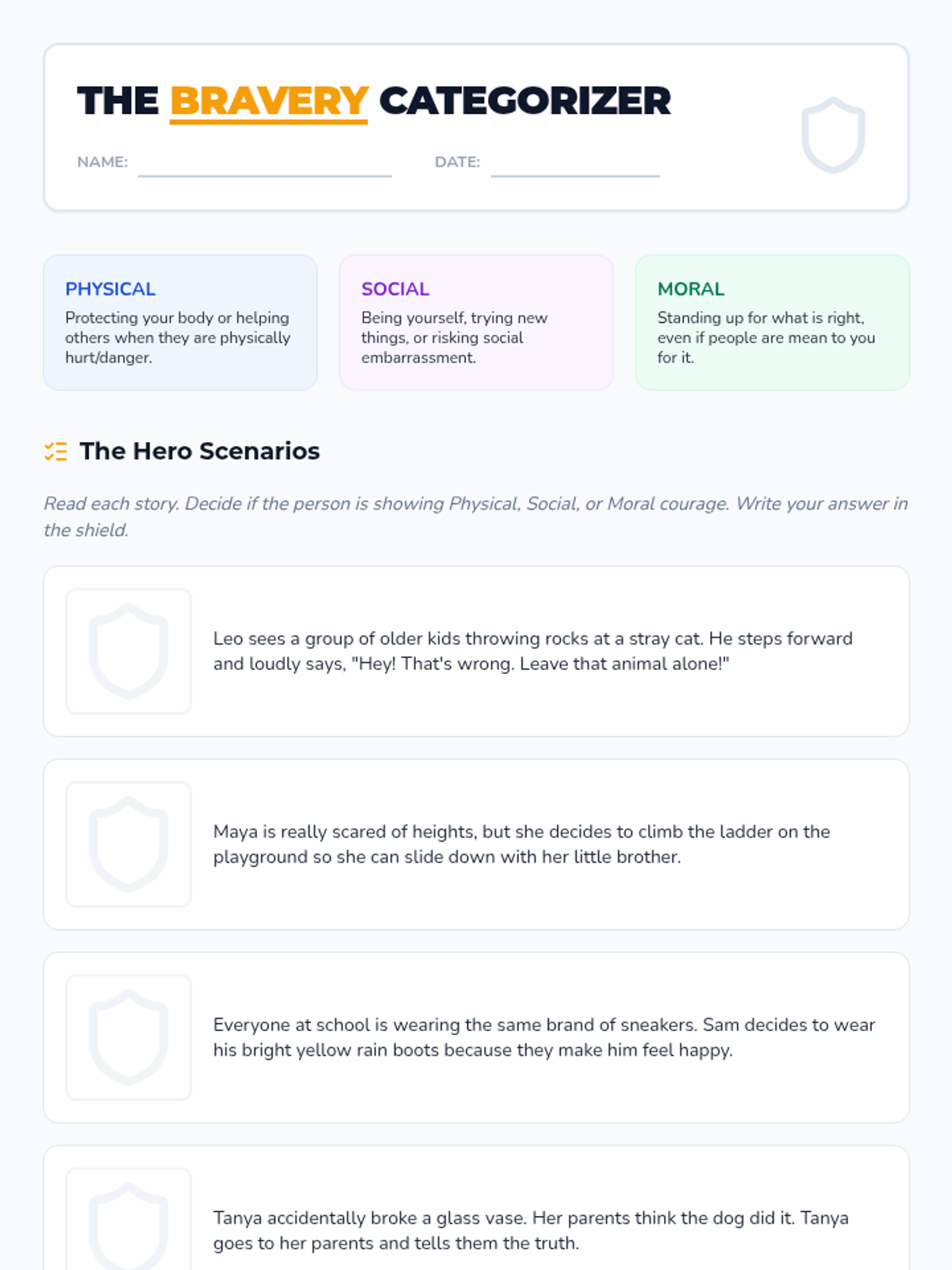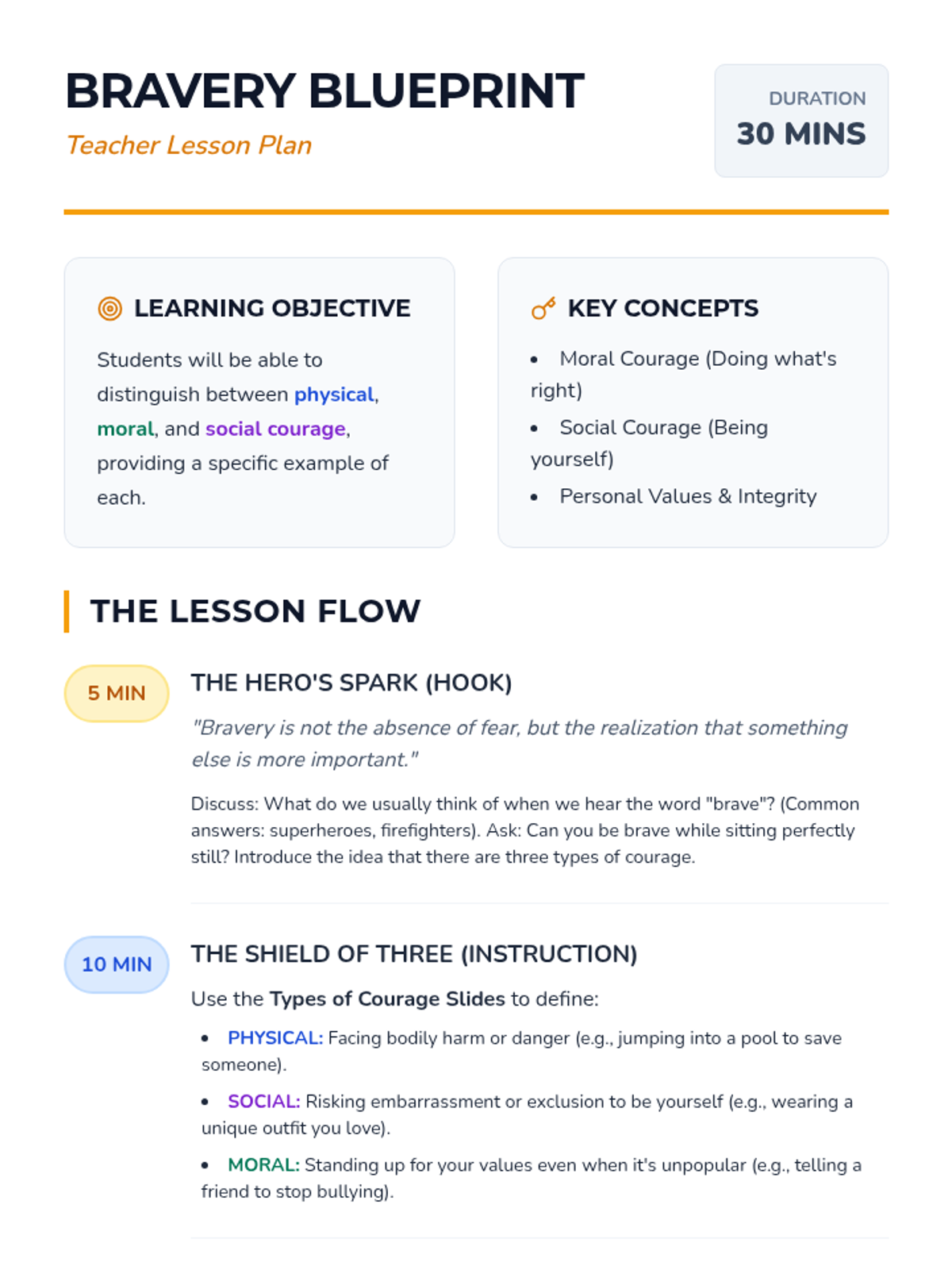 A 30-minute character education lesson for 3rd graders to explore and distinguish between physical, moral, and social courage through interactive discussion and categorization.