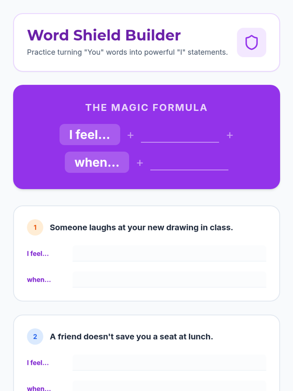 Students will learn to use 'I-statements' to express their needs and understand the connection between their thoughts and their feelings.
