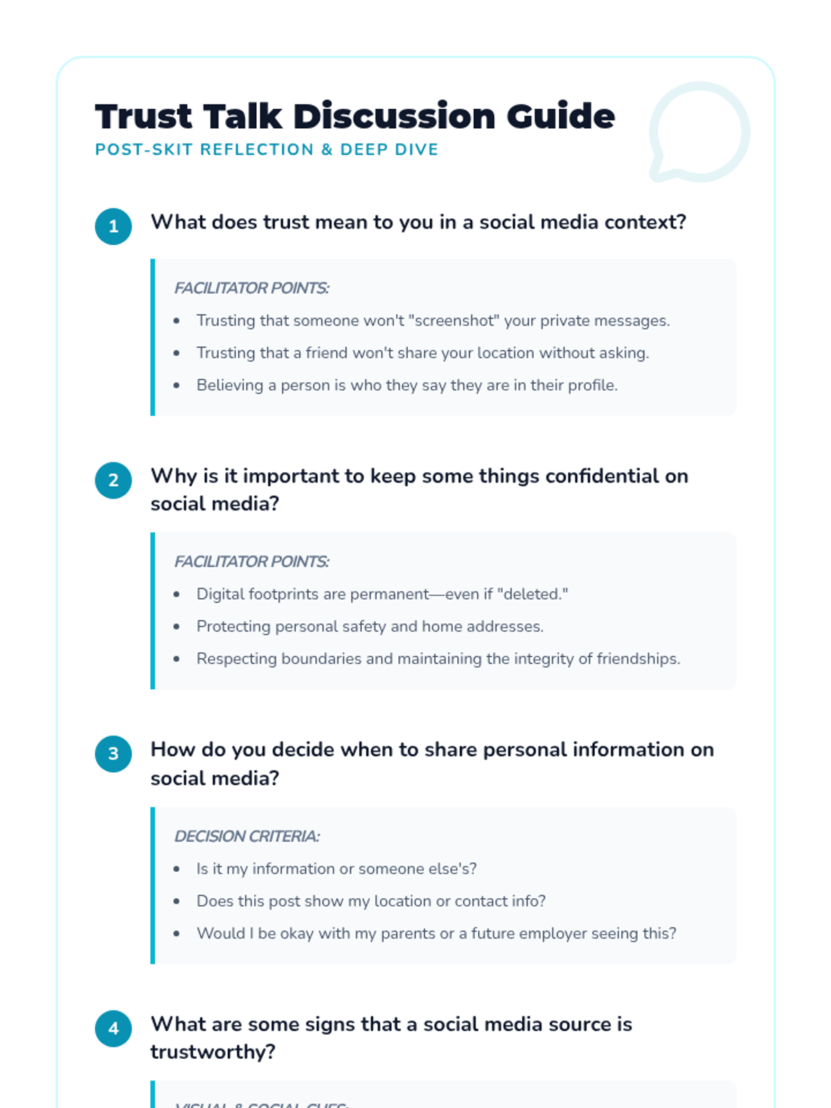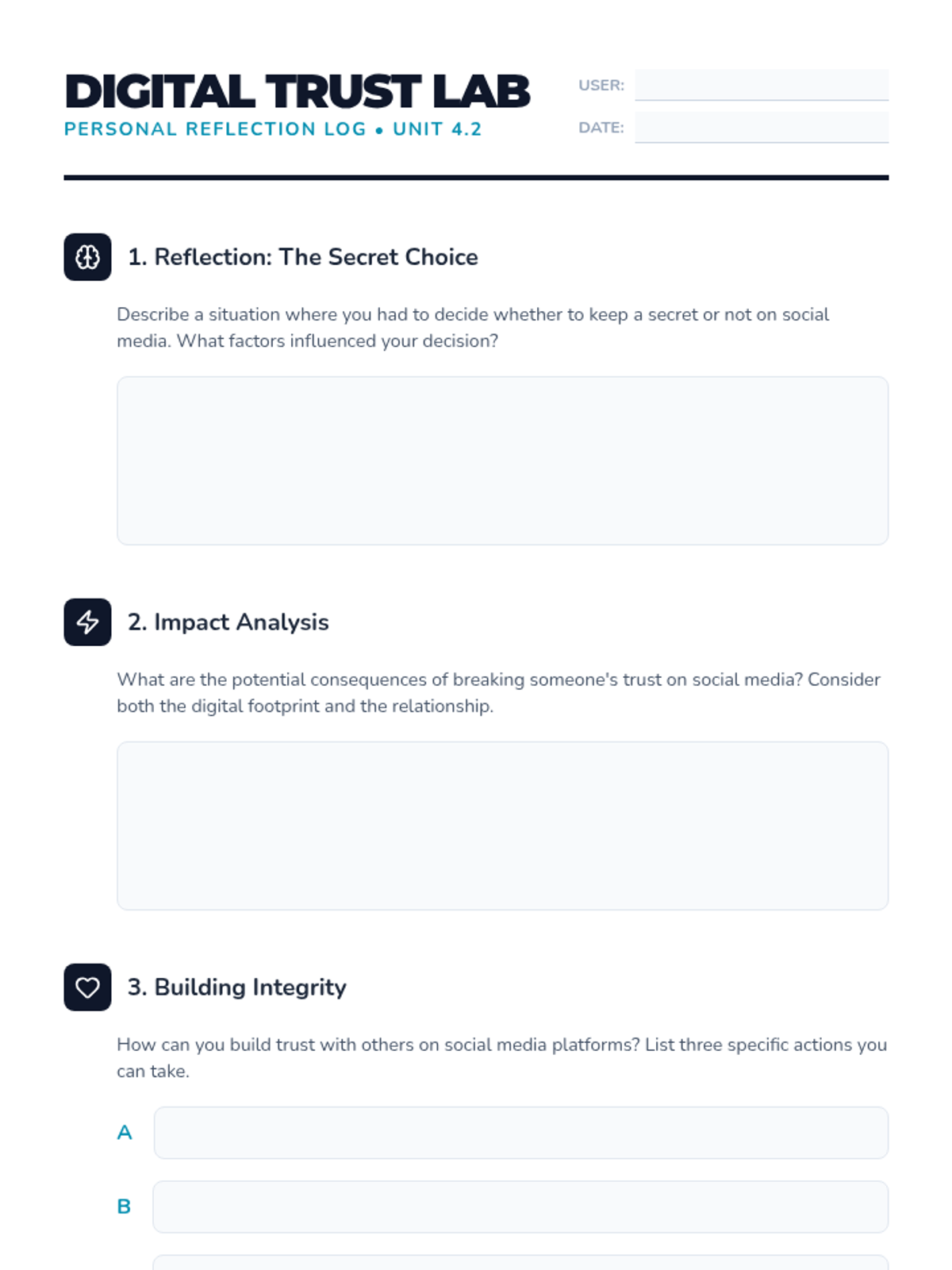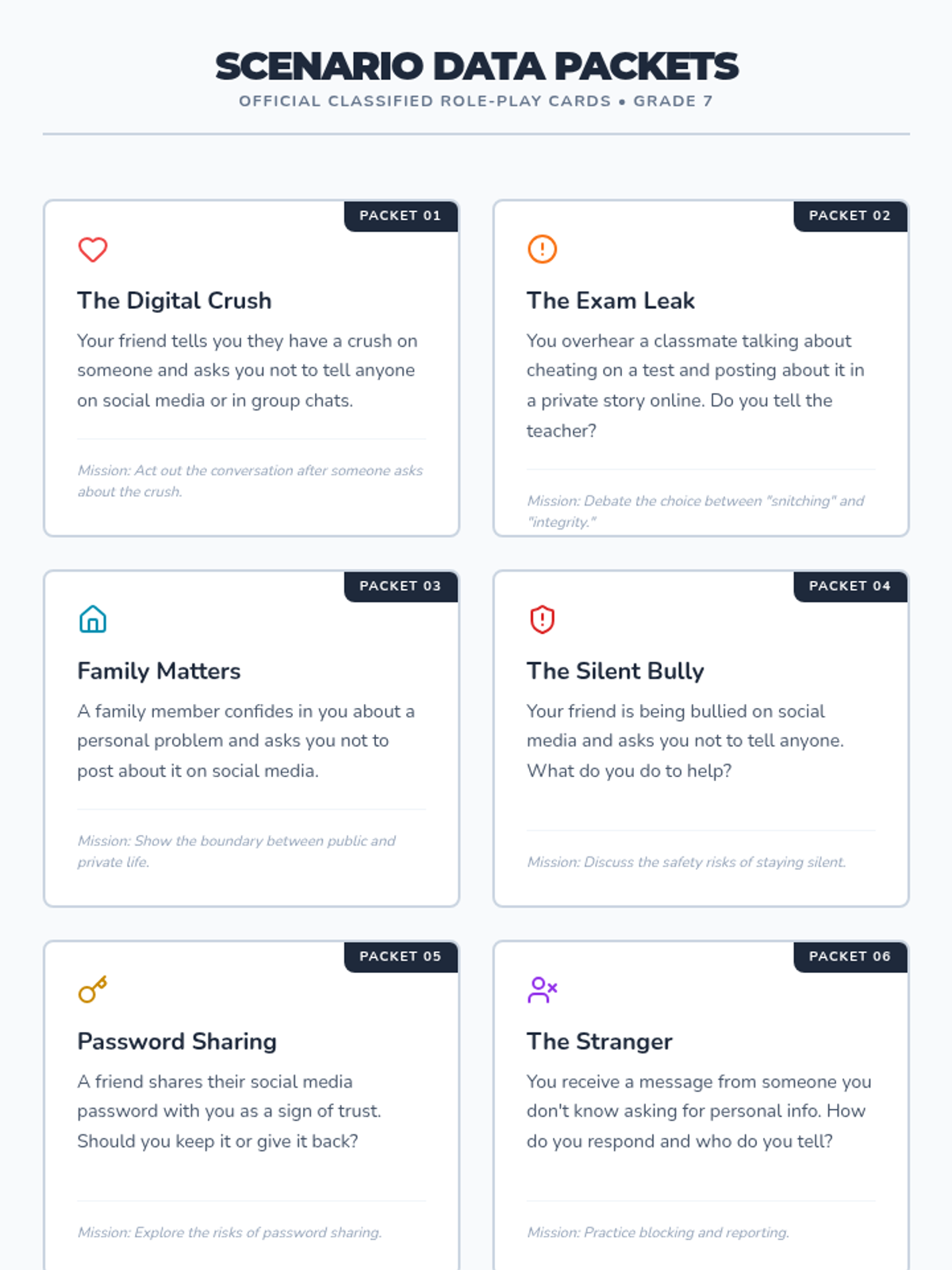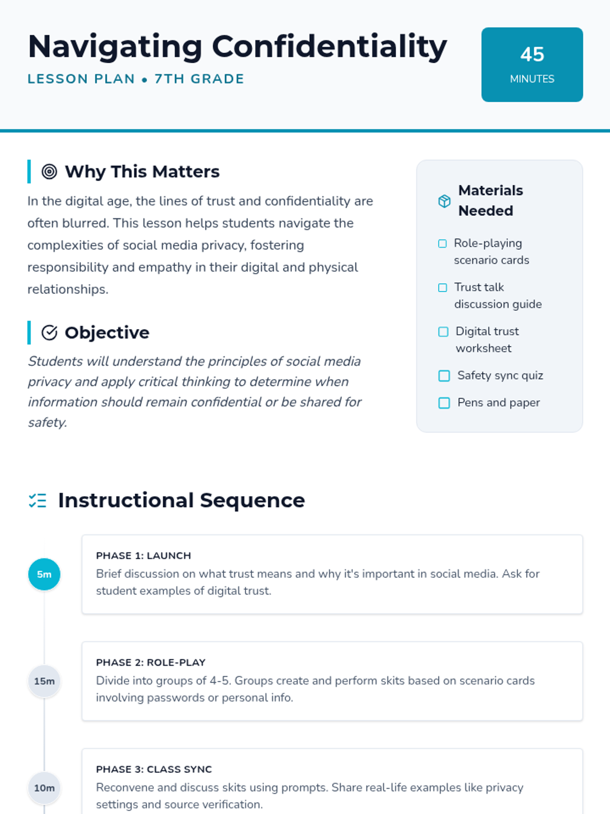 A comprehensive lesson for 7th graders on trust, secrets, and confidentiality in the digital age. Students explore the nuances of social media privacy through role-playing, discussion, and collaborative projects.