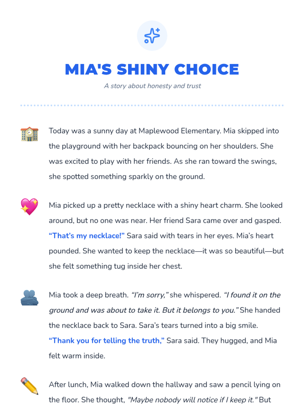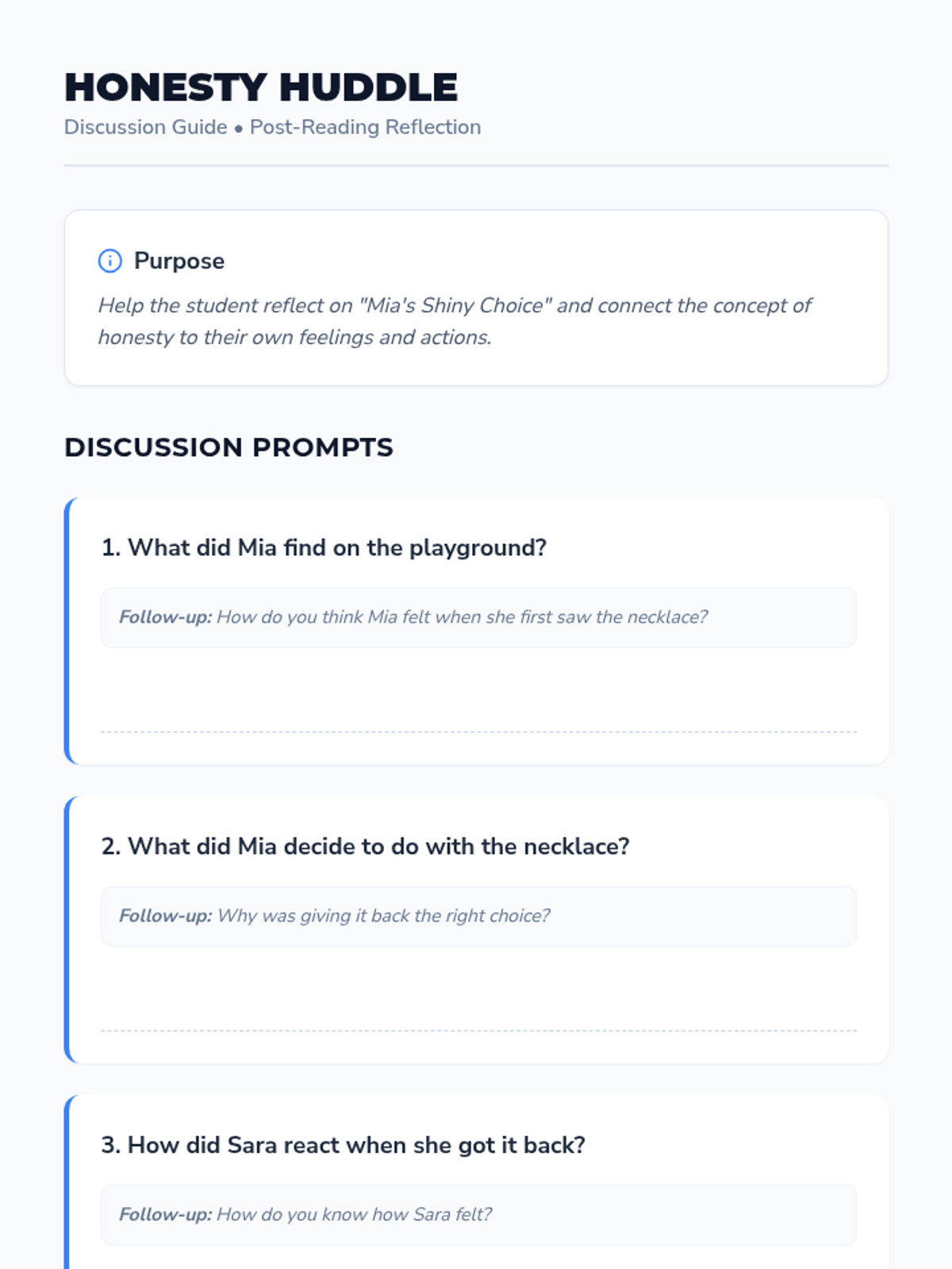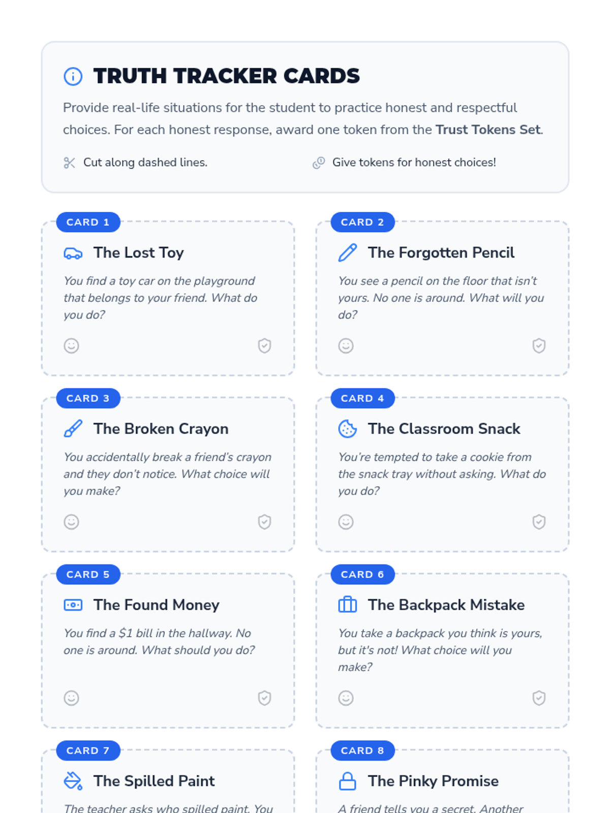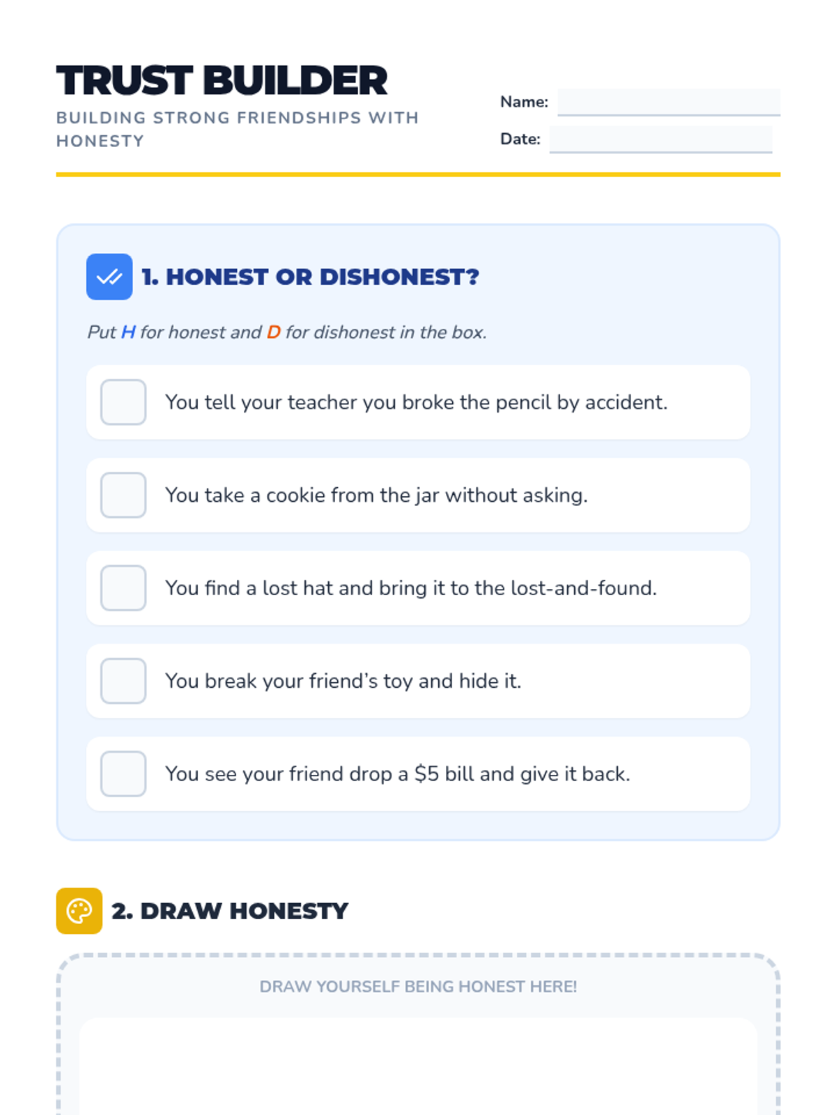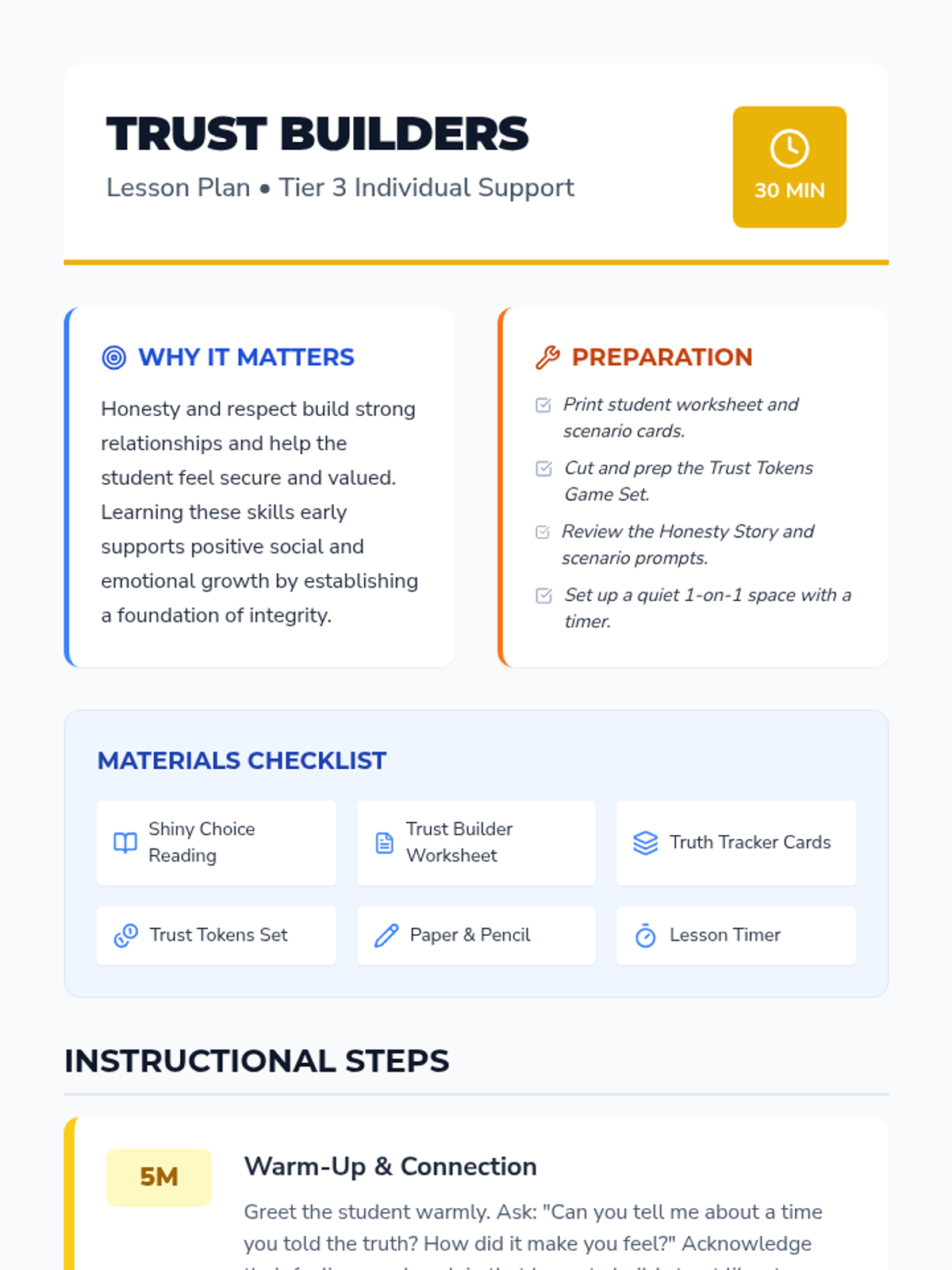 A 30-minute individual lesson for 1st graders focused on building trust through honesty and respect. Includes a story, guided discussion, interactive worksheet, and a role-play game.