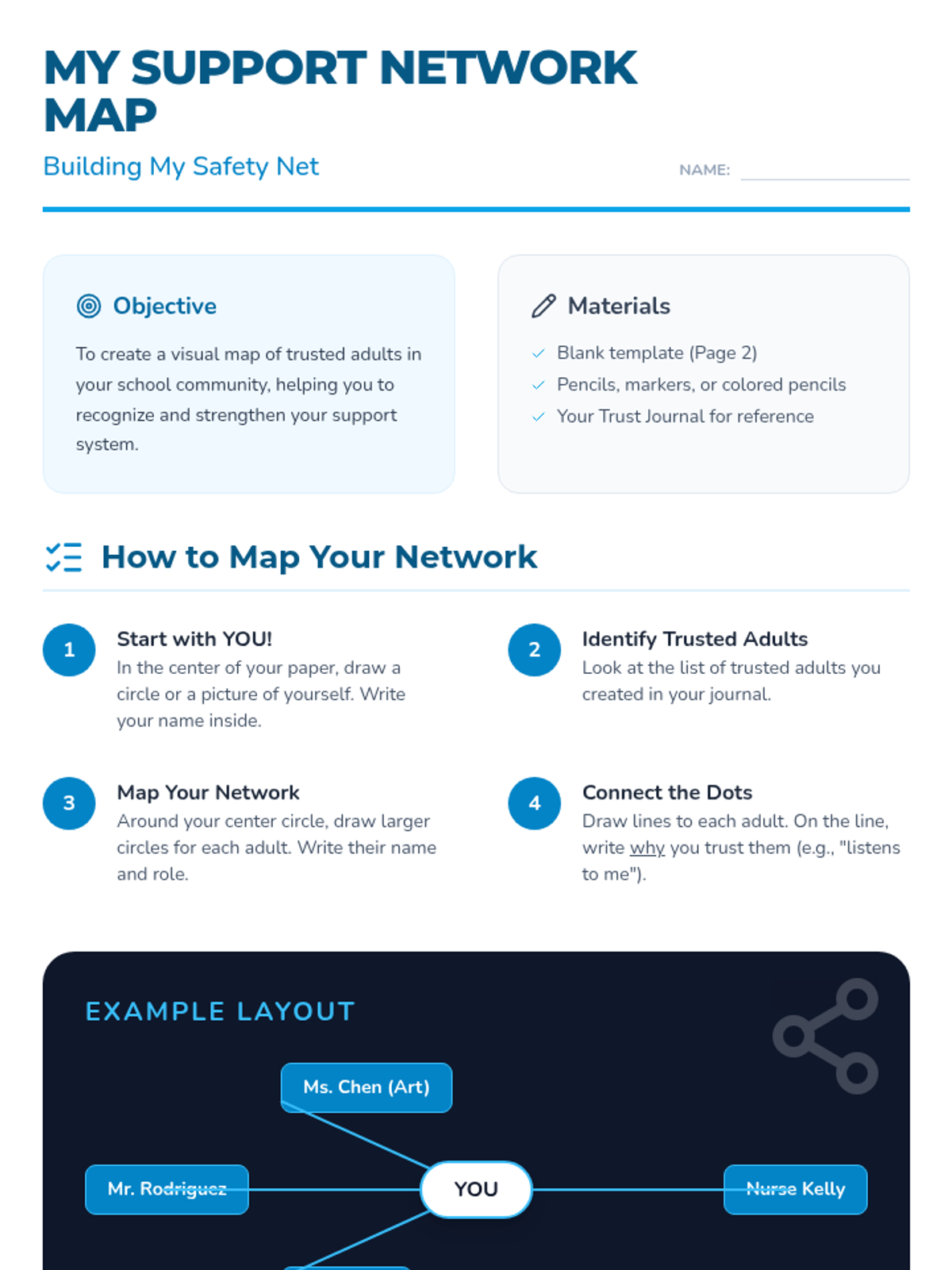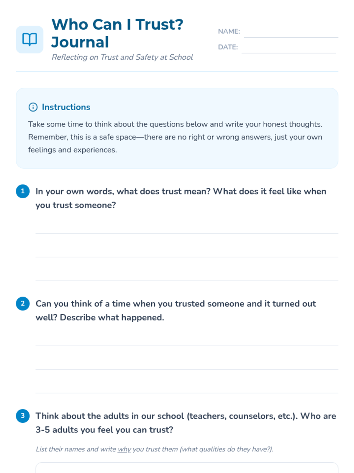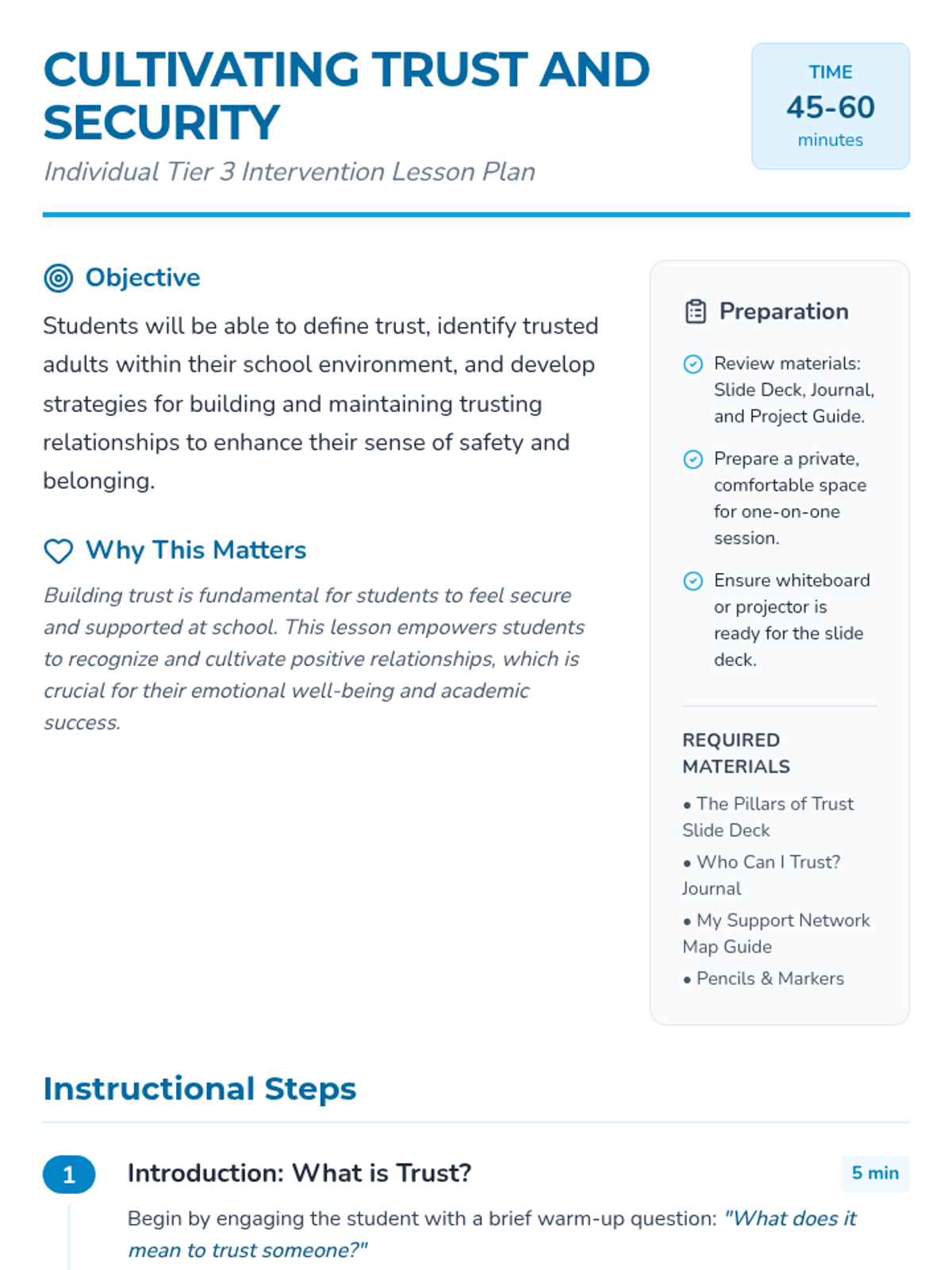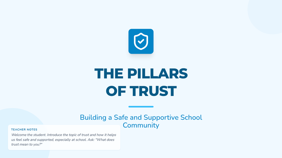 This lesson helps individual students identify and cultivate trust with adults at school to improve their sense of safety and belonging. Students will define trust, identify trustworthy qualities, and map out their own school support network.