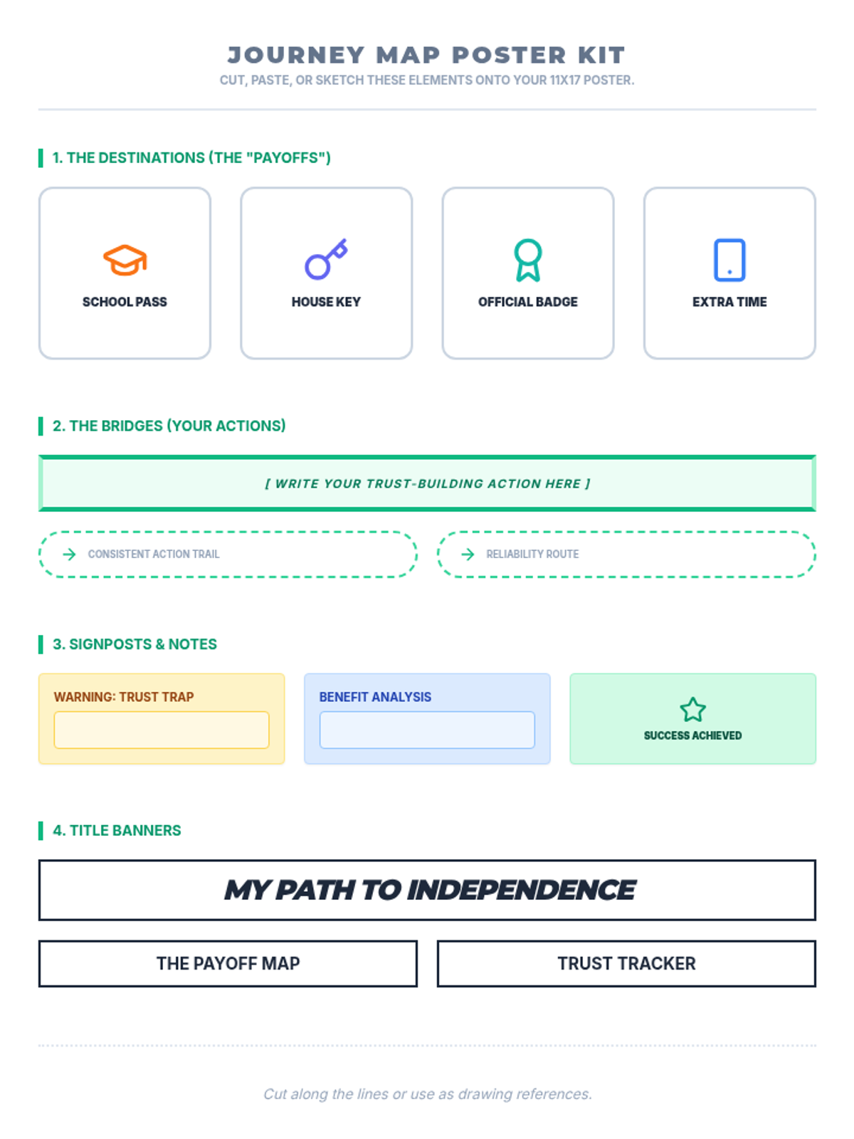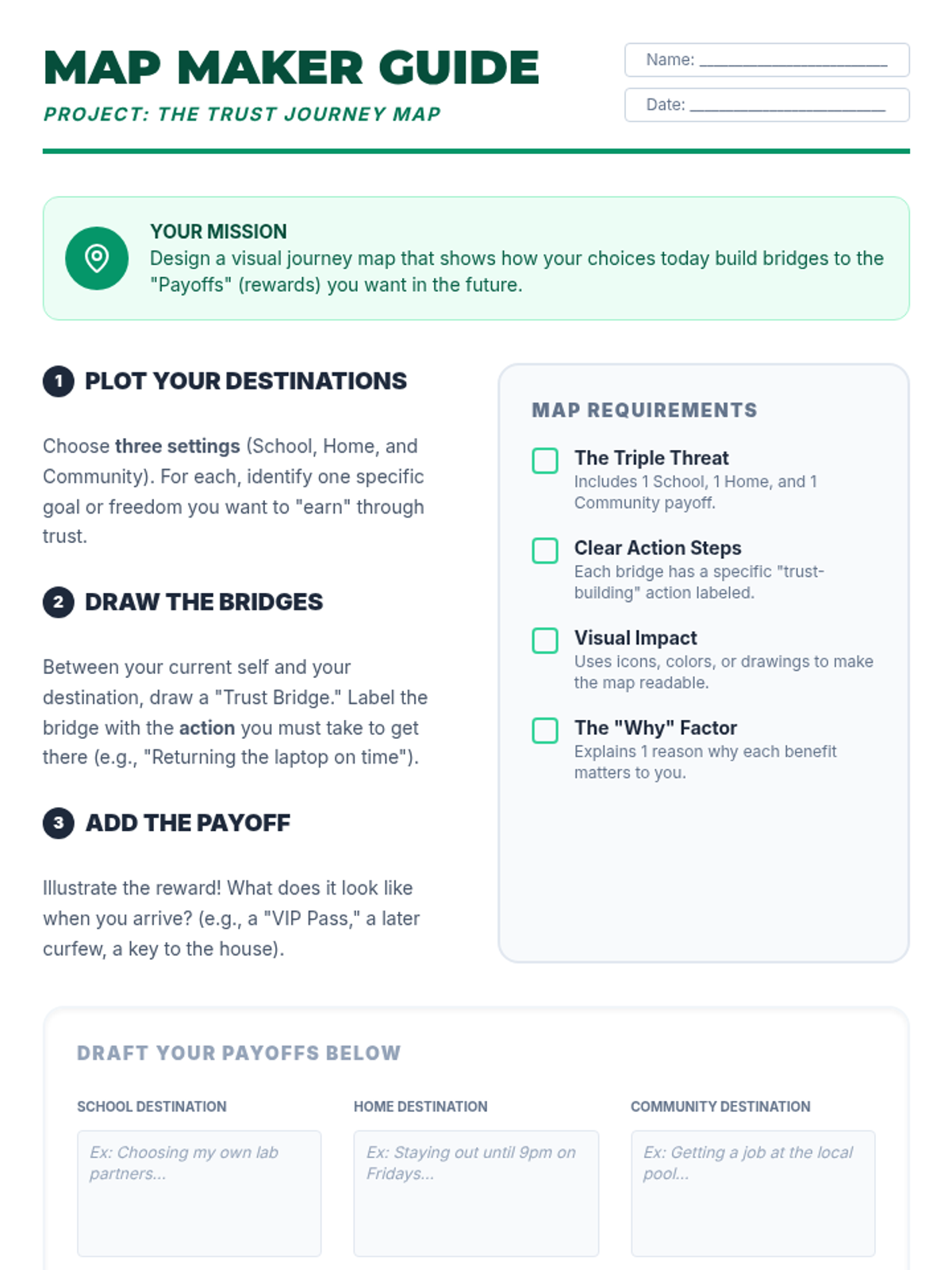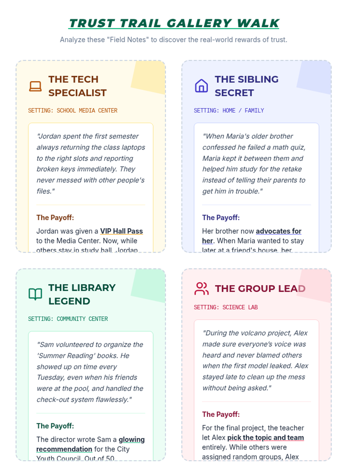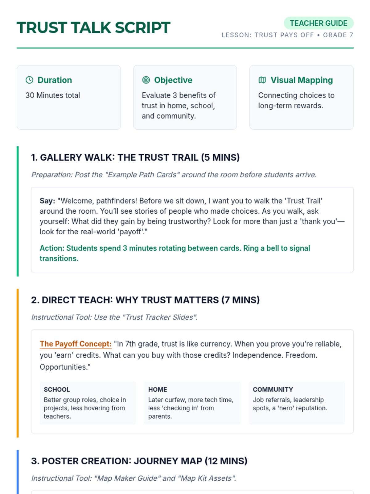 Students explore the tangible benefits of trustworthiness across school, home, and community through visual mapping and collaborative analysis. They will identify specific rewards for building trust and illustrate these on a personal journey map.