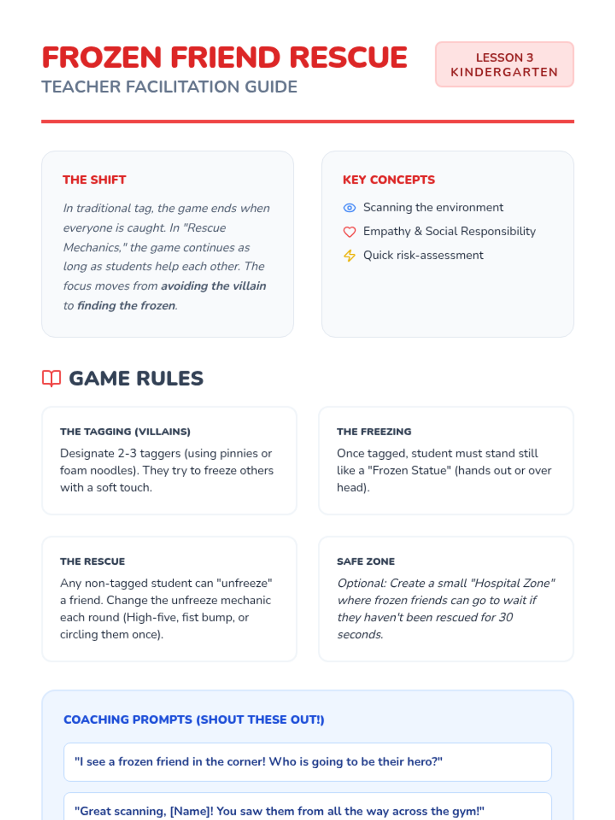A variation of tag where students act as 'superhero doctors' to unfreeze peers using cooperative actions, shifting focus from avoidance to assistance.