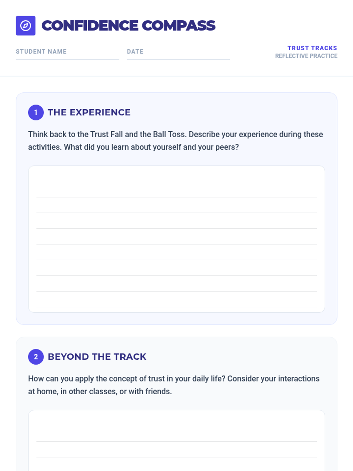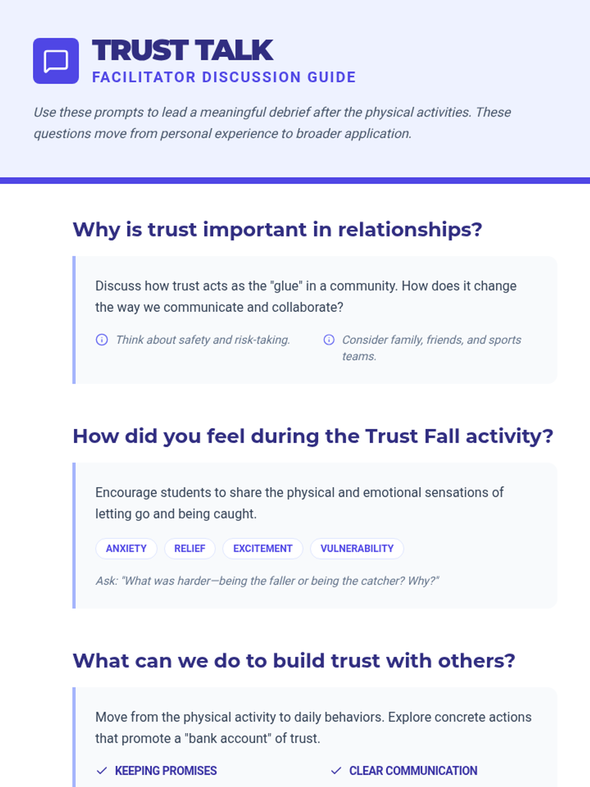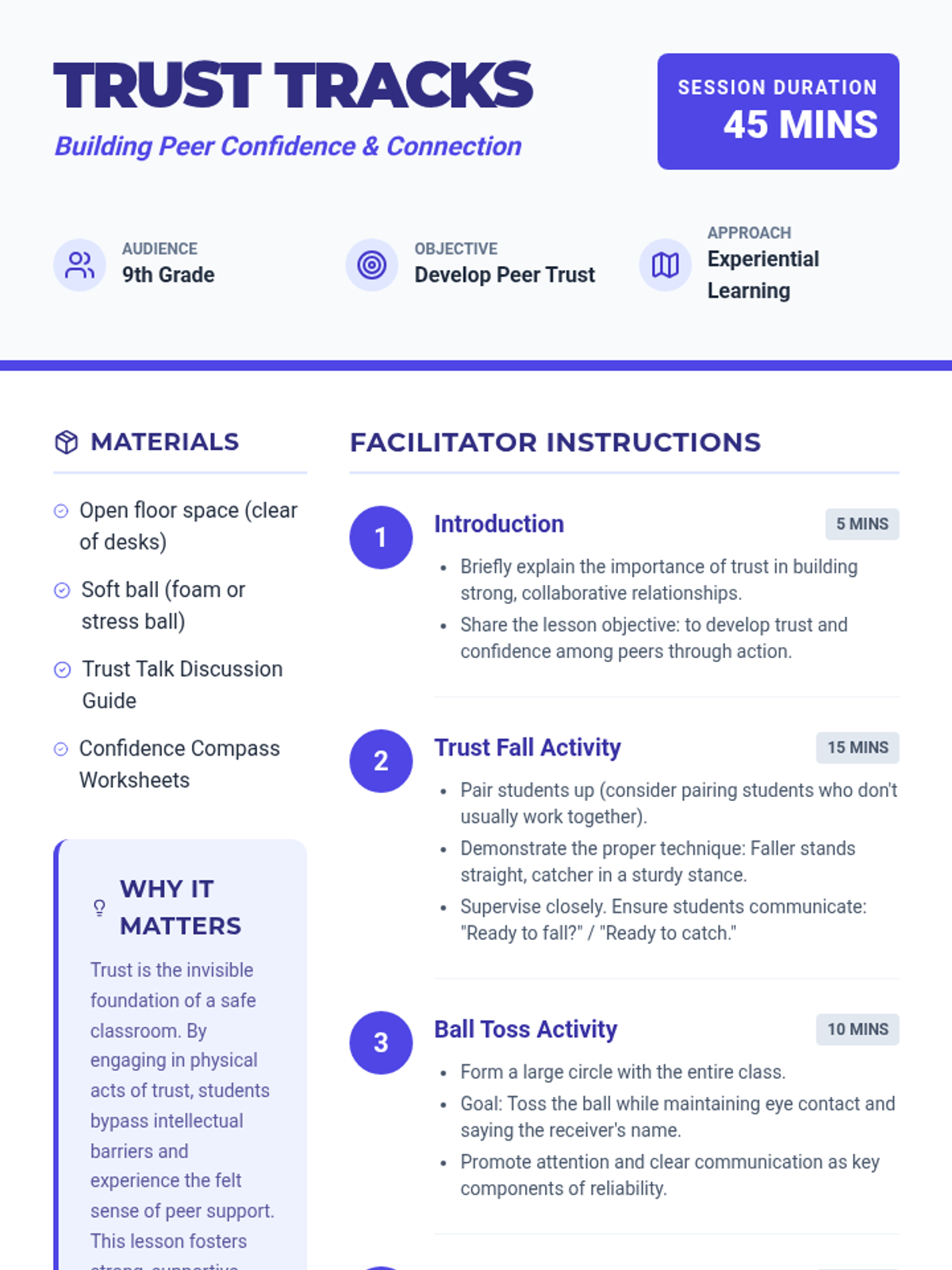 A 45-minute lesson for 9th graders focused on building peer trust through physical activities and guided reflection. Students engage in trust falls and ball toss exercises to experience and analyze interpersonal confidence.