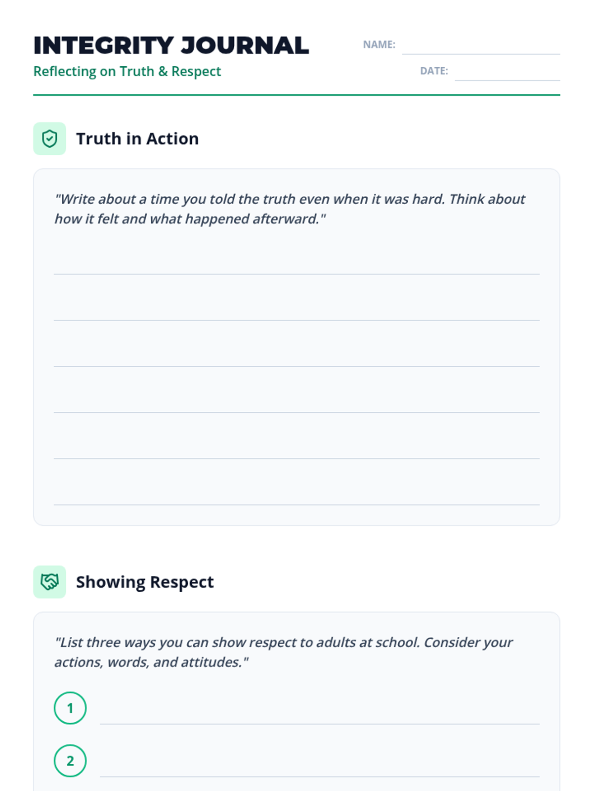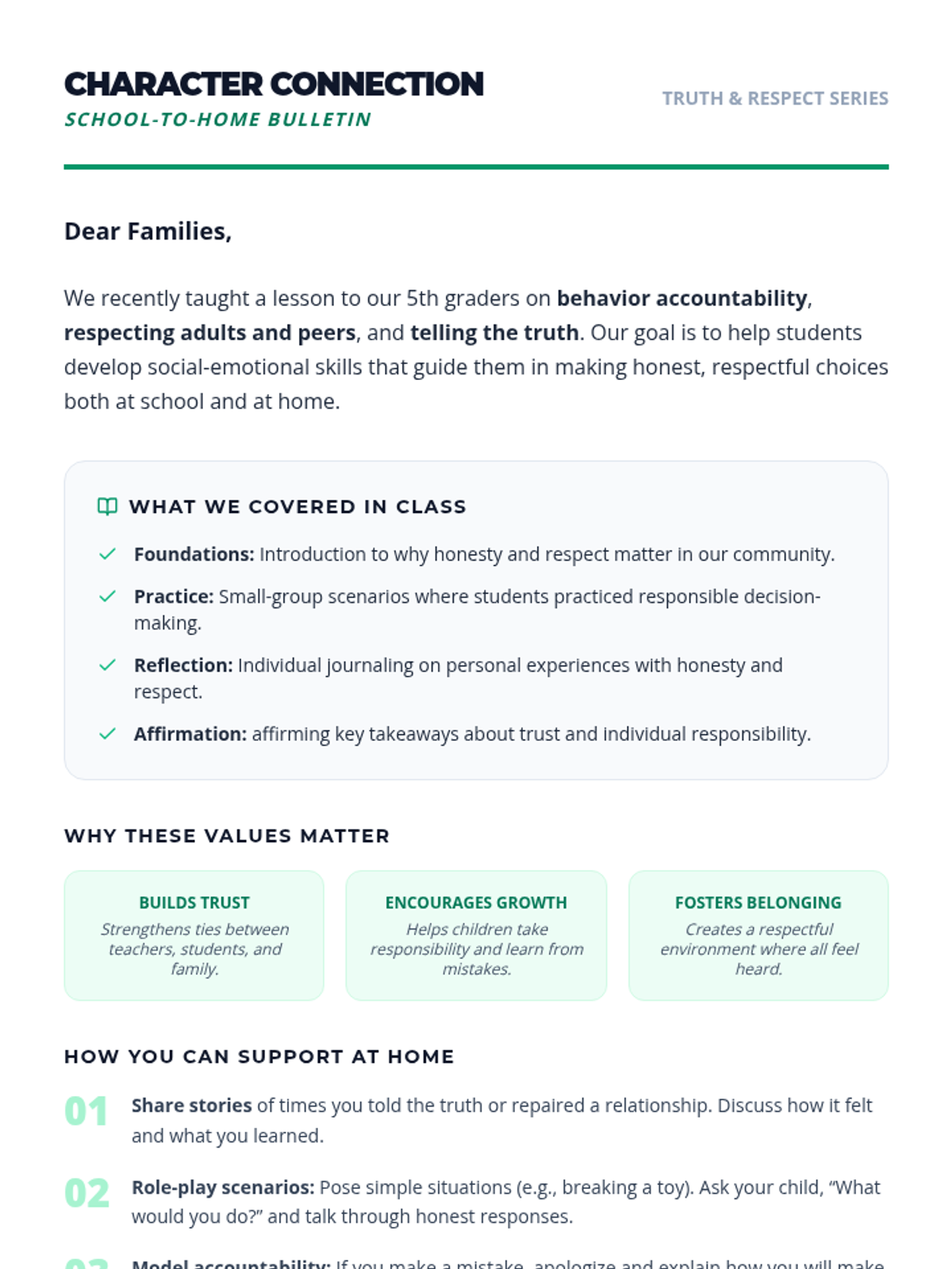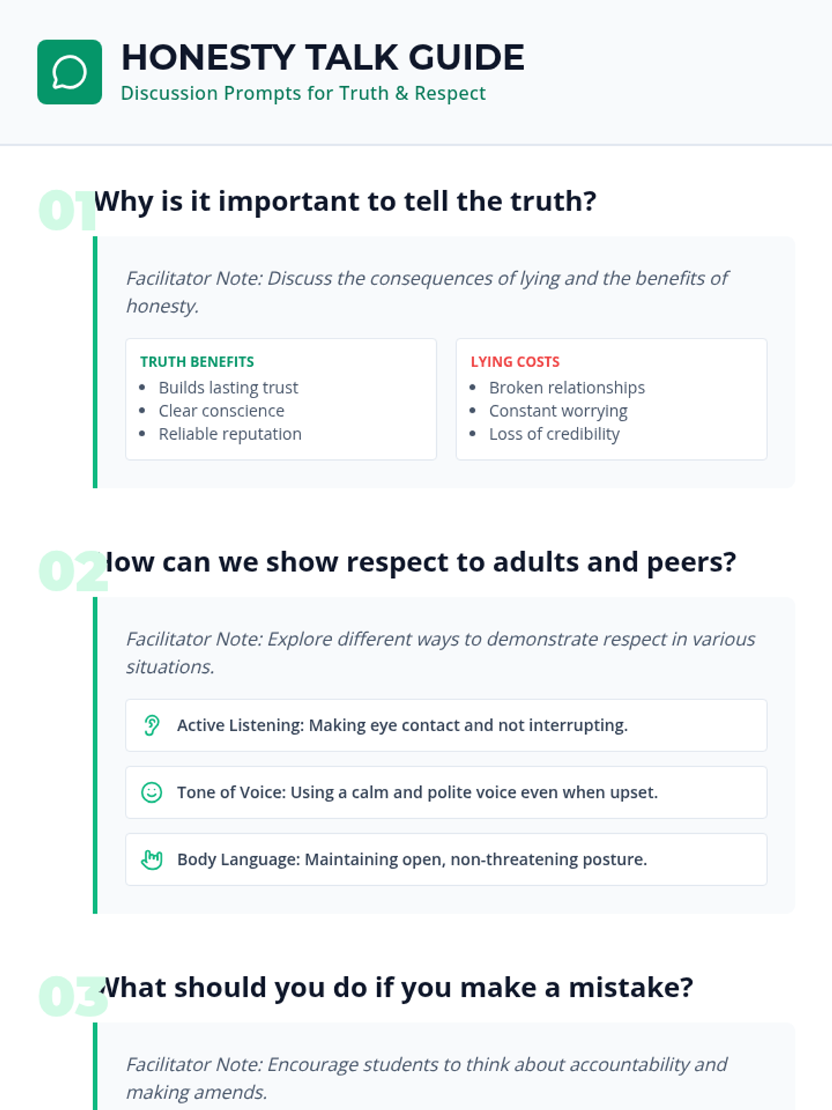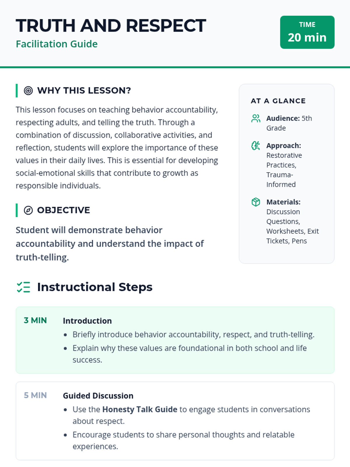 This lesson focuses on teaching behavior accountability, respecting adults, and telling the truth through discussion and reflection. Students will develop essential social-emotional skills to become responsible and respectful individuals.