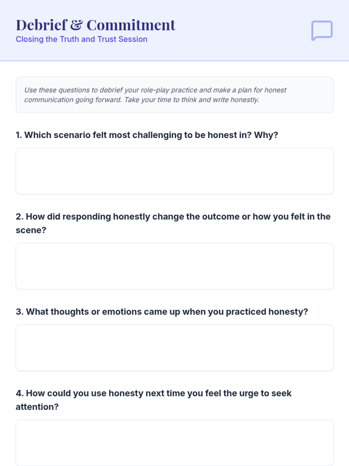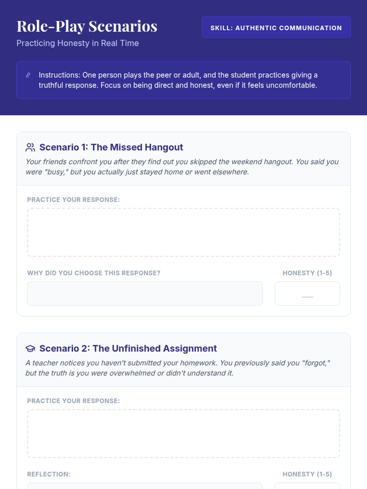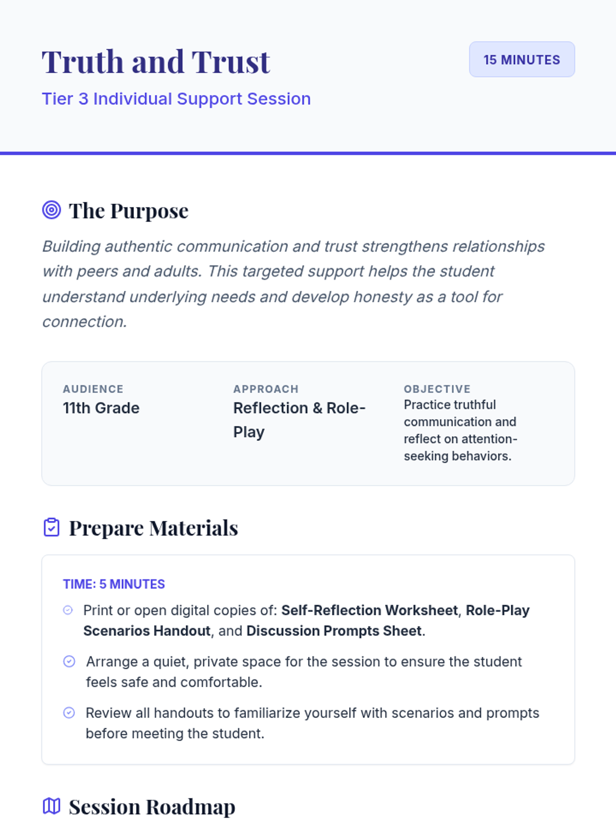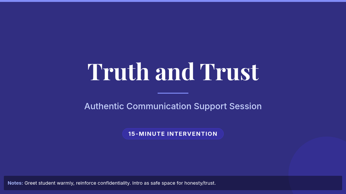 A 15-minute individualized Tier 3 support session for 11th graders focusing on authentic communication, understanding attention-seeking behaviors, and building trust through reflection and role-play.