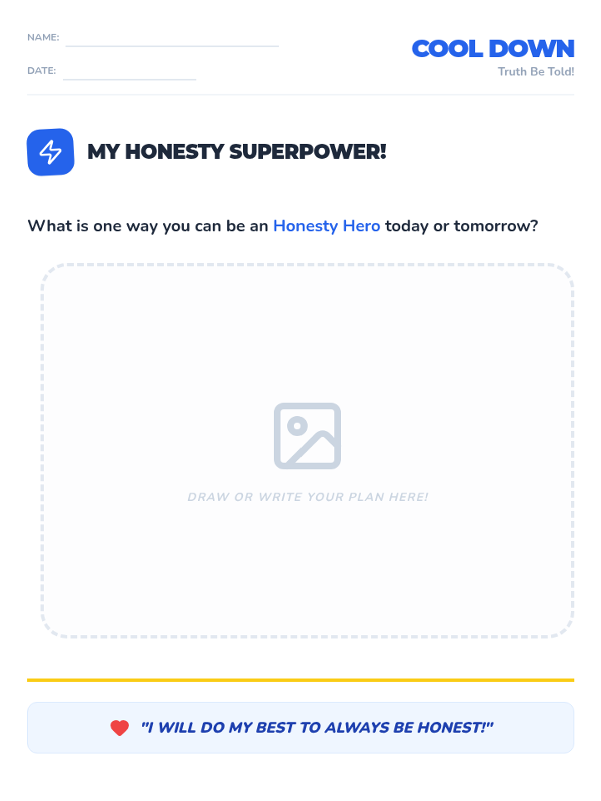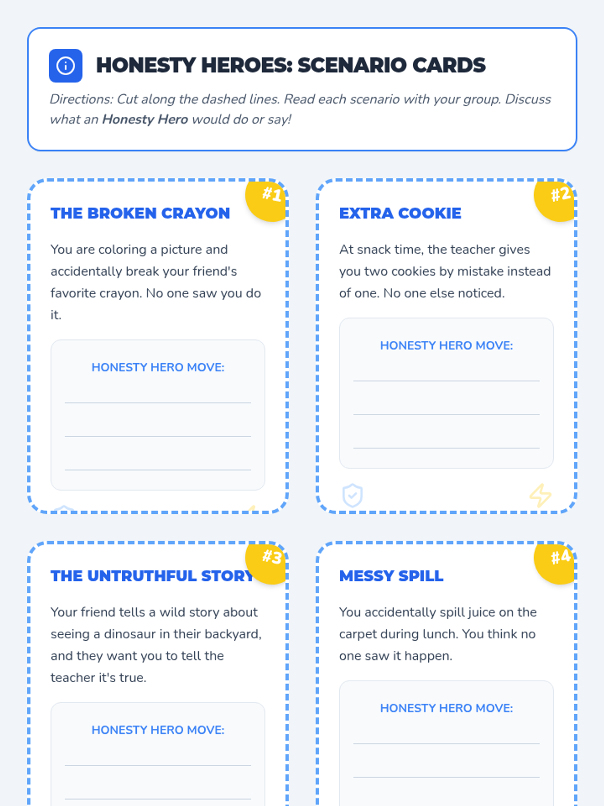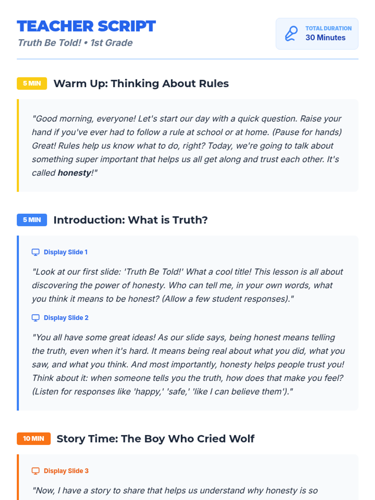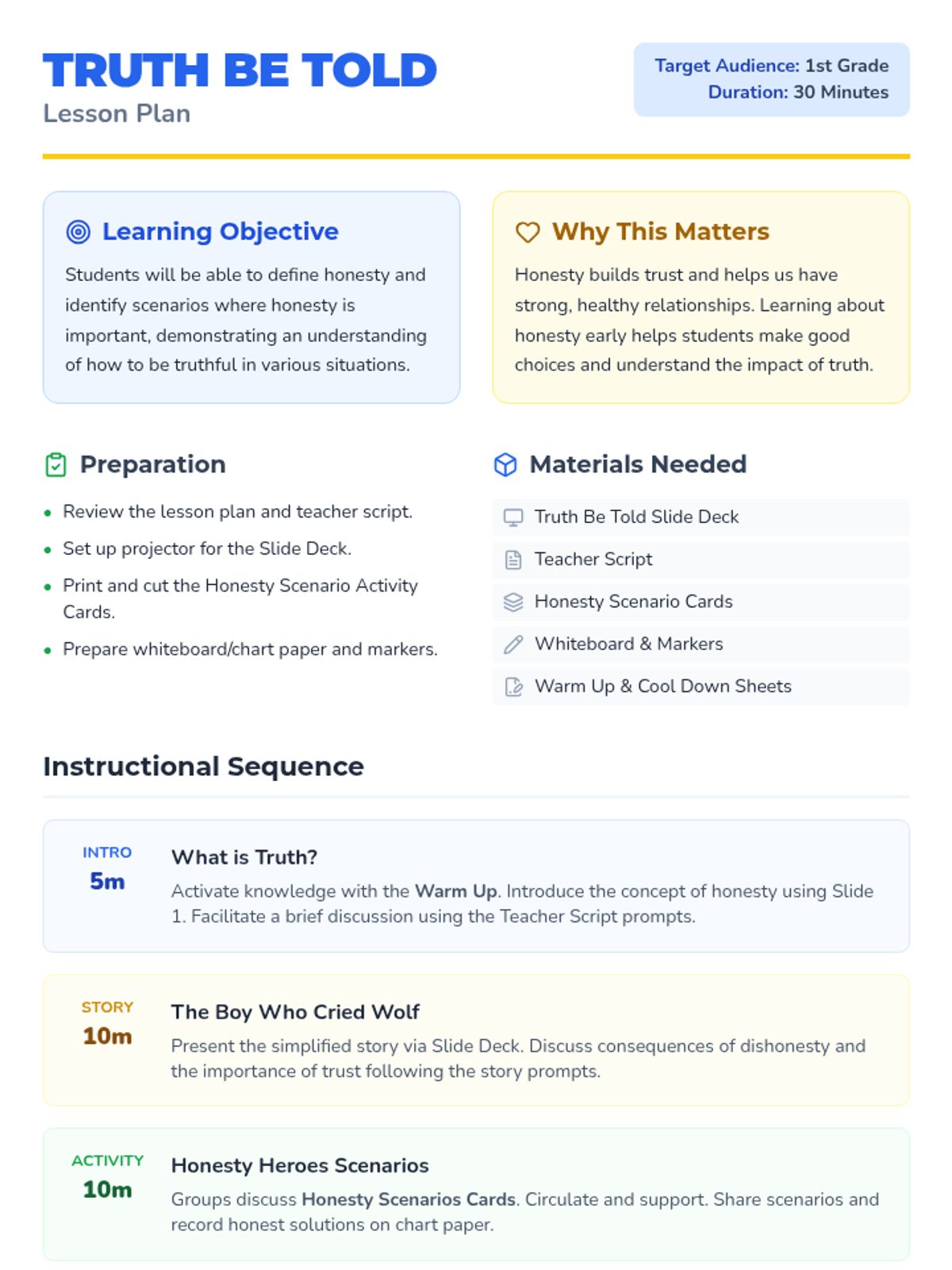 This lesson helps first-grade students understand what honesty is, why it's important, and how to practice it in their daily lives. Through the story of 'The Boy Who Cried Wolf' and interactive scenario cards, students learn to become 'Honesty Heroes'.