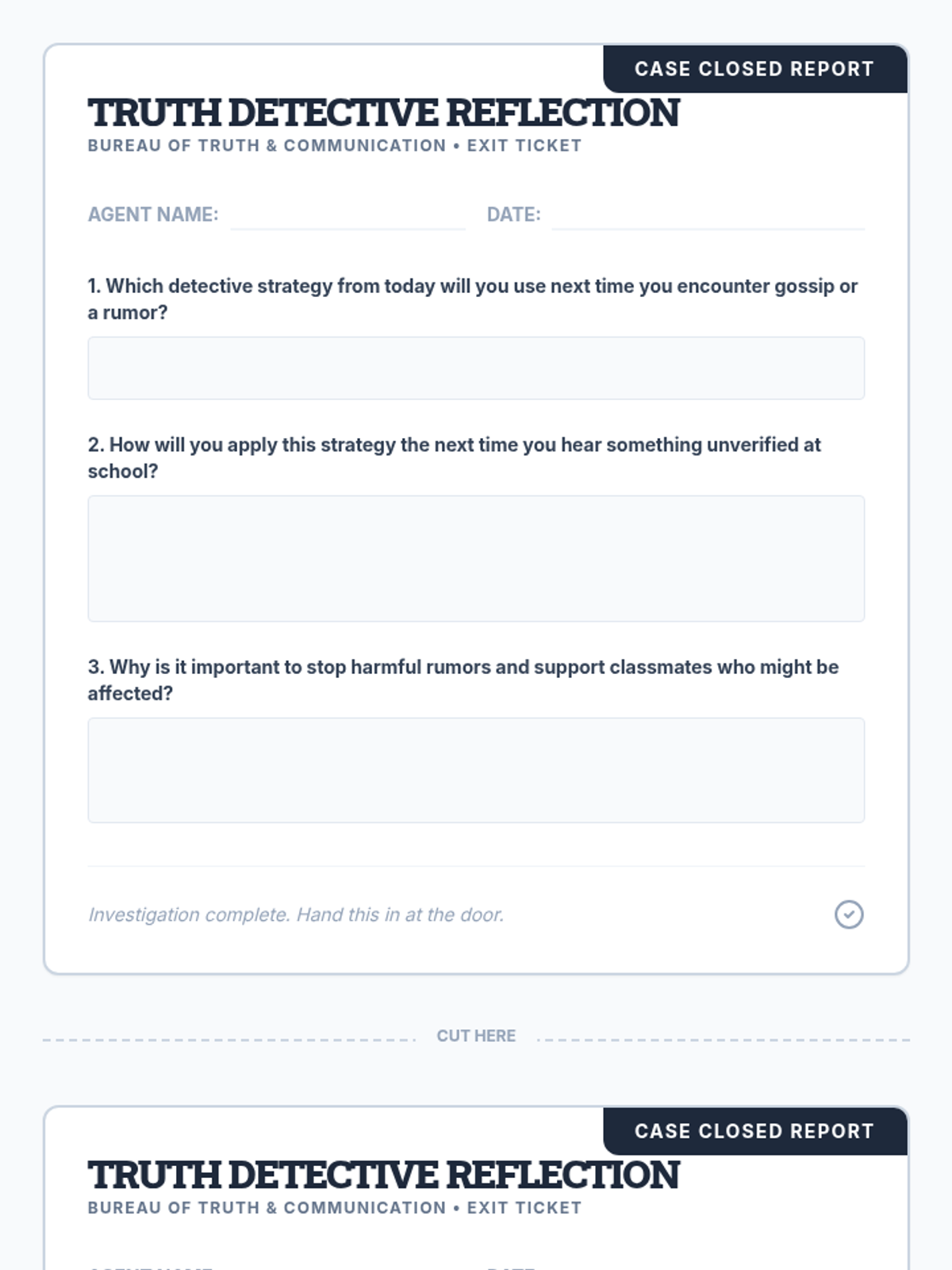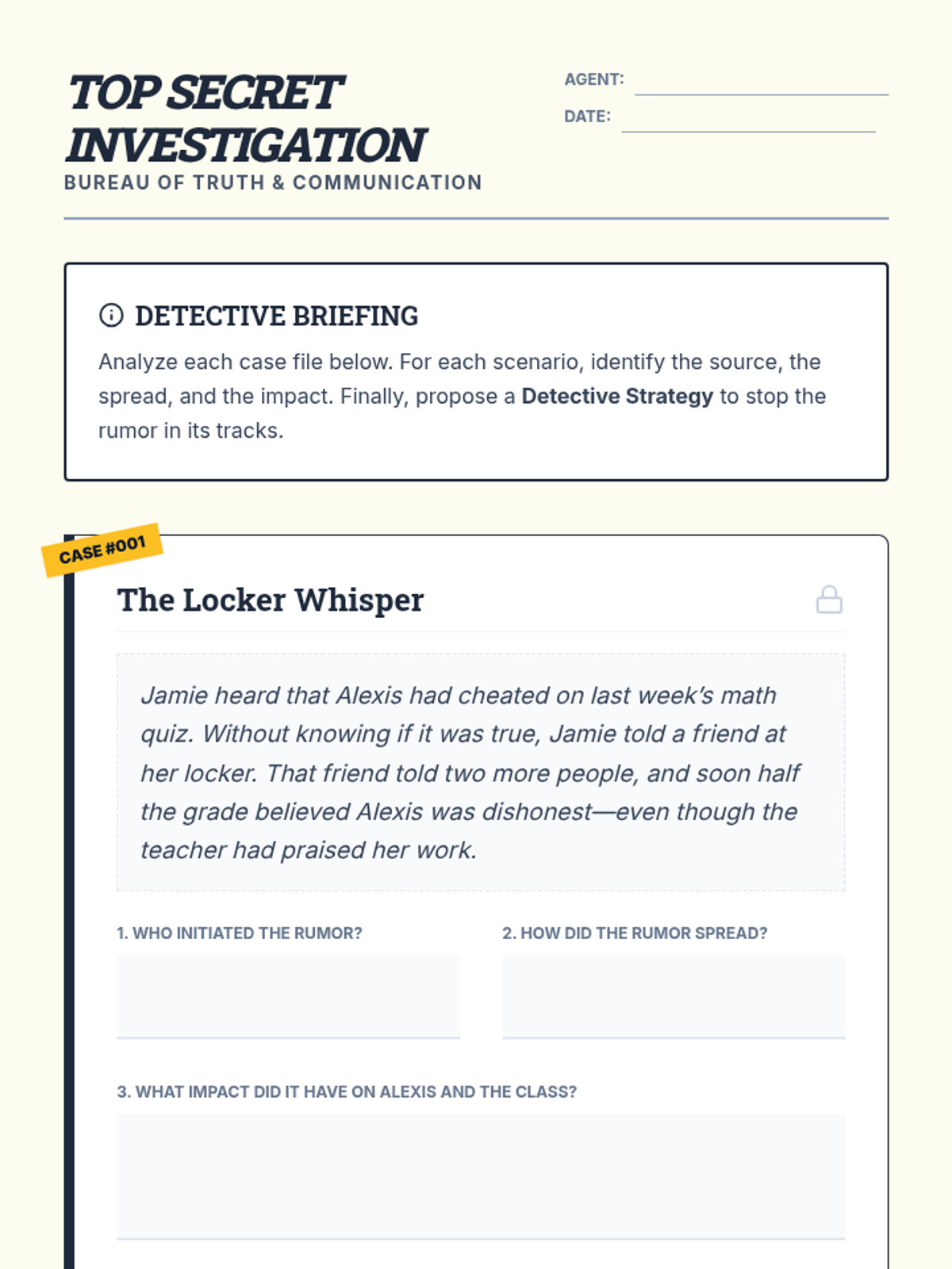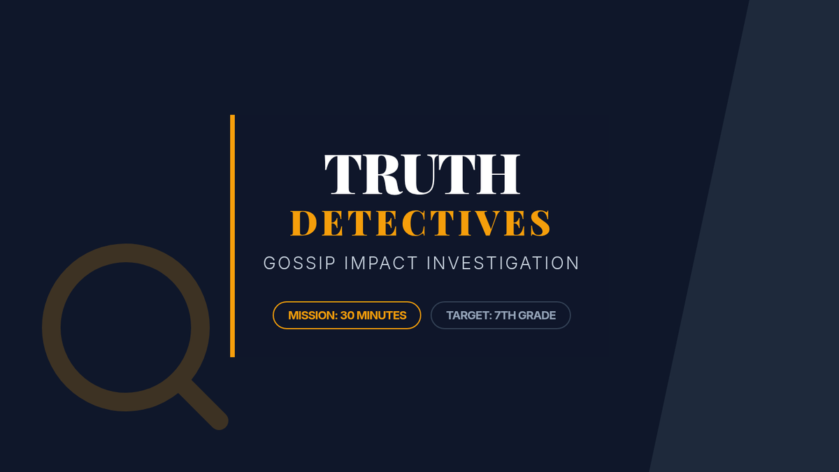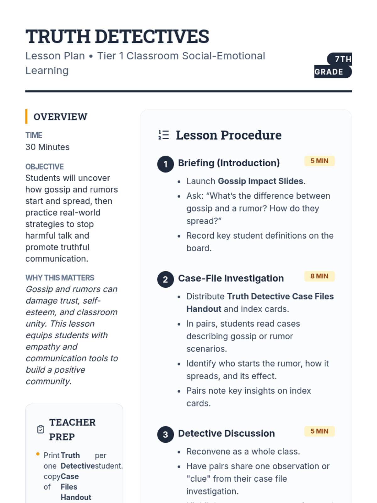 A 30-minute Tier 1 classroom lesson for 7th graders focused on identifying gossip and rumors, understanding their impact, and practicing strategies to stop their spread. Students act as 'Truth Detectives' to investigate case files and practice intervention techniques.