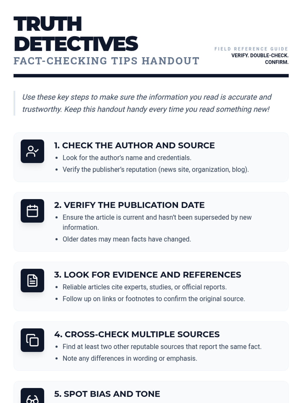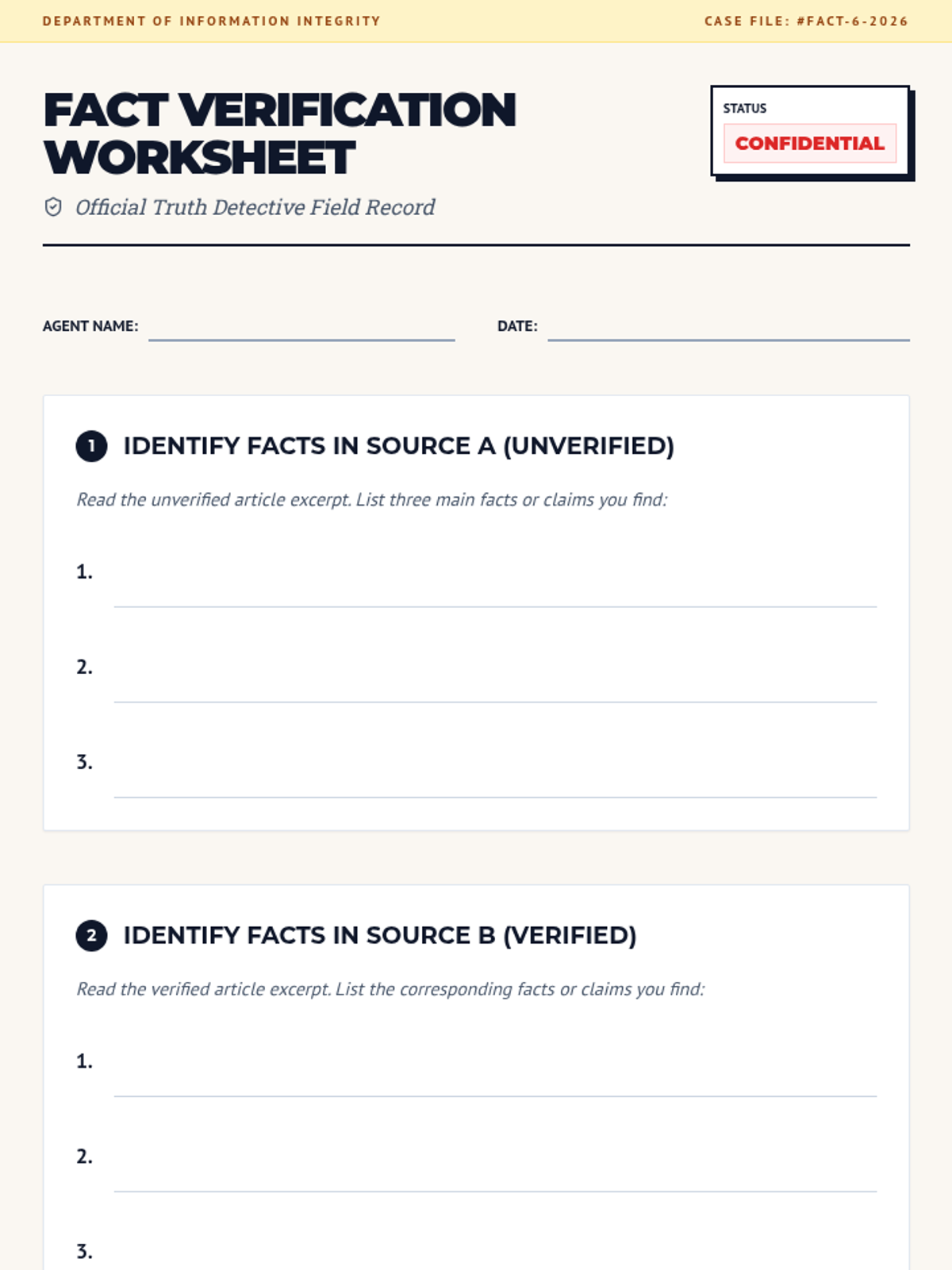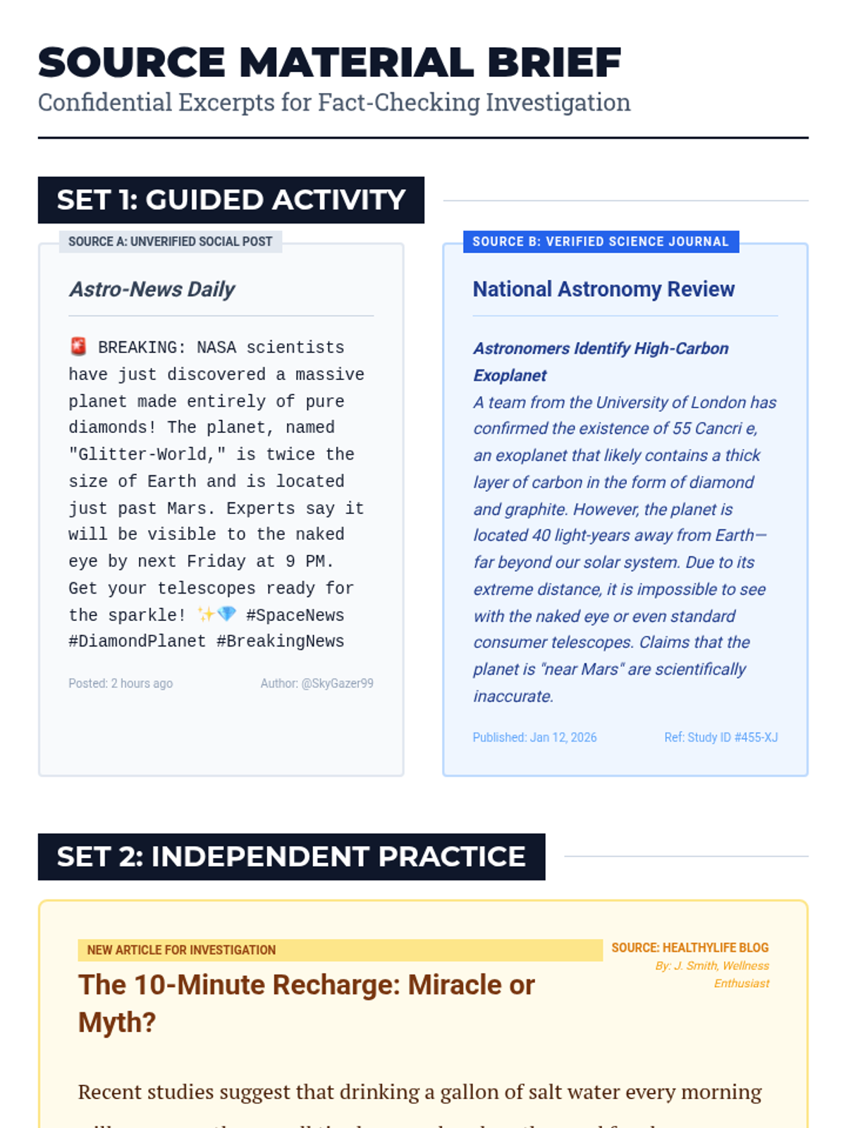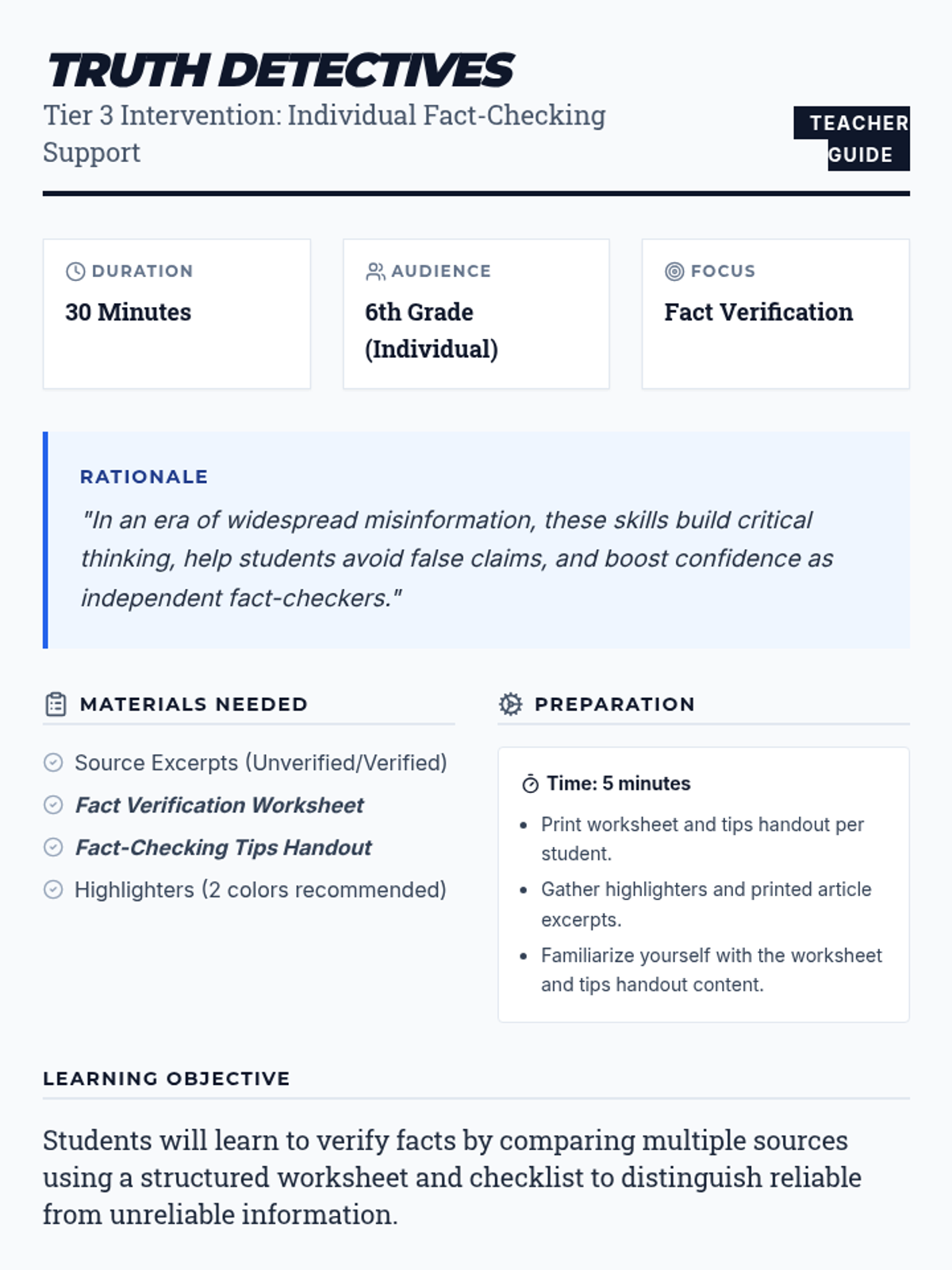 In this 30-minute individual support session, 6th graders will learn how to verify facts by comparing multiple sources. This Tier 3 lesson helps struggling readers develop critical thinking skills, avoid misinformation, and become confident fact-checkers.