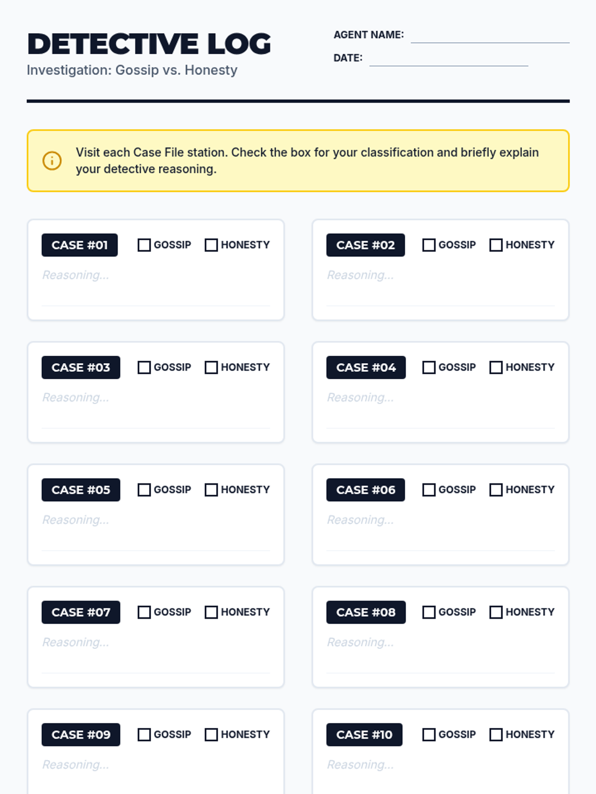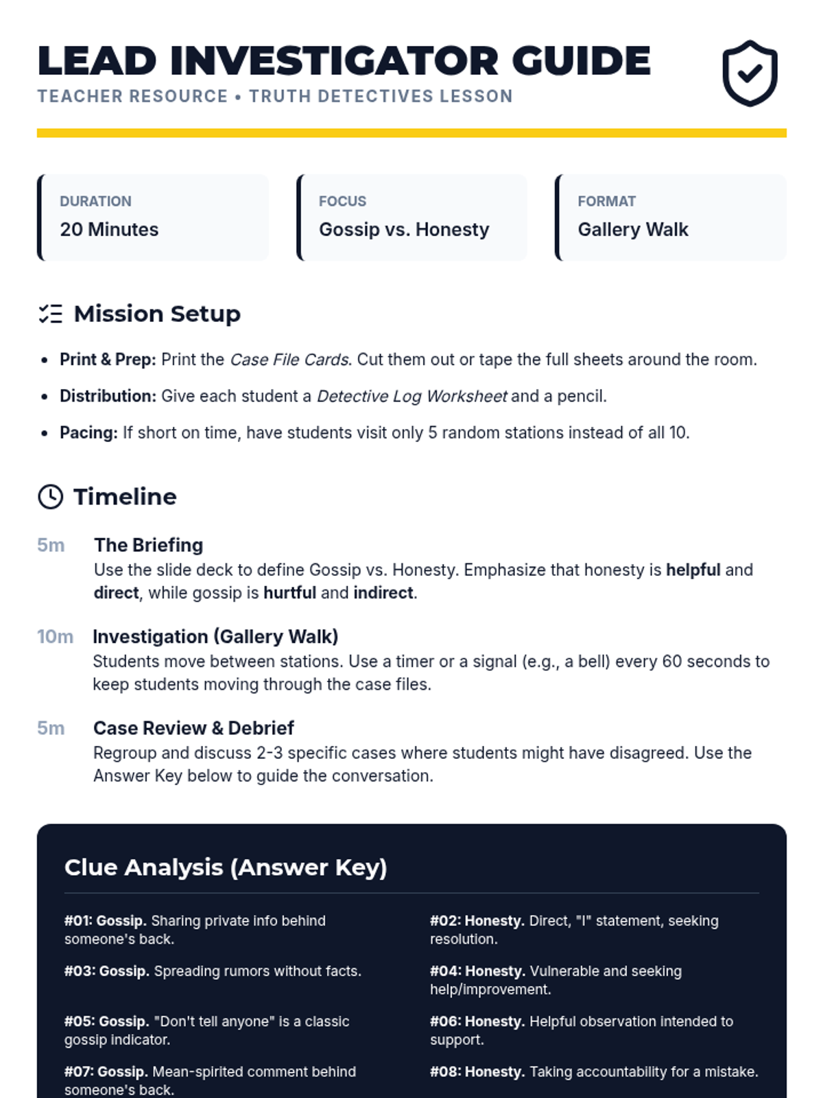 A quick, engaging lesson where students become 'Truth Detectives' to distinguish between harmful gossip and helpful honesty through a gallery walk sorting activity.