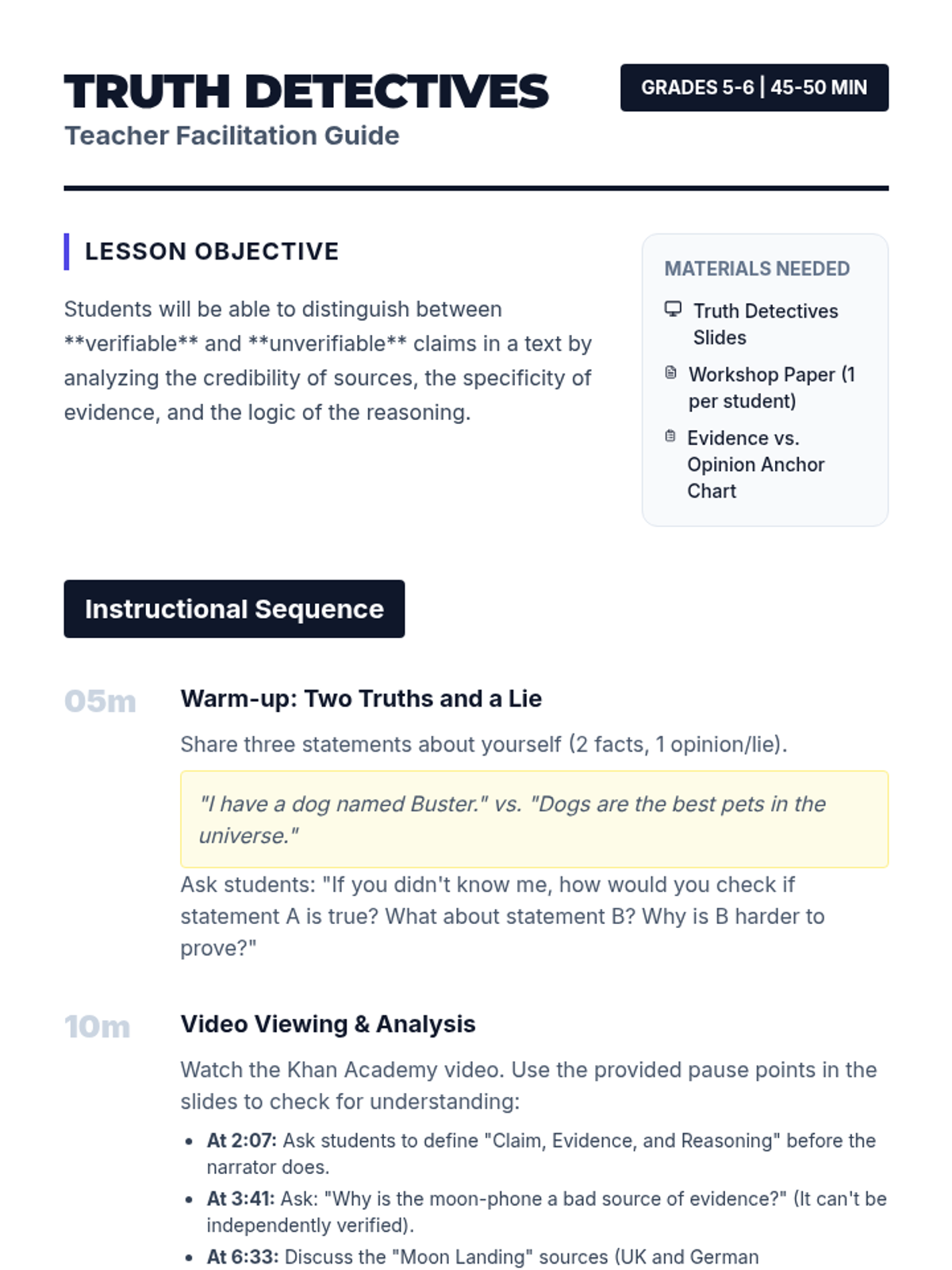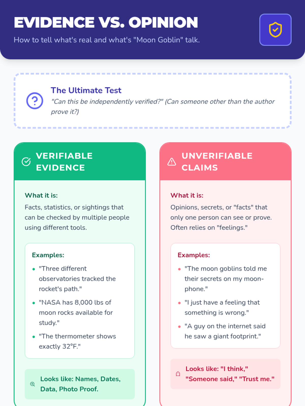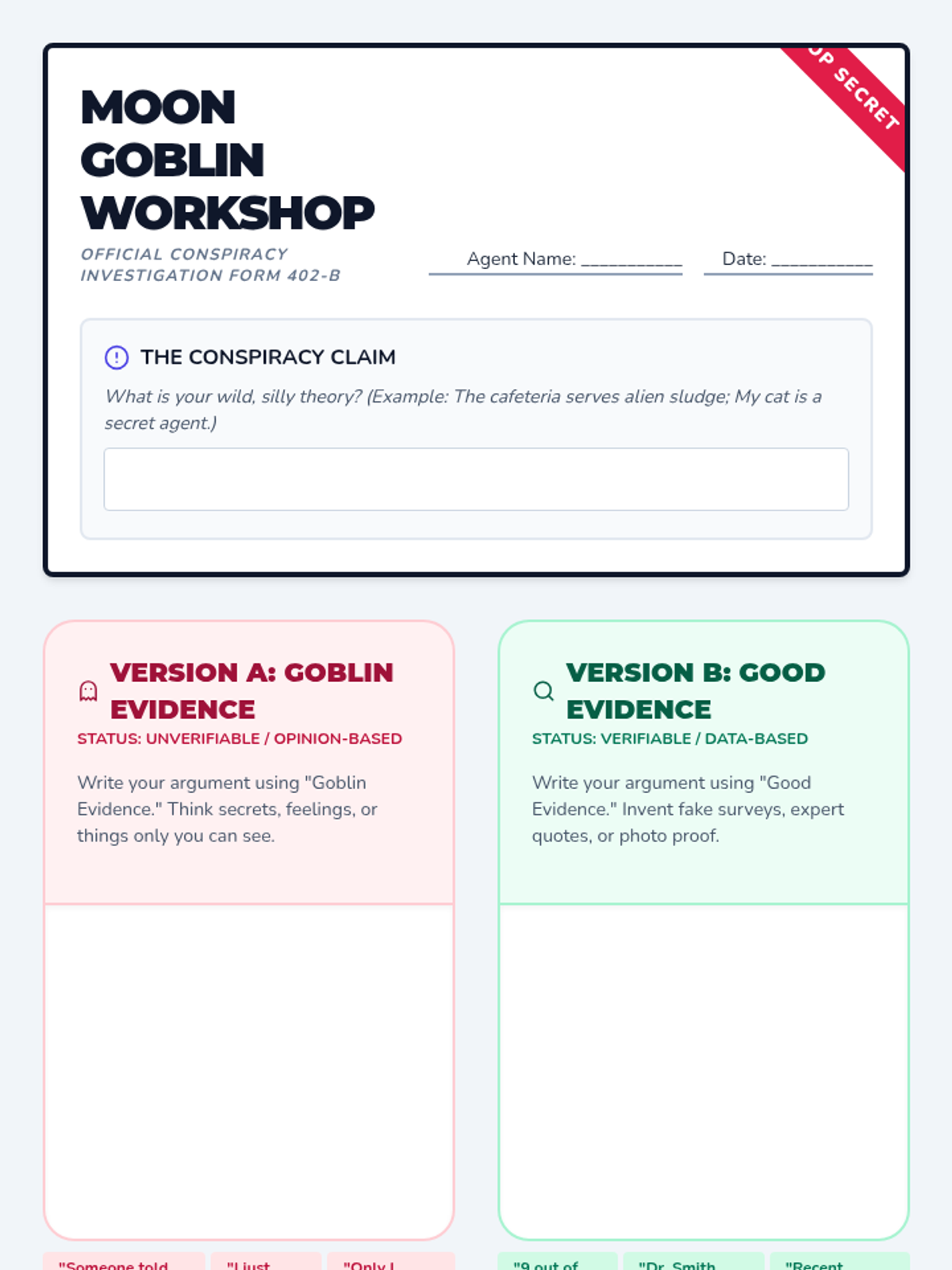 A lesson where students learn to distinguish between verifiable and unverifiable claims using the 'Moon Goblin' framework. Includes a video analysis, an anchor chart for identifying credible evidence, and a creative writing workshop where students build and debunk their own conspiracy theories.