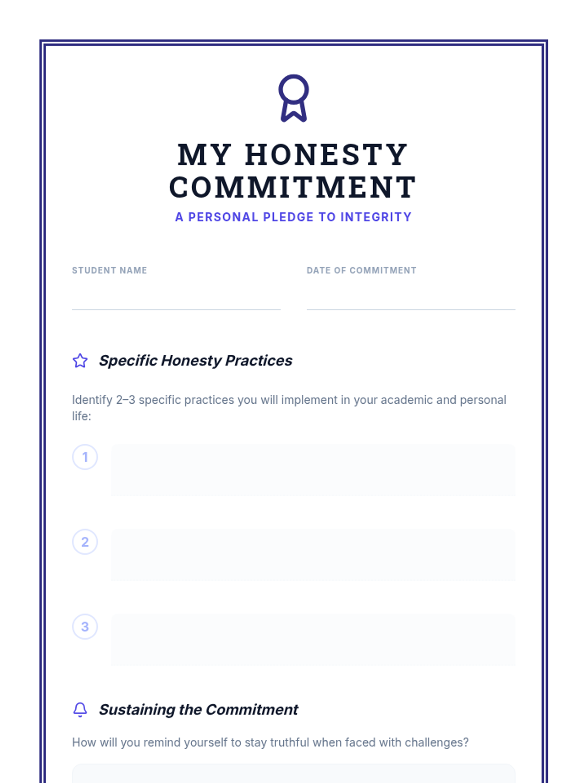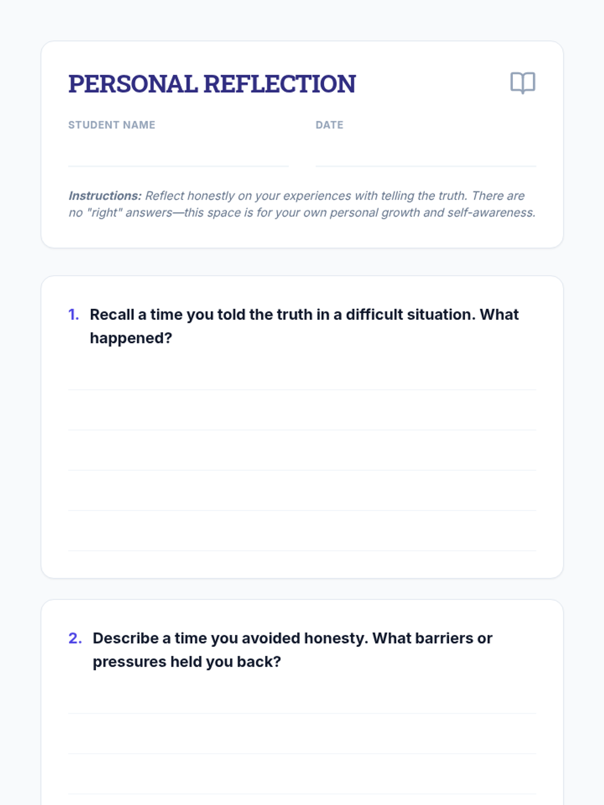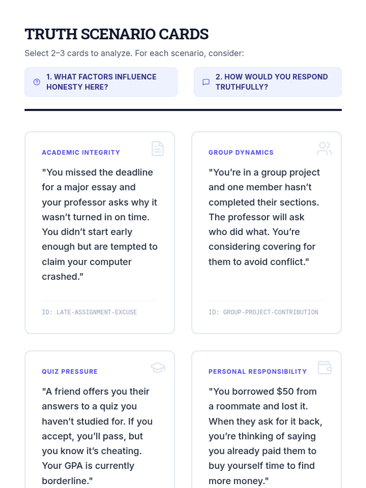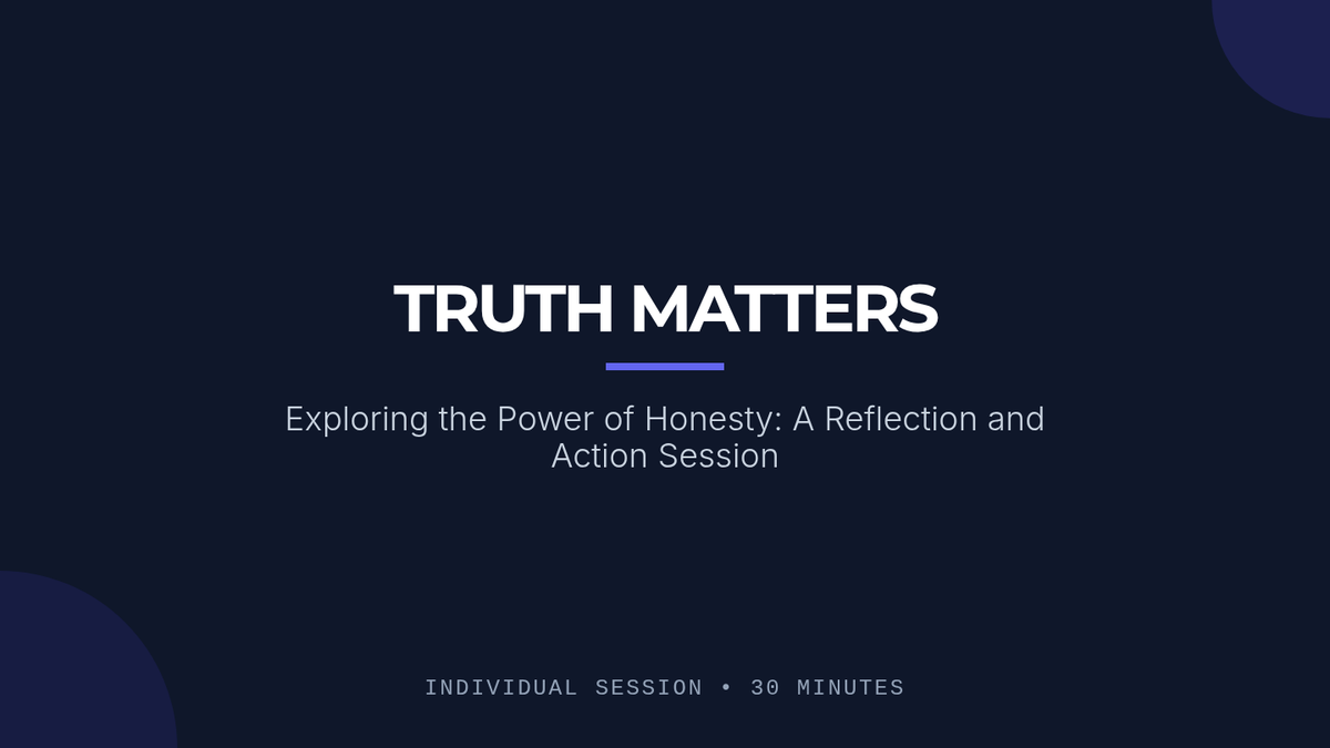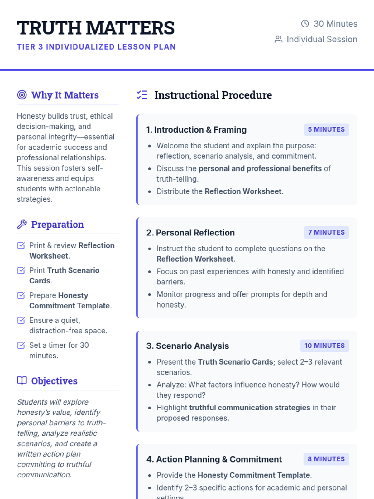 An intensive 30-minute individualized session for undergraduate students to explore honesty through personal reflection, scenario analysis, and action planning. This Tier 3 lesson helps students identify barriers to truth-telling and develop a personal honesty commitment.