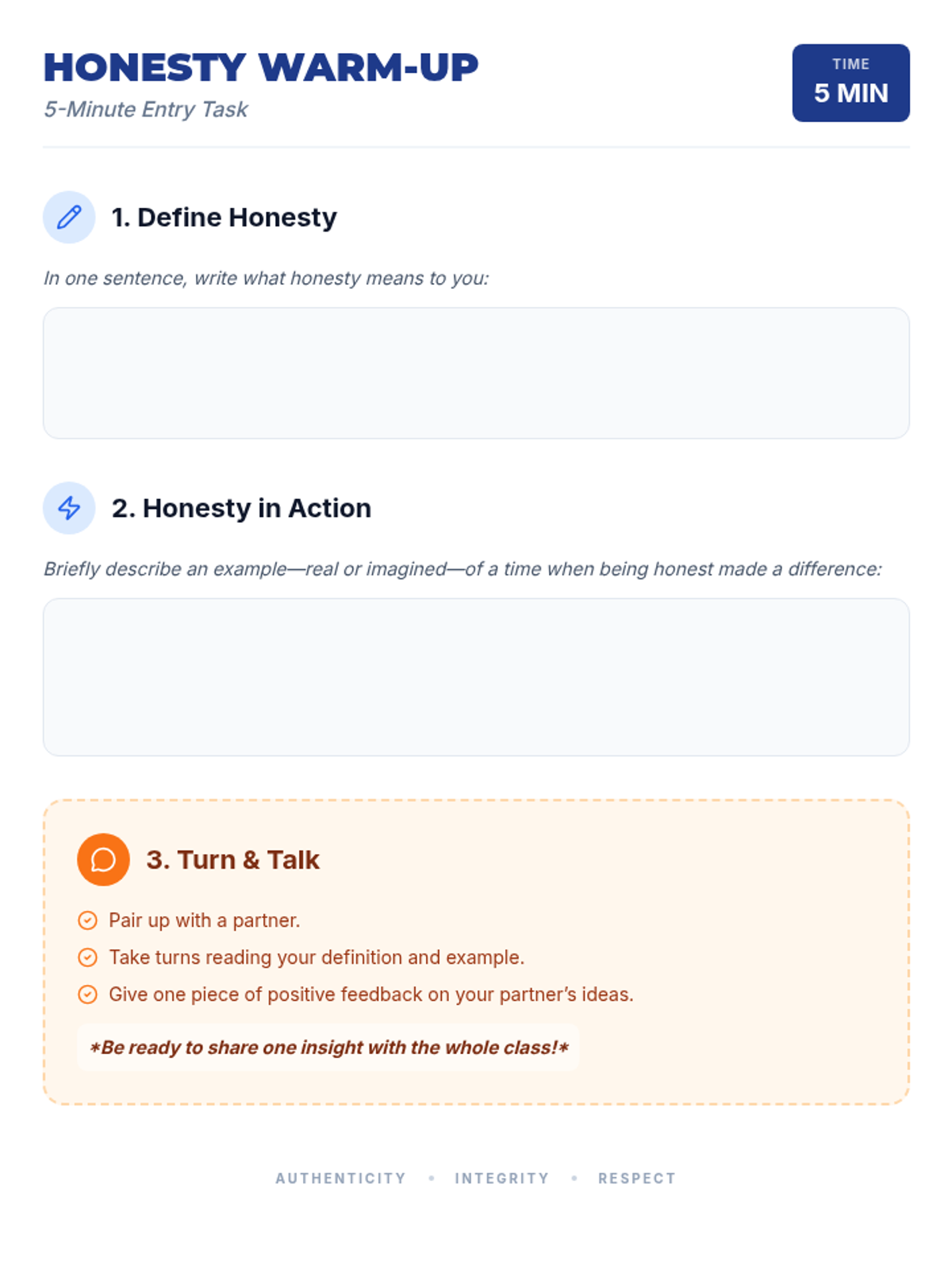 A concise 15-minute introduction to classroom norms centered on the core values of Respect, Integrity, and Safety. Students will define these values and commit to a shared culture of success.