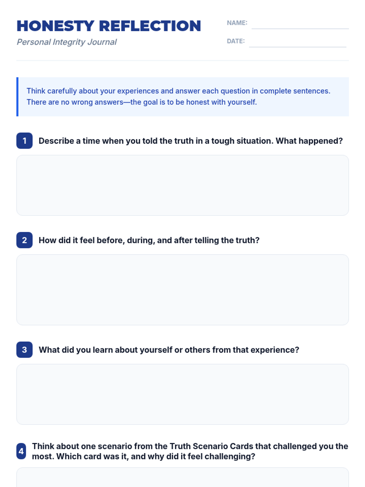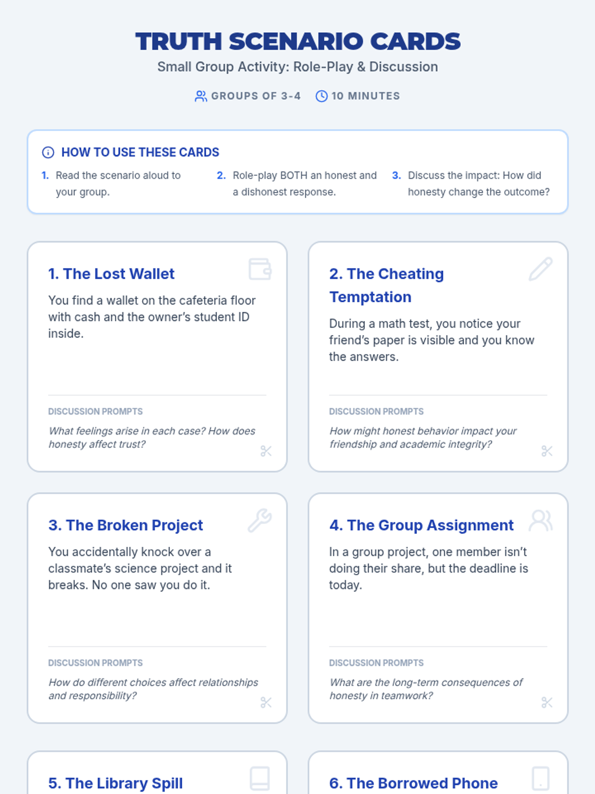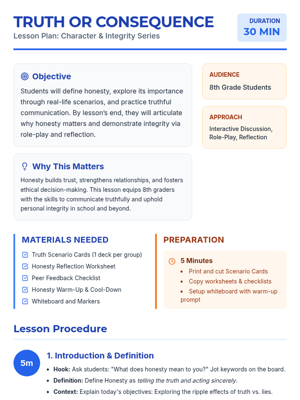 In this 30-minute lesson, 8th graders explore honesty, understand its impact on trust and relationships, and practice truthful communication through role-play and reflection.