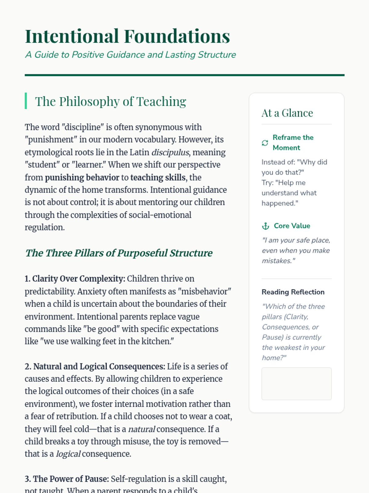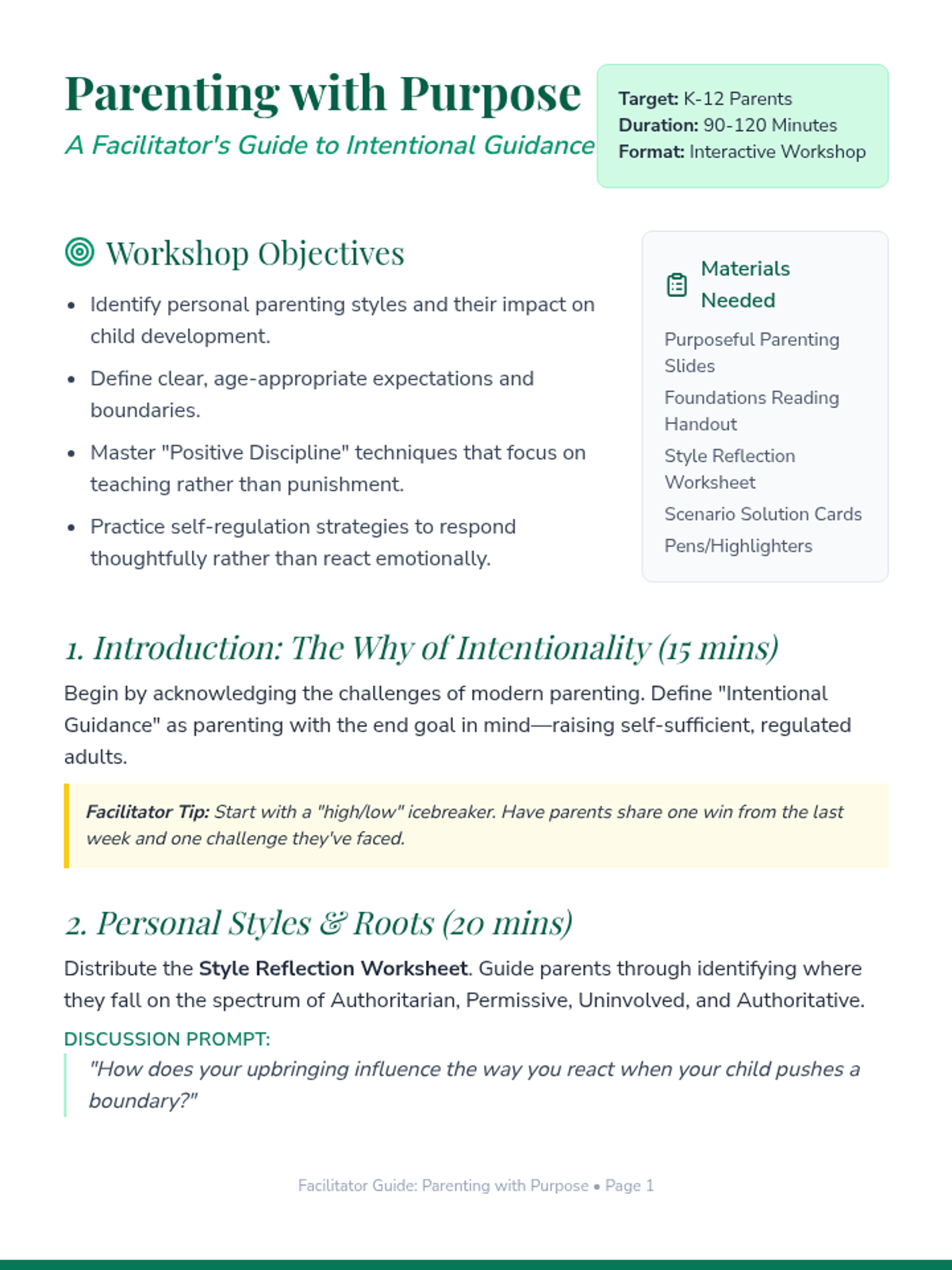 A comprehensive workshop for parents focused on intentional guidance, positive discipline, and building a structured yet loving home environment. This lesson equips parents with practical tools for managing behaviors while nurturing their child's self-regulation.