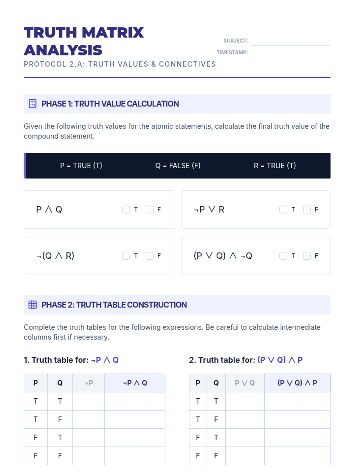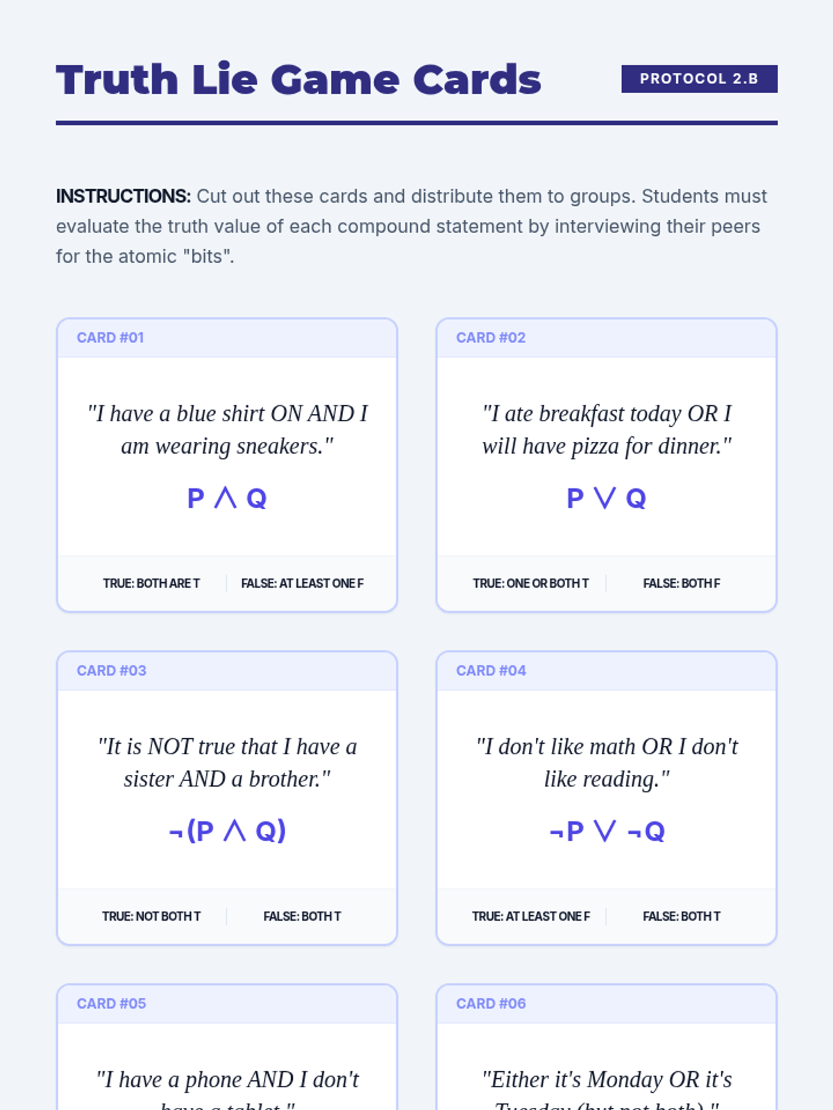 This lesson defines the truth conditions for 'and', 'or' (inclusive vs. exclusive), and 'not'. Students build basic truth tables to understand how the truth value of a complex statement depends on its parts. Small groups compete to solve truth-value scenarios.