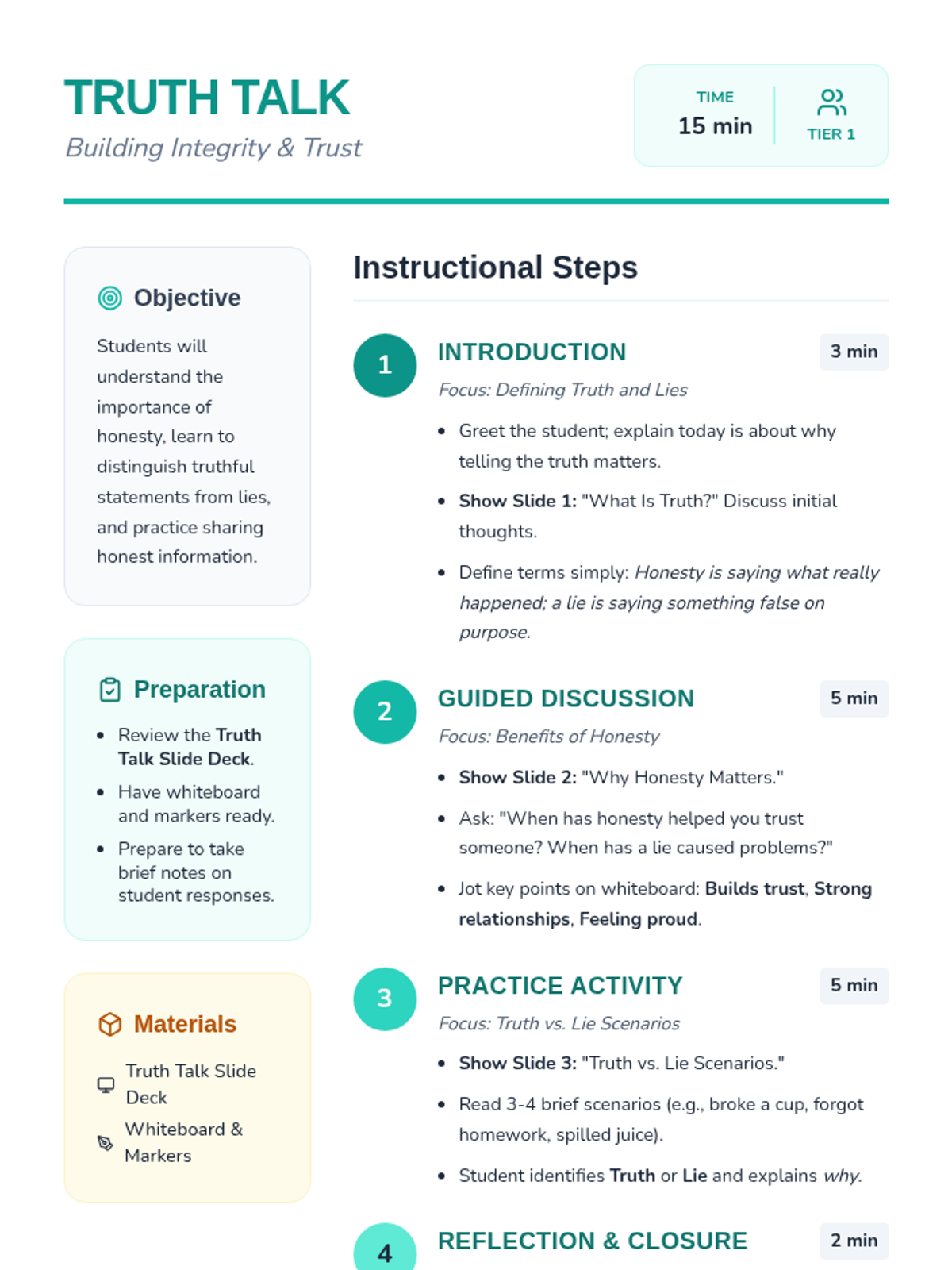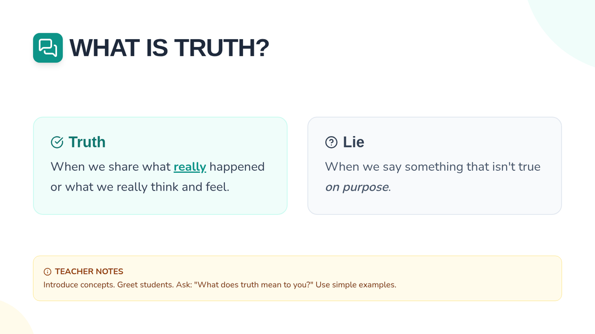 A 15-minute introductory lesson on honesty, helping students distinguish between truth and lies while understanding why integrity builds trust.