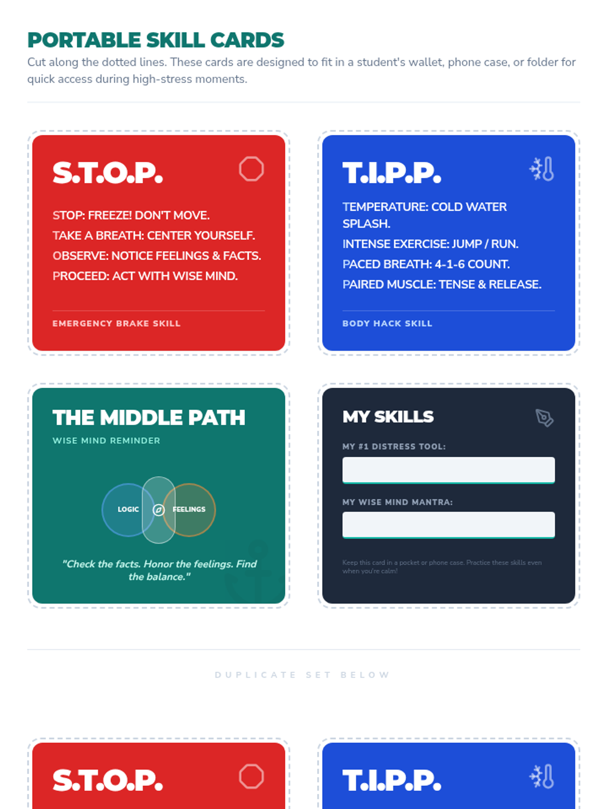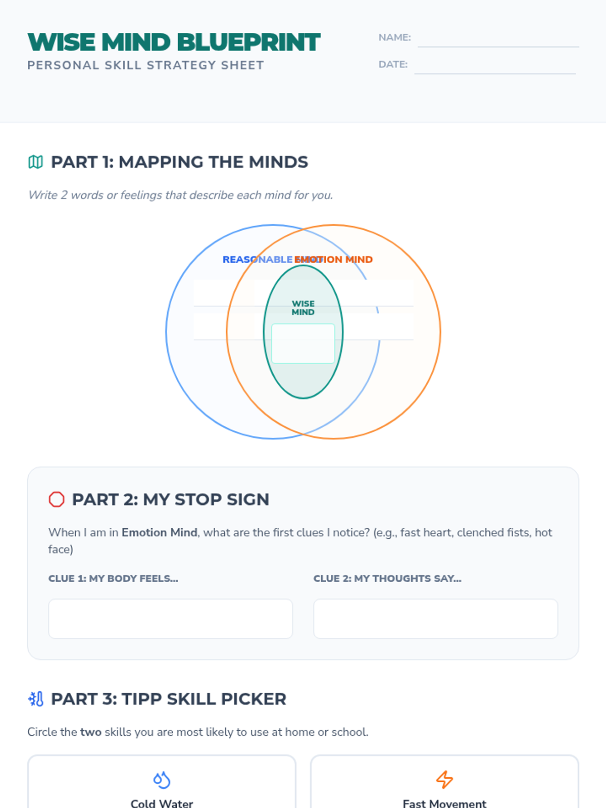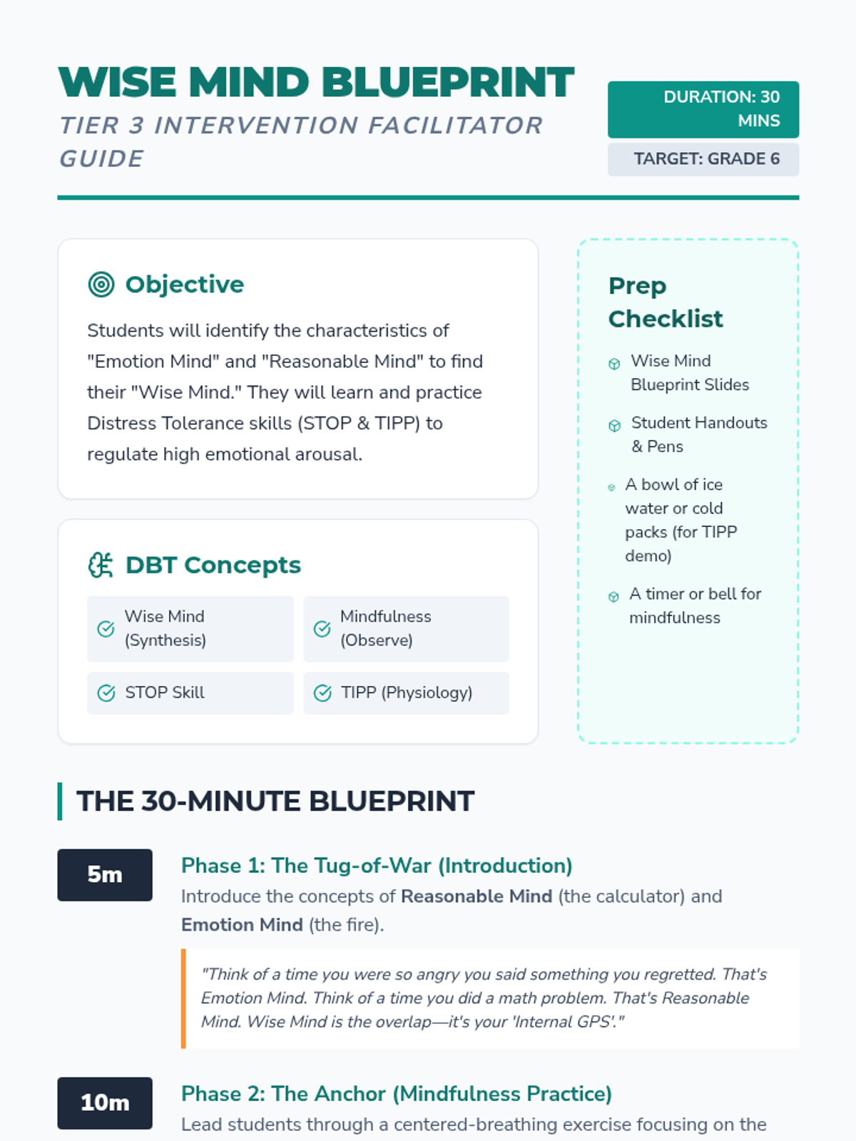 A Tier 3 intervention lesson for 6th graders focusing on the DBT Wise Mind concept, balancing logic and emotion, and practicing distress tolerance skills like STOP and TIPP.