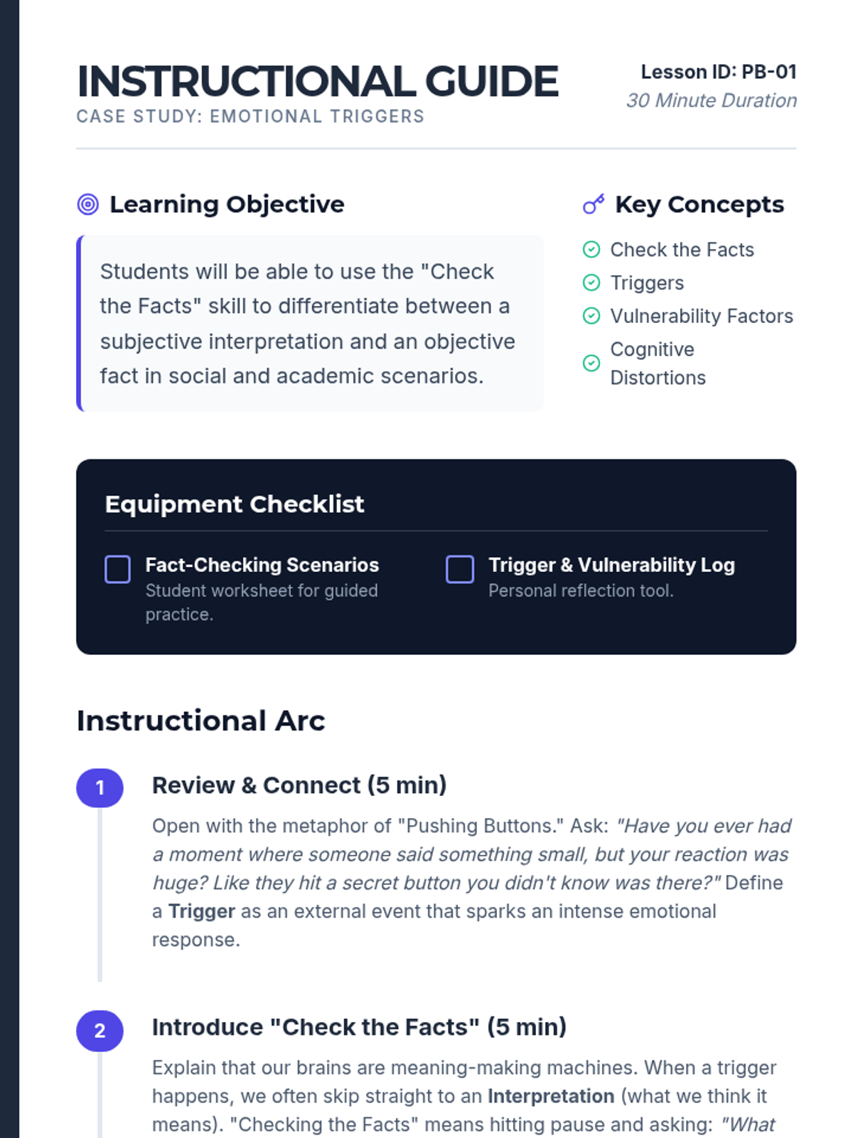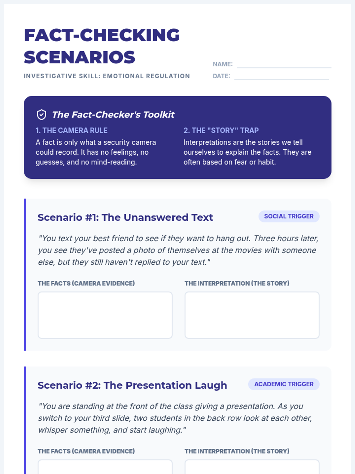 An 8th-grade SEL lesson focused on emotional regulation through 'Checking the Facts'. Students learn to identify personal triggers and differentiate between objective facts and subjective interpretations to manage intense emotions.