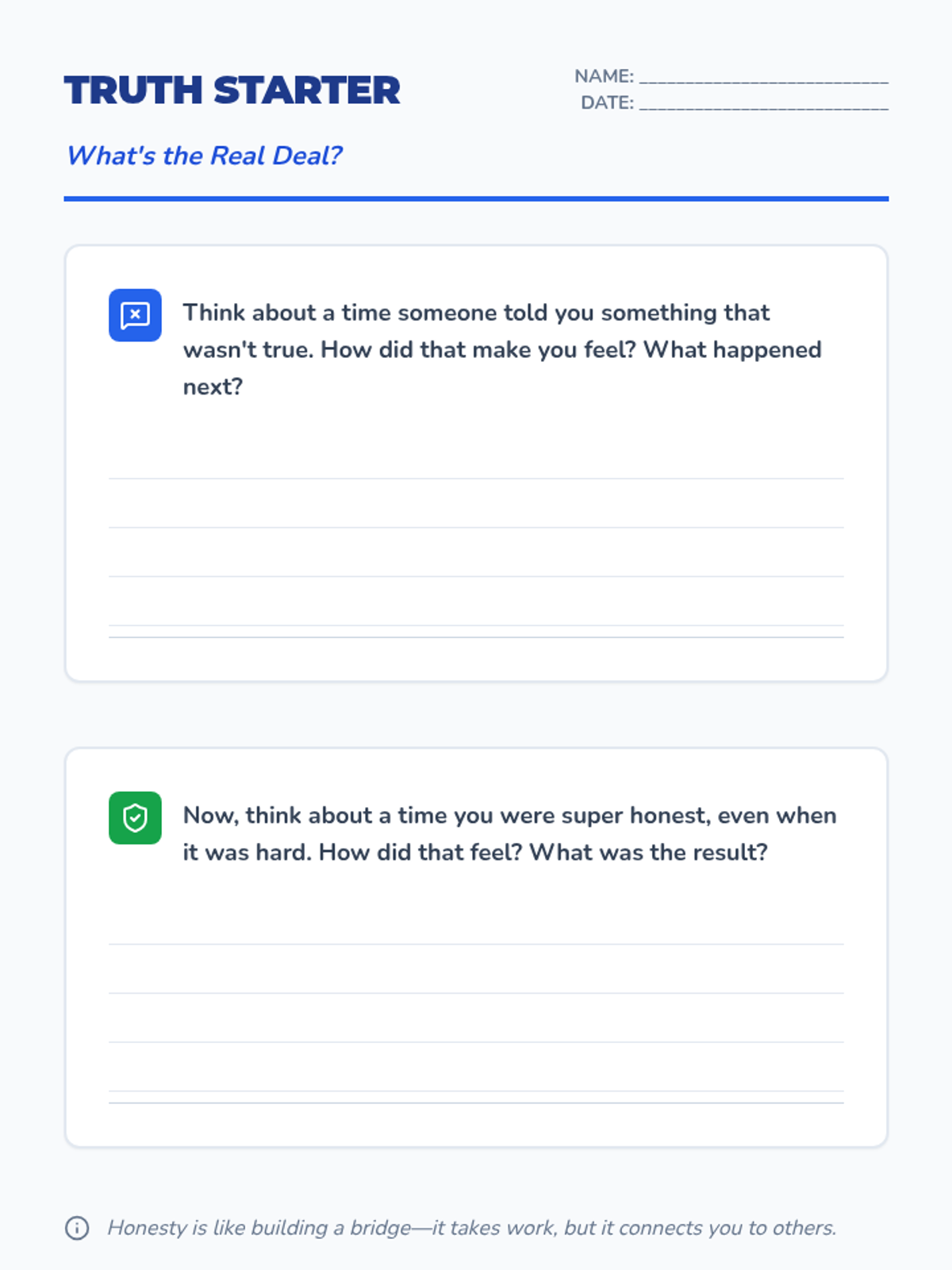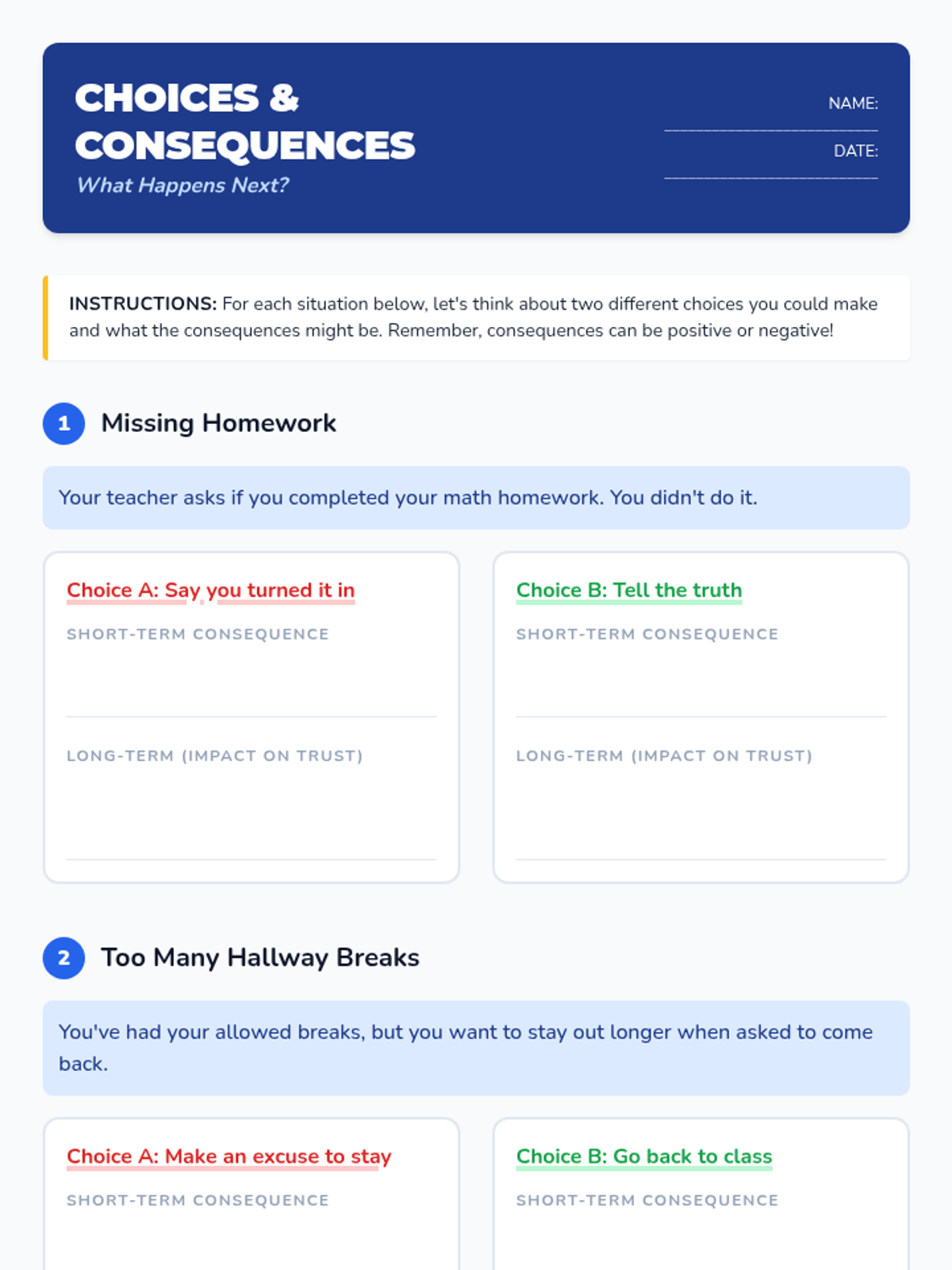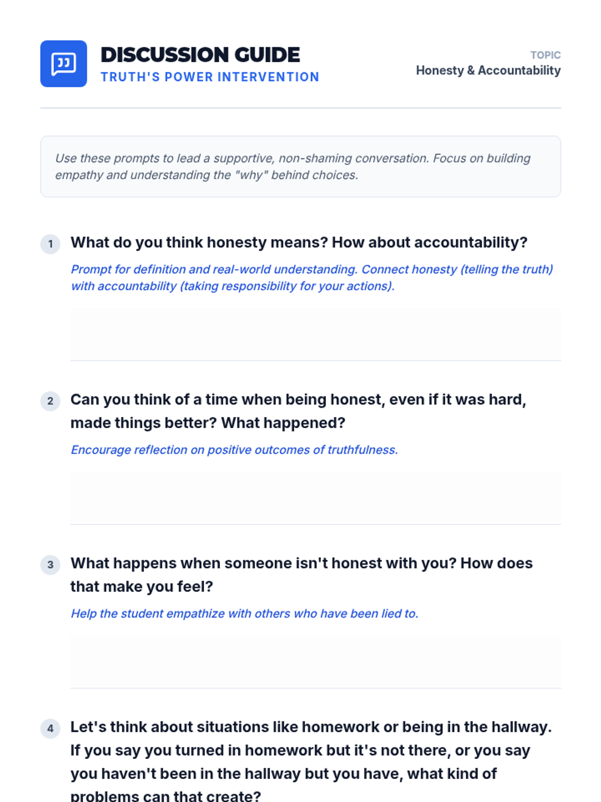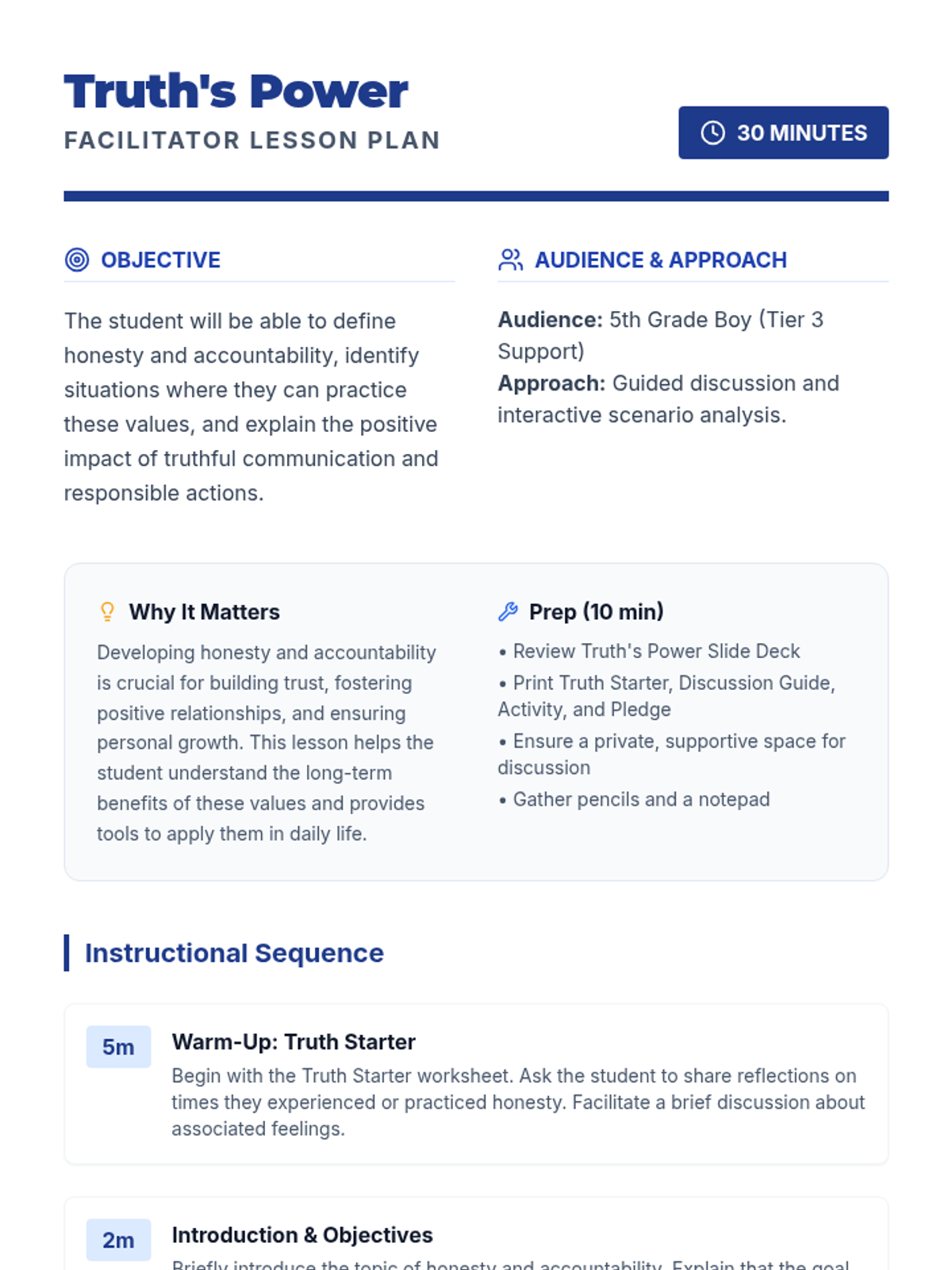 This individual 30-minute lesson for a 5th-grade boy focuses on honesty and accountability through guided discussion and interactive scenario analysis.
