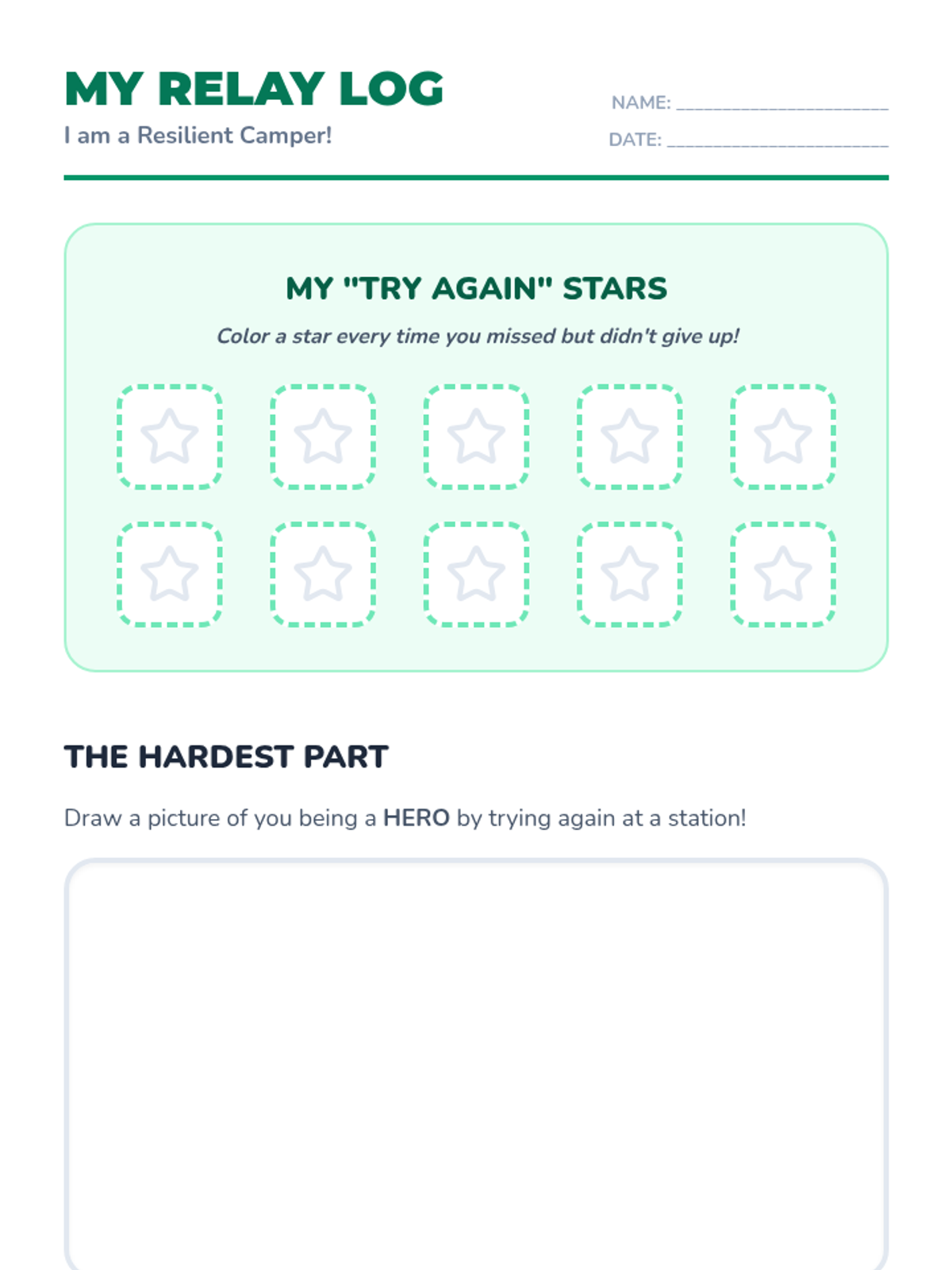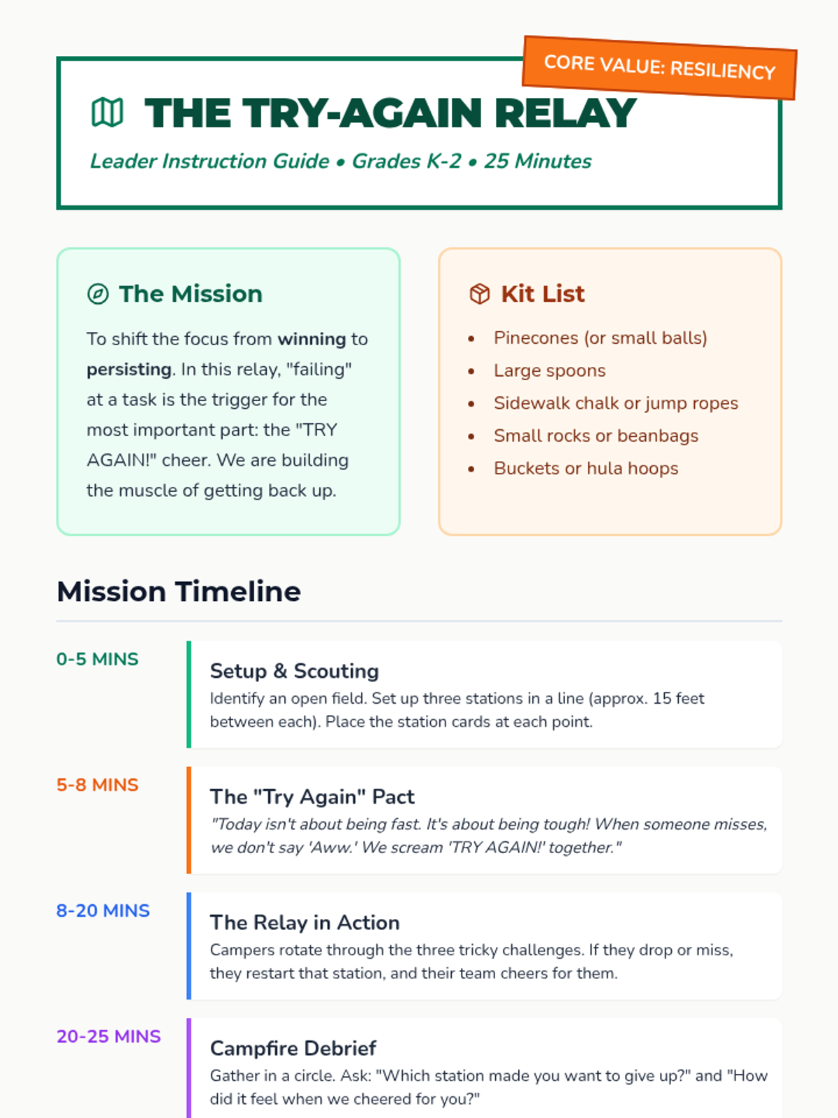A high-energy, outdoor relay lesson focused on building resiliency in K-2 campers. Leaders facilitate stations where mistakes are celebrated with a 'TRY AGAIN!' cheer, shifting the focus from winning to persistence.