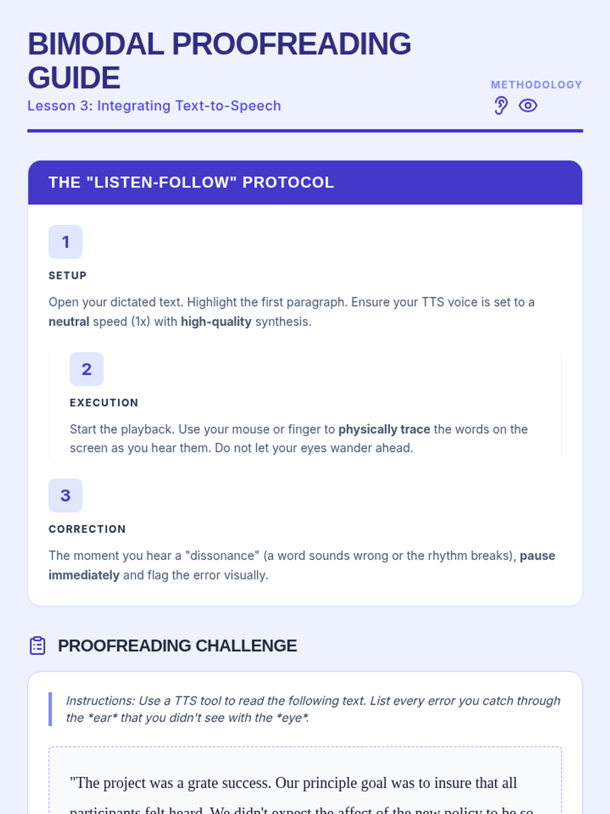 Master the 'bimodal' proofreading technique using Text-to-Speech (TTS). This lesson demonstrates how auditory feedback catches rhythm and word choice errors missed by visual scanning.