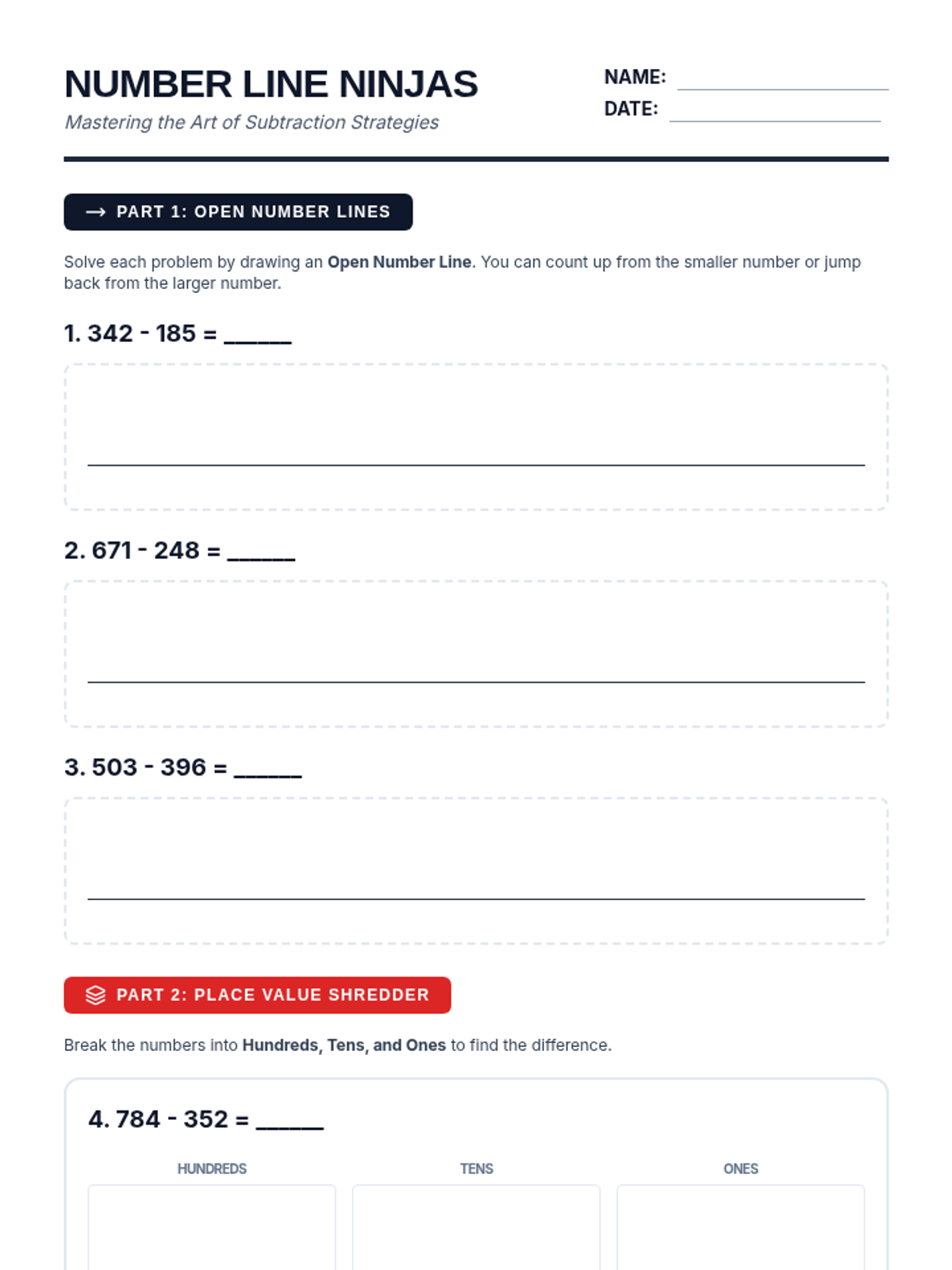 A high-energy 3rd-grade lesson focused on mastering subtraction using open number lines and place value decomposition strategies. Students progress from visual counting up to abstract mental decomposition.