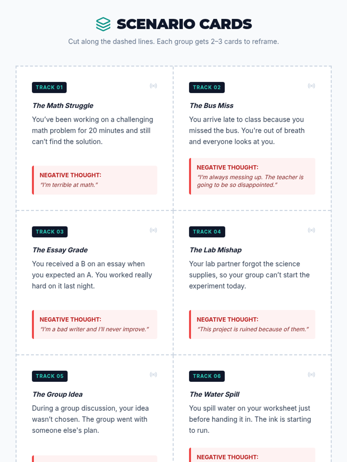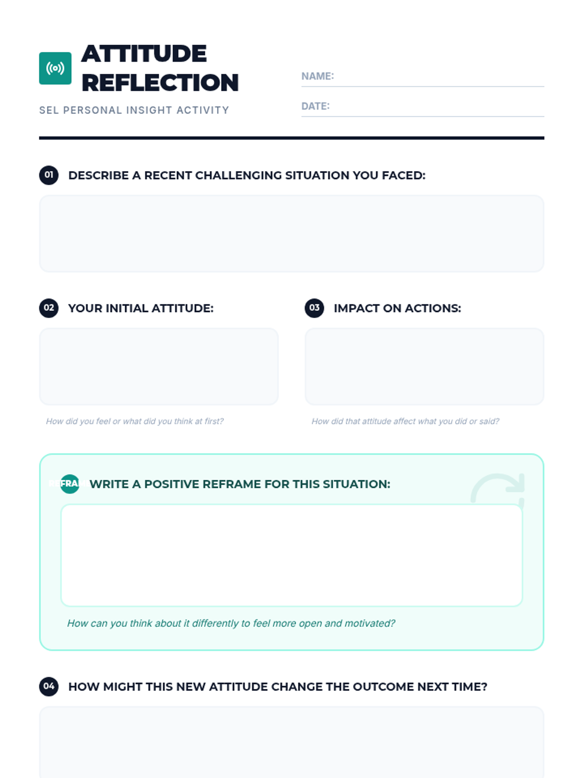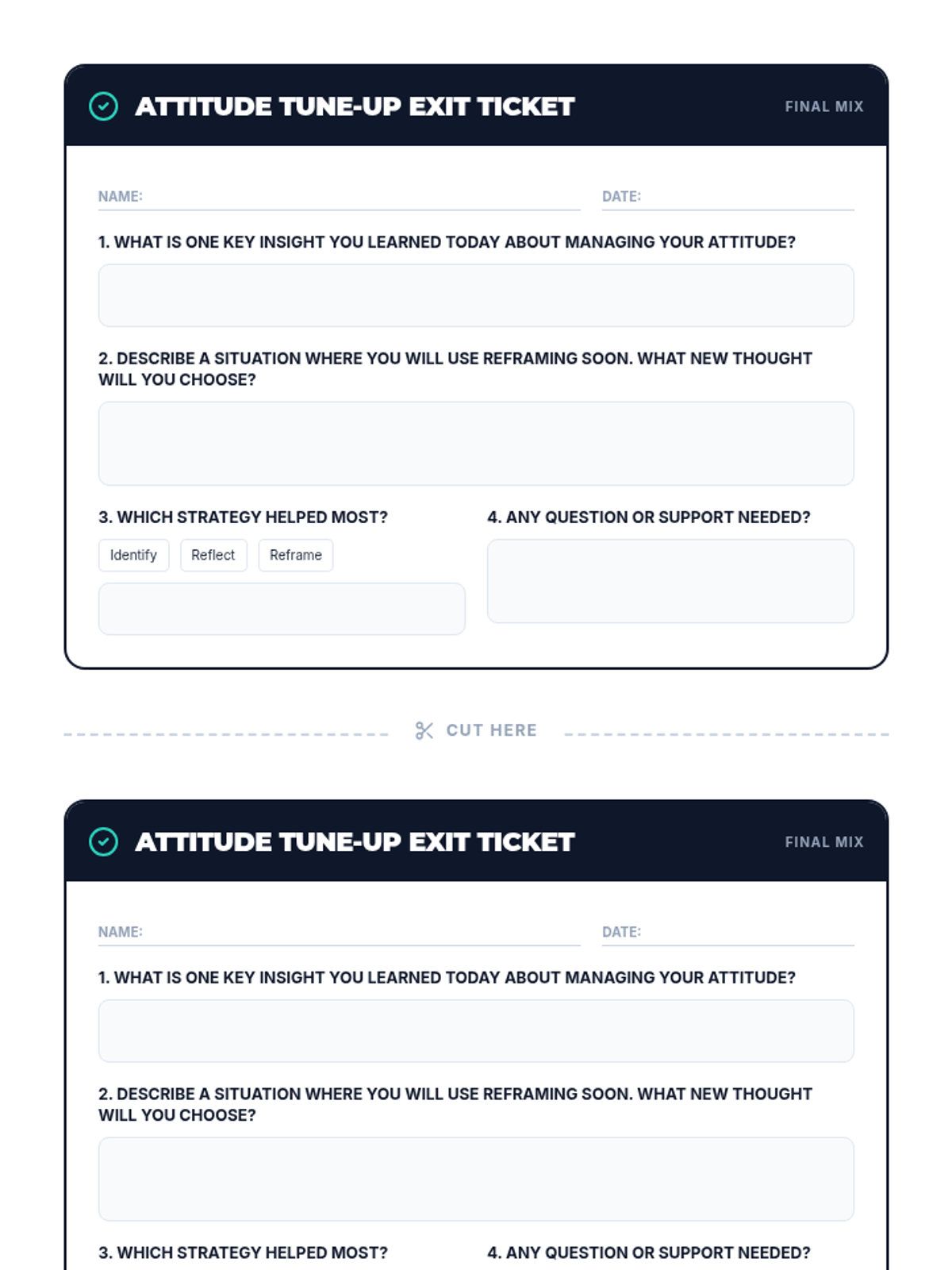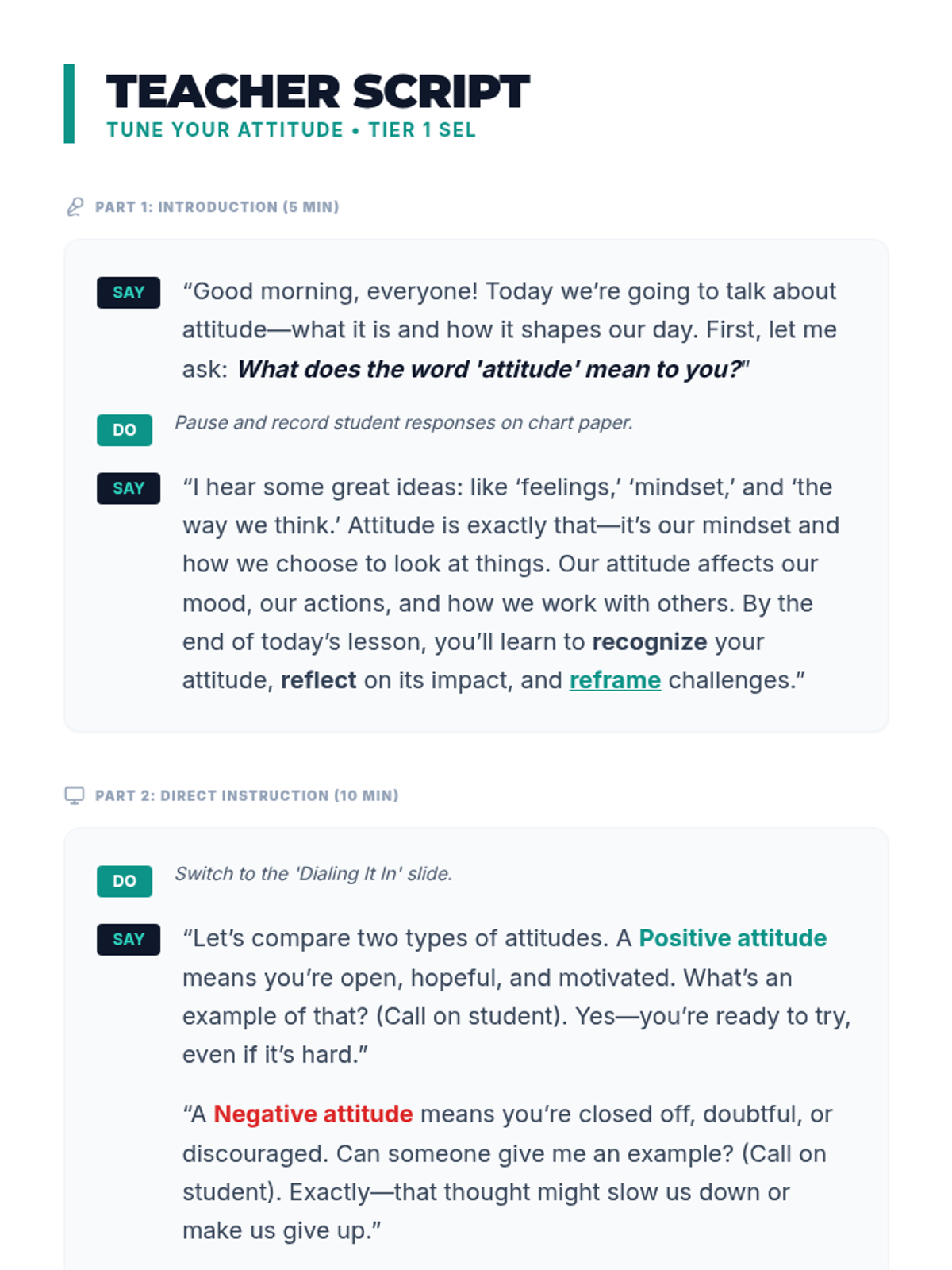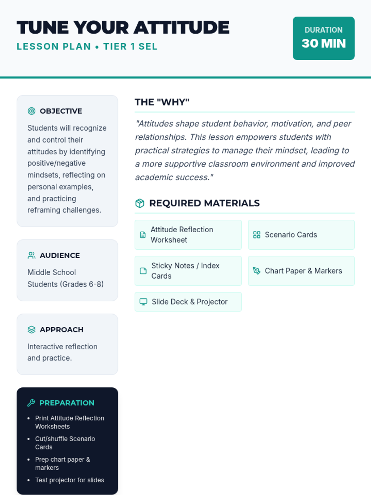 A 30-minute Tier 1 lesson for middle schoolers focusing on identifying, reflecting, and reframing attitudes to build a positive classroom community. Students learn to shift from negative to positive mindsets through interactive practice.