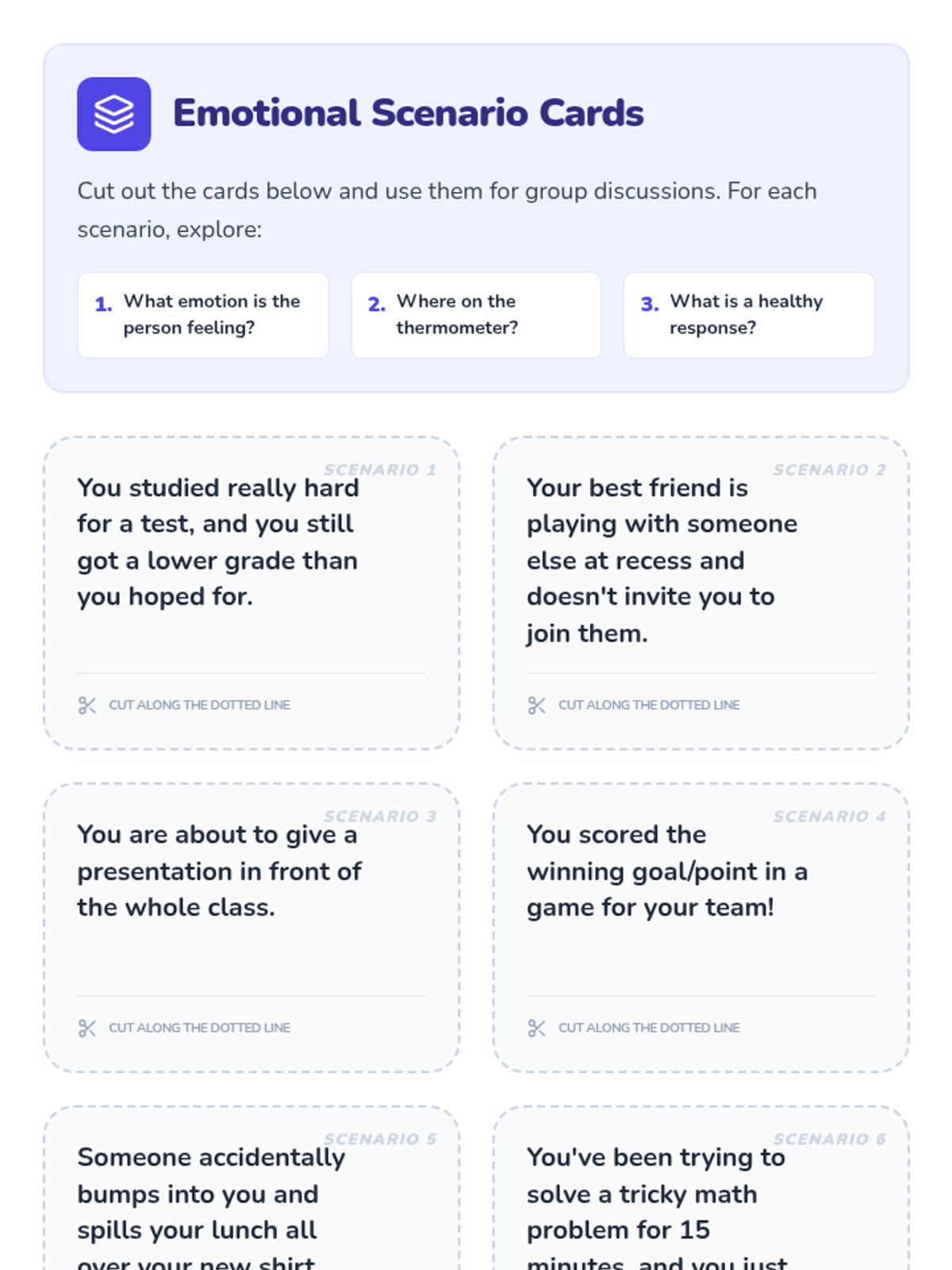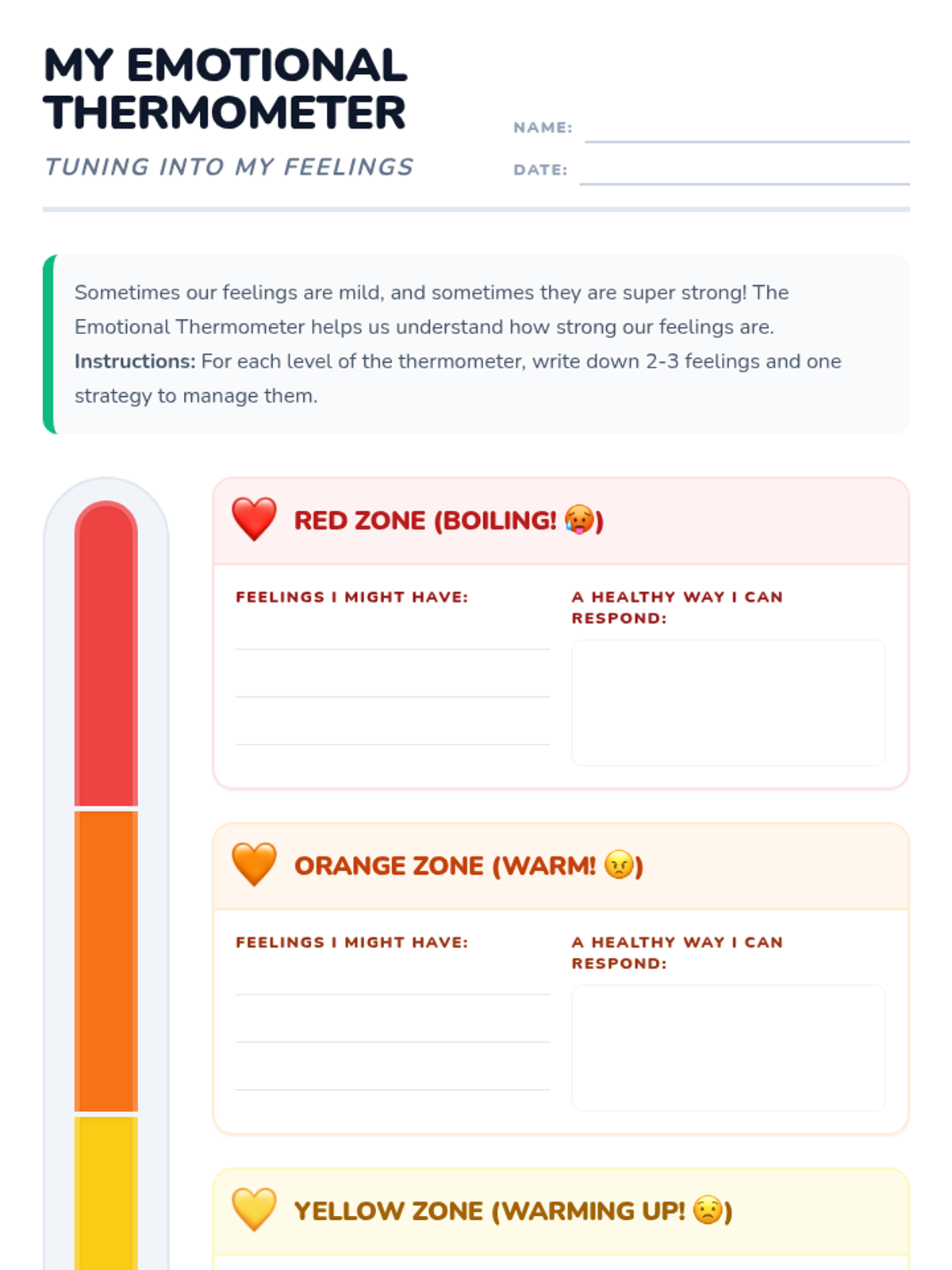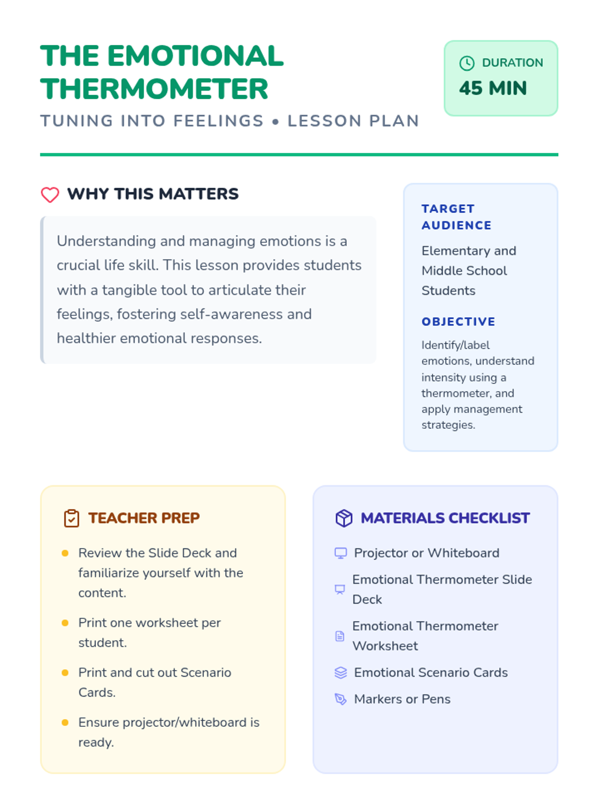 A lesson designed to help students develop emotional literacy by identifying and labeling feelings using a visual thermometer, fostering self-awareness and healthy emotional regulation strategies.