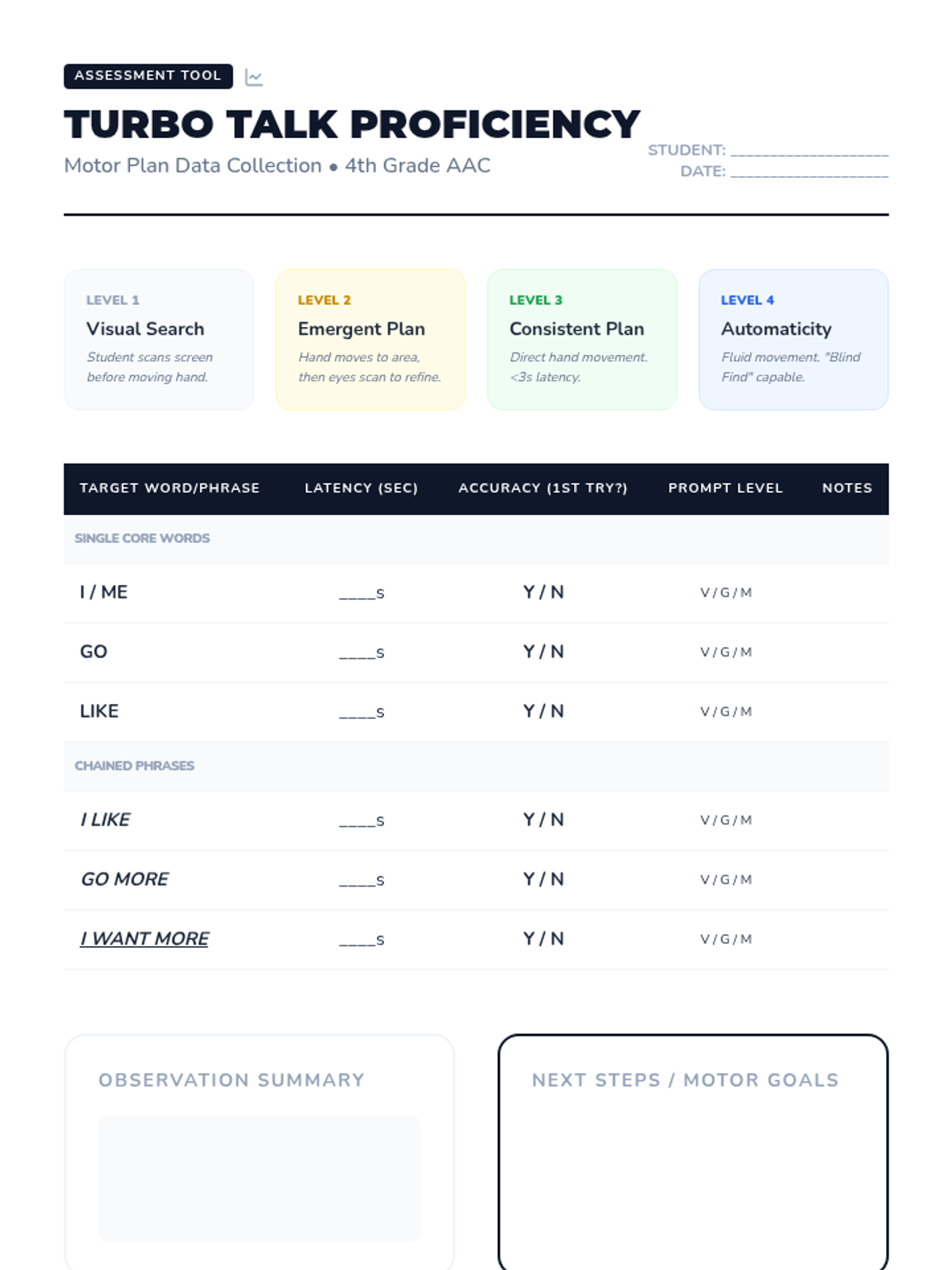 Cumulative review and assessment of motor plan automaticity through timed challenges. Data collection on speed and accuracy.