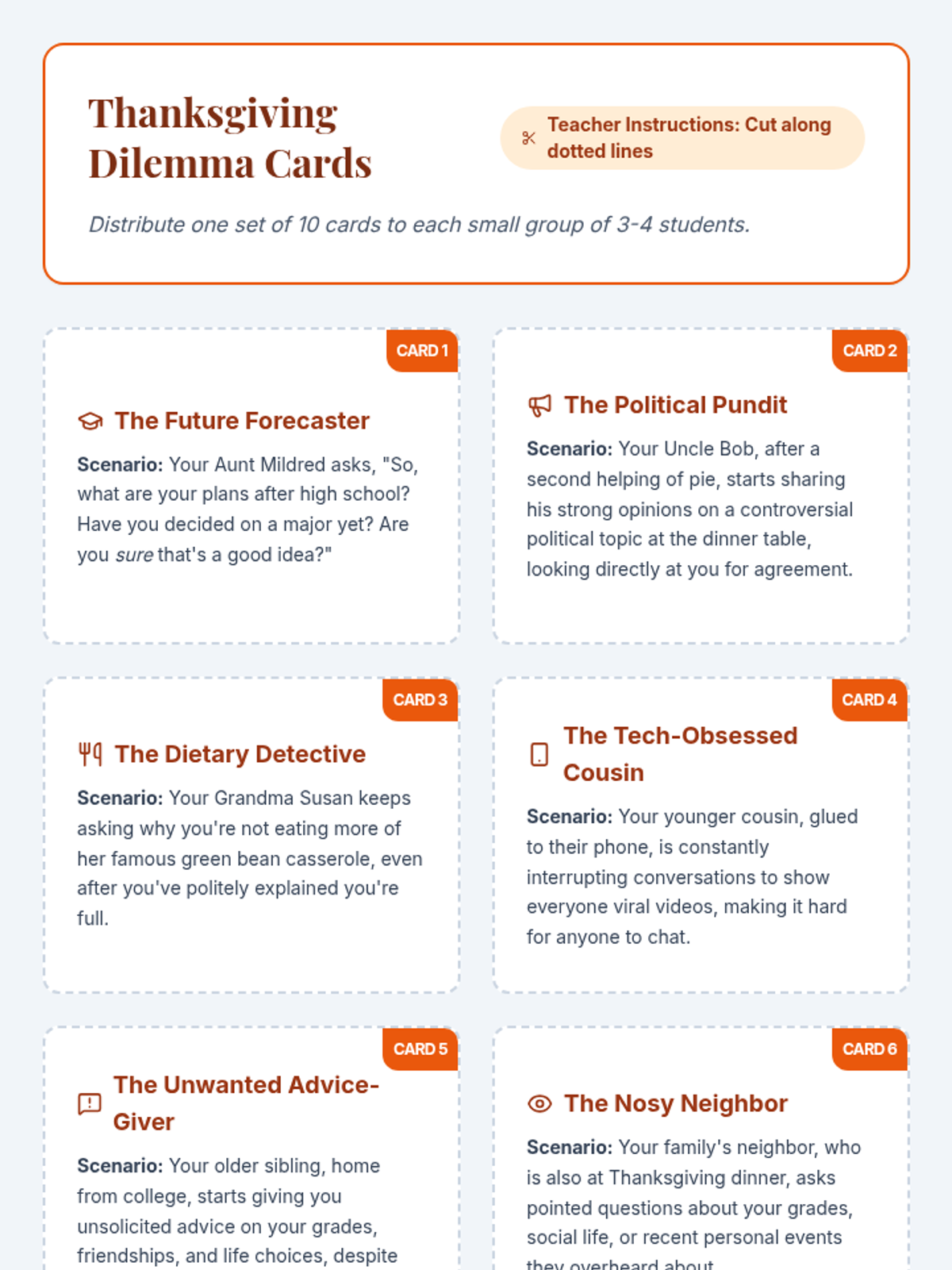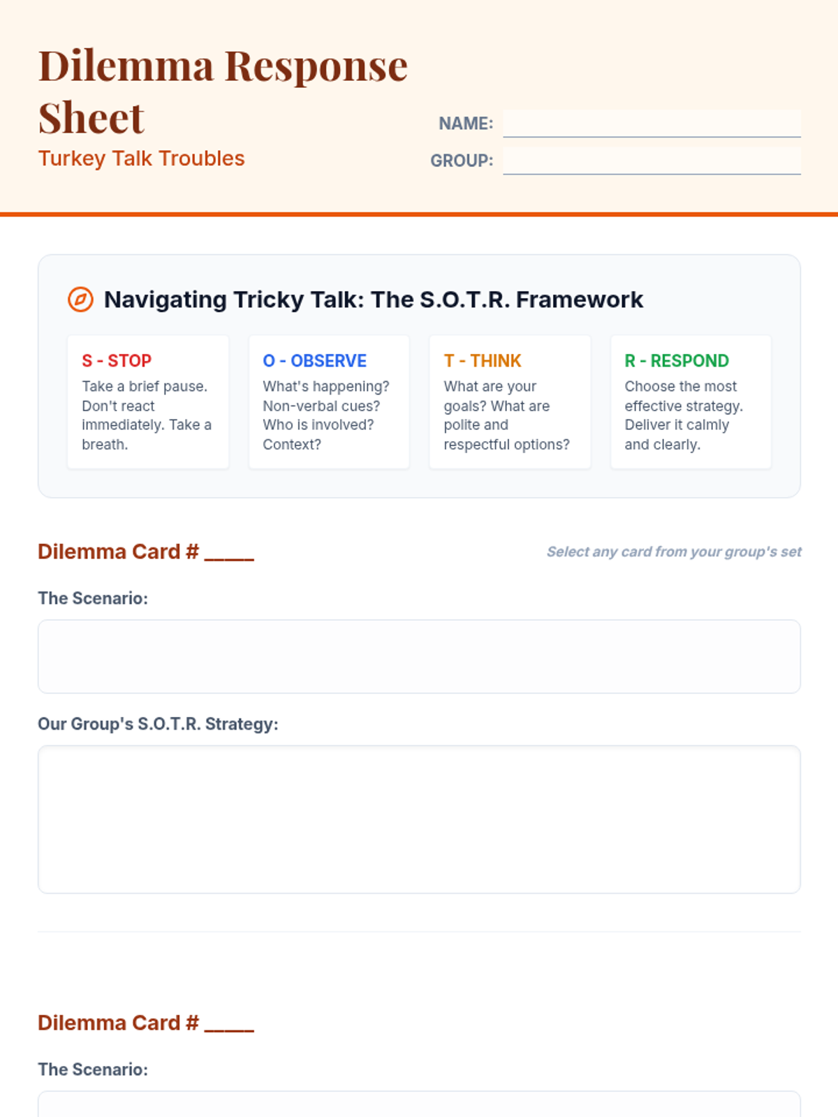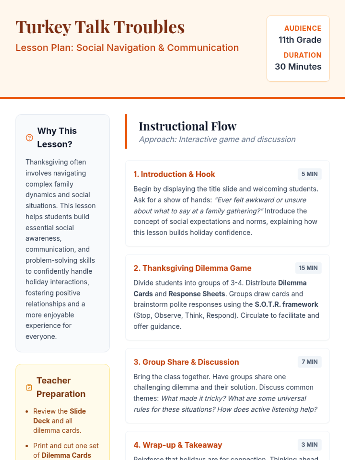 A fun and interactive 30-minute lesson for 11th graders to explore and navigate social expectations and potential pitfalls during Thanksgiving gatherings using the S.O.T.R. framework.